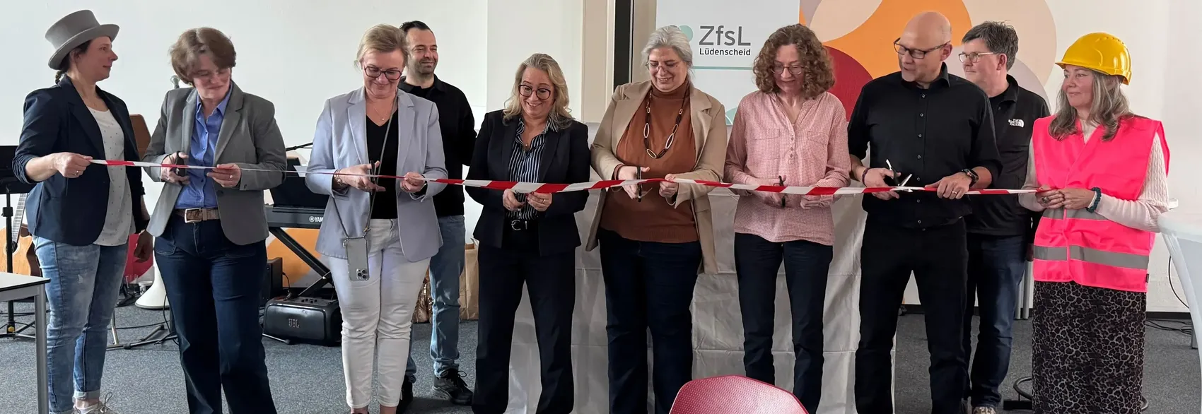 Für eine humorvolle Note sorgte die Q-Gruppe „Kulturelle Bildung“, die die Erlebnisse rund um die Baustelle in einem Sketch verarbeitete. Der feierliche Höhepunkt der Veranstaltung war das Durchschneiden eines Bandes, mit dem der neue Seminarraum offiziell seiner Bestimmung übergeben wurde.