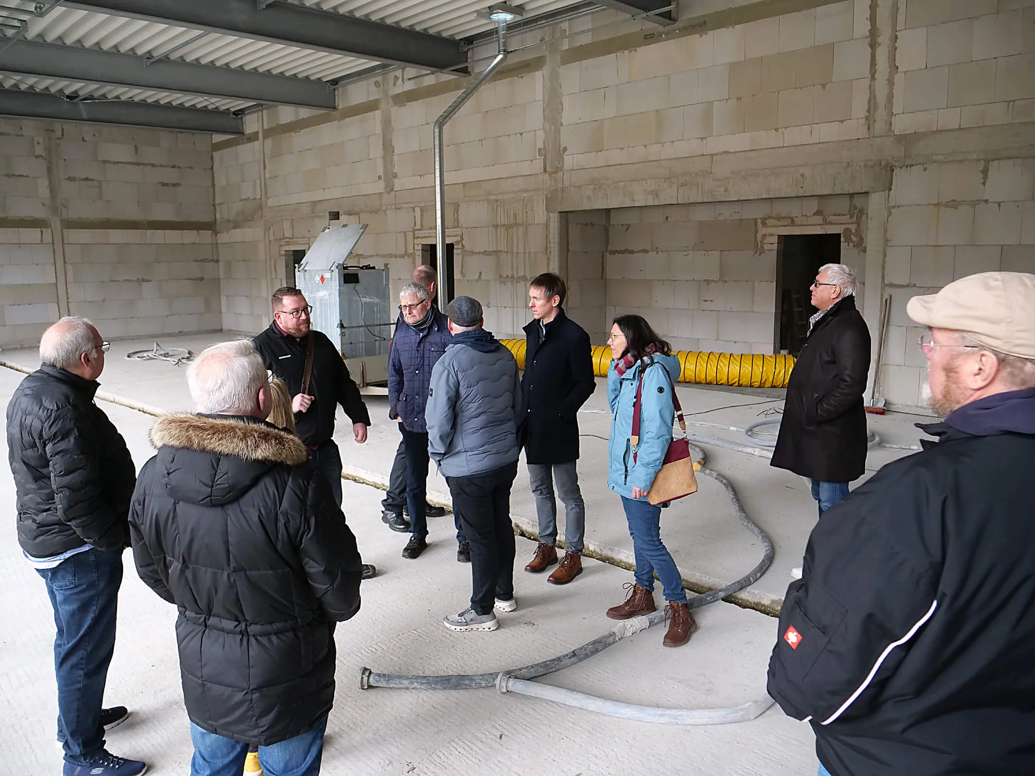 Der Bau- und Planungsausschuss des Plettenberger Stadtrates besichtigte den Neubau und ließ sich von Steffen Paclik von der Stadtverwaltung und Feuerwehrchef Markus Bauckhage führen. Erste Station war die Fahrzeughalle, die Platz für fünf Fahrzeuge bietet und ausreichende Flächen zur Fahrzeug- und Gerätewartung bereitstellt.