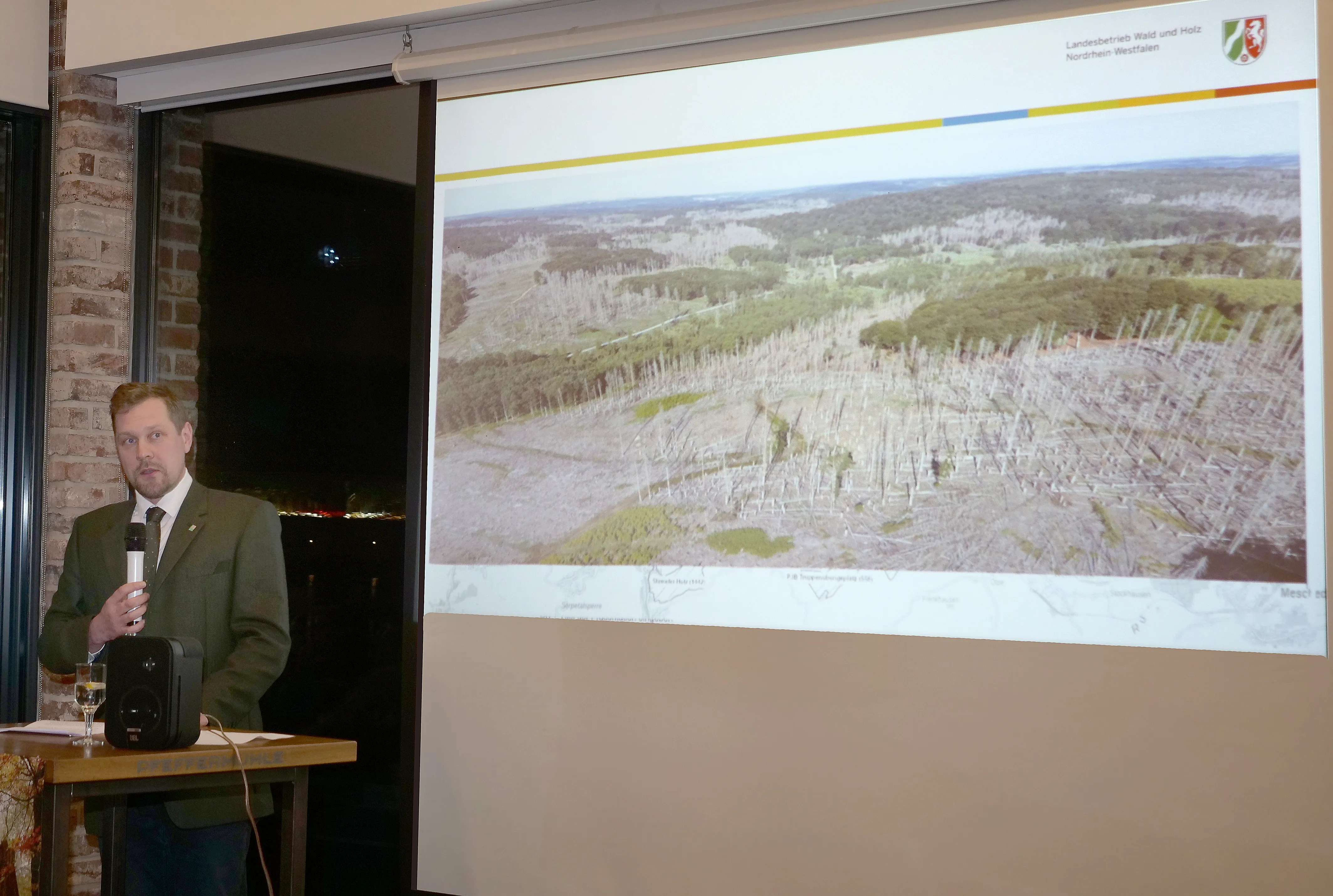 Einer Lage von der Front glich der Bericht des Leiters des Regionalforstamtes Arnsberger Wald, Olaf Ikenmeyer. Er trat auf vor einem weit ins Land schauenden Lichtbild, das eine völlig zerstörte Waldfläche zeigte. Was tun? Deprimiert sein und sich abwenden? Oder Aktivismus um jeden Preis zeigen? Ikenmeyer berichtete von der Zeit nach Kyrill, der ersten richtig großen Kalamität in unserem Mittelgebirge: „Wir haben damals 280 Hektar ohne gelenkte Wiederbewaldung belassen.“ Sprich: Man hoffte, einen neuen Wald, einen natürlichen Wald zu bekommen, wenn man die Notflächen sich selbst überlasse. Das Ergebnis: ernüchternd. „Wir haben alles, aber keinen gesunden Mischwald bekommen. Gewachsen ist eine Dickung aus Fichte, Birke, Lärche und Douglasie.“ Ikenmeyers Fazit: „Nichstun hilft nicht.“ Aus dem Kyrill-Experiment wisse man, dass sich bereits jetzt auf den aktuell abgeholzten Borkenkäferflächen ein Vorwald bilde. „Das Zeitfenster der Freiflächen schließt sich.“