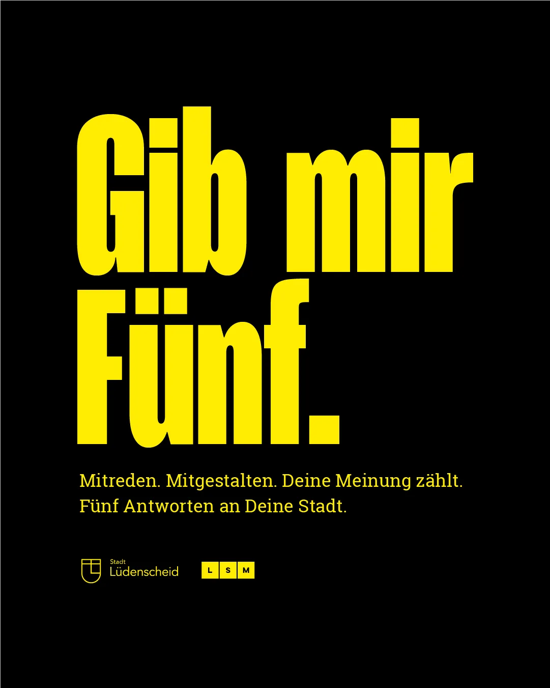 Unter dem Label „Gib mir fünf“ stellen die Stadtverwaltung und das Stadtmarketing jetzt fünf Fragen zu Lüdenscheid. Eine gemeinsame Online-Umfrage läuft noch bis zum 31. Oktober.