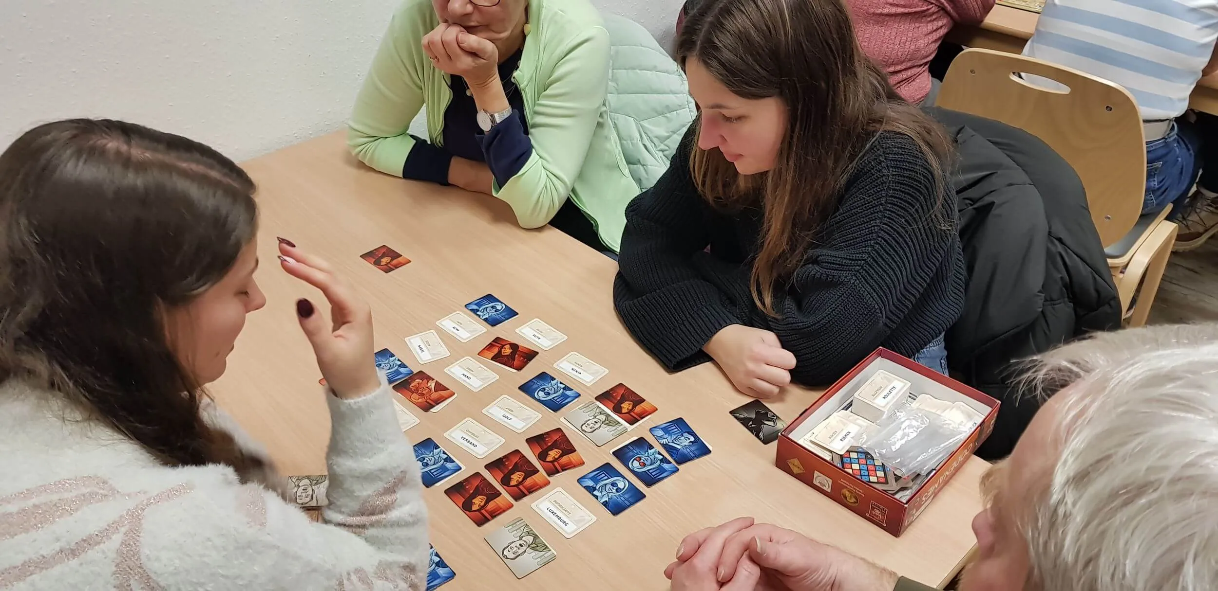 Spiele liegen auf Tischen aus, manche bringen ihre Spiele mit. Gruppen finden sich schnell beim Spiel. Kurz nach uns kommen Maren (26) und Nadine (24). Nadine spielt „gerne in Gemeinschaft“. Maren hatte sie überzeugt, mitzukommen. Sie findet die Spiele toll, freut sich zudem, „dass man Leute jeden Alters trifft“. Mit dabei: eine große Einkaufstasche mit Spielen. Schnell sind wir uns einig, zusammen „Codenames“ zu spielen. Die jungen Frauen erklären kurz das Spiel des Jahres 2016.