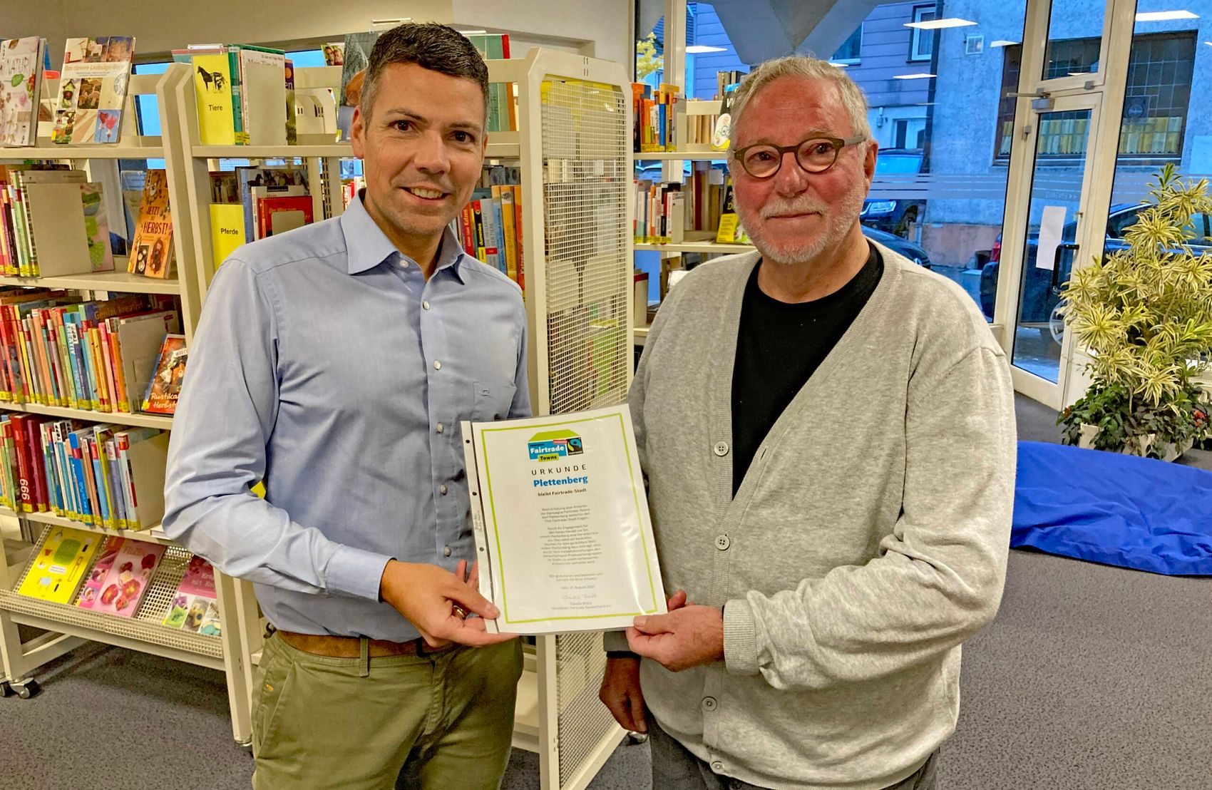 Um die Rezertifizierung offiziell zu machen, wurde die entsprechende Urkunde am vergangenen Freitag (10. November) in der Stadtbücherei durch den Vorsitzenden der Plettenberger Fairtrade-Steuerungsgruppe Heino Büsing an den stellvertretenden Bürgermeister und Ratsherrn Adrian Viteritti übergeben. Viteritti bedankte sich nicht nur für die Urkunde: „Das ehrenamtliche Engagement der Fairtrade-Gruppe ist enorm wichtig und wir sind dankbar, dass Sie dieses Ehrenamt ausüben! Fairer Handel ist unwahrscheinlich wichtig.“