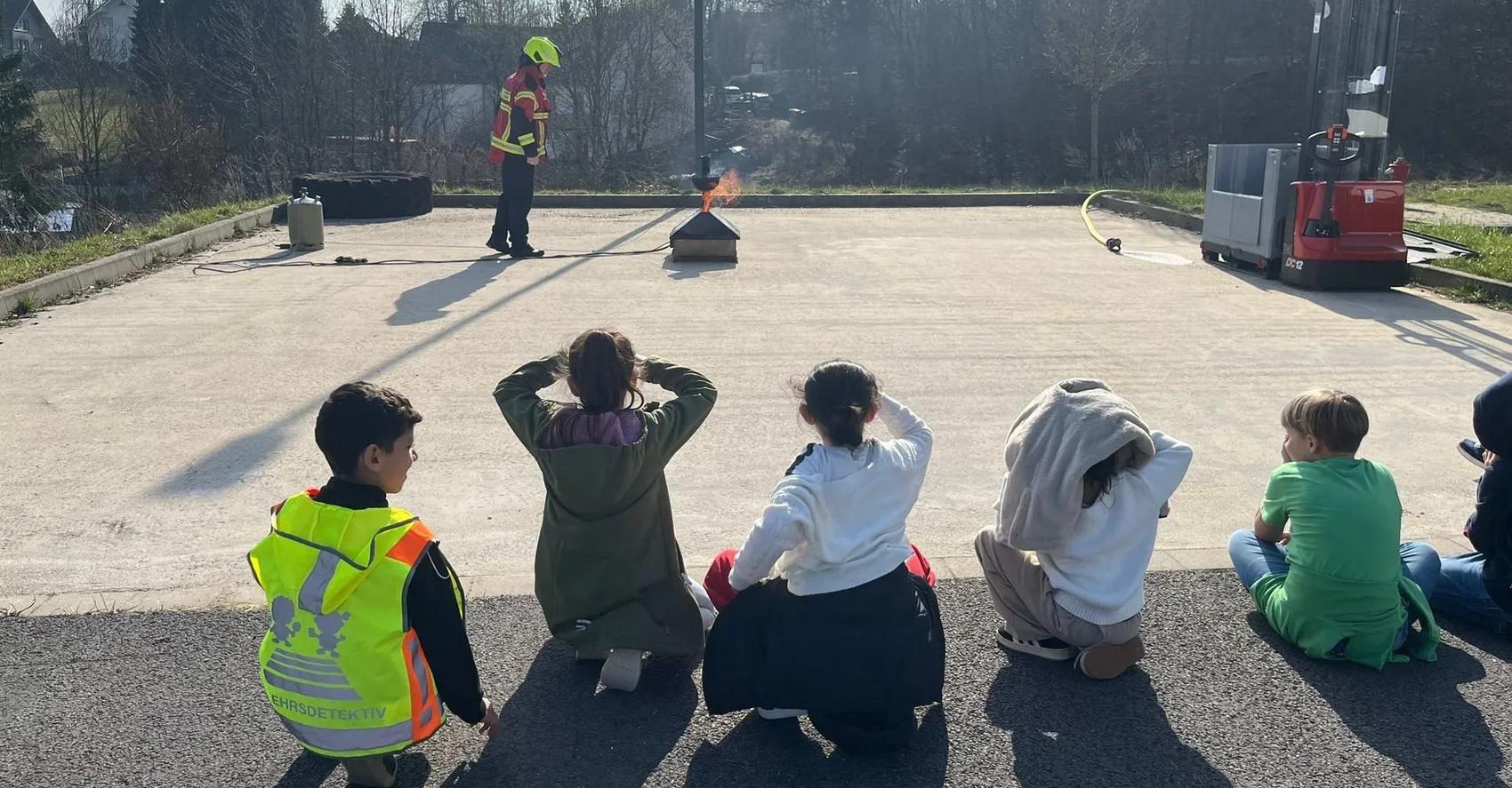 Die Kinder lernten darüber hinaus, wie eine Freiwillige Feuerwehr aufgebaut ist und was im Alarmfall passiert. Zum Abschluss wurde simuliert, was bei einer Fettexplosion passiert und ihnen erklärt, dass ein Brand in der Küche auf keinen Fall mit Wasser gelöscht werden sollte.