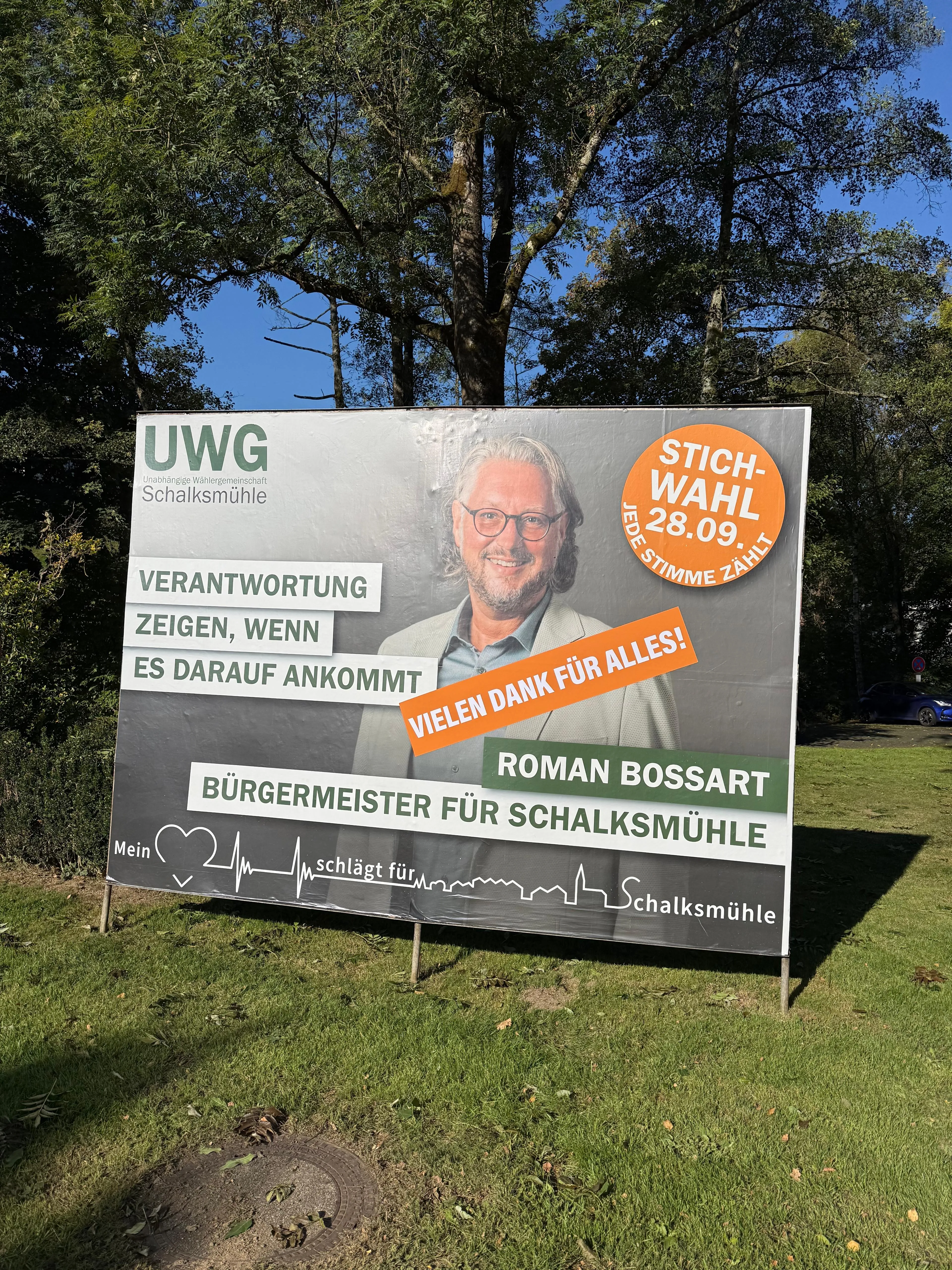 Daher sei es ihm ein Bedürfnis gewesen, sich für jede abgegebene Stimme zu bedanken. Bossart verdeutlichte dies nicht nur durch einen Post in den sozialen Medien, sondern ließ im Nachgang auch noch einen Sticker auf seinen Plakaten anbringen. Die Botschaft darauf lautete: „Vielen Dank für alles.“ „Es war mir ein persönliches Anliegen, meine Dankbarkeit so noch einmal zum Ausdruck zu bringen", erklärt Bossart. Diese empfinde er übrigens nicht nur für die abgegebenen Stimmen, sondern auch für die im Vergleich zu anderen Kommunen hohe Wahlbeteiligung: „Wählen zu dürfen, ist ein Grundrecht, von dem unsere Demokratie lebt. Bedauerlicherweise wird aber gerade bei Kommunalwahlen dieses häufig von den Menschen nicht wahrgenommen. Ich bin froh, dass sich dieses Stimmungsbild in Schalksmühle nicht bestätigt und es so viele Menschen an die Wahlurnen gezogen hat.“