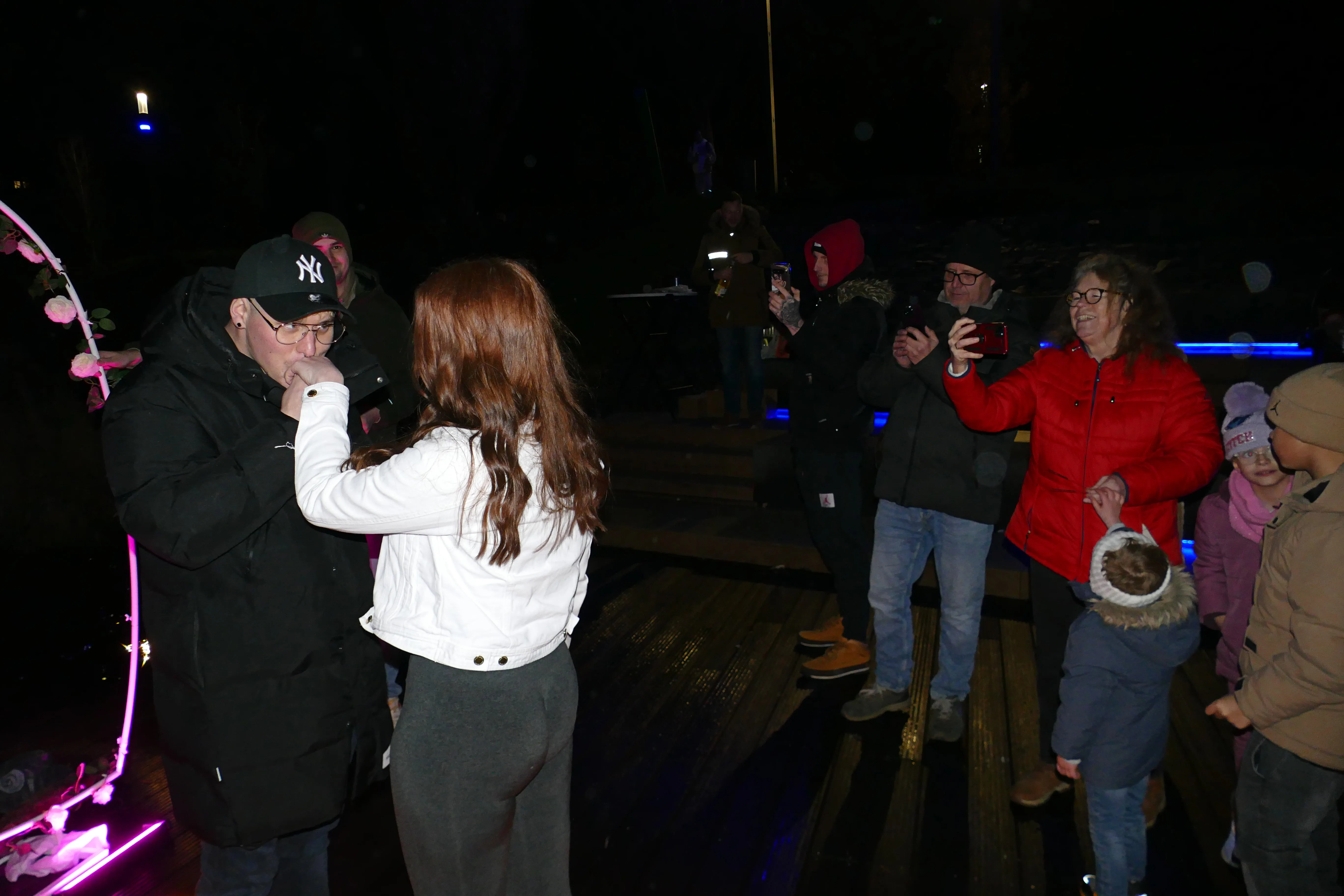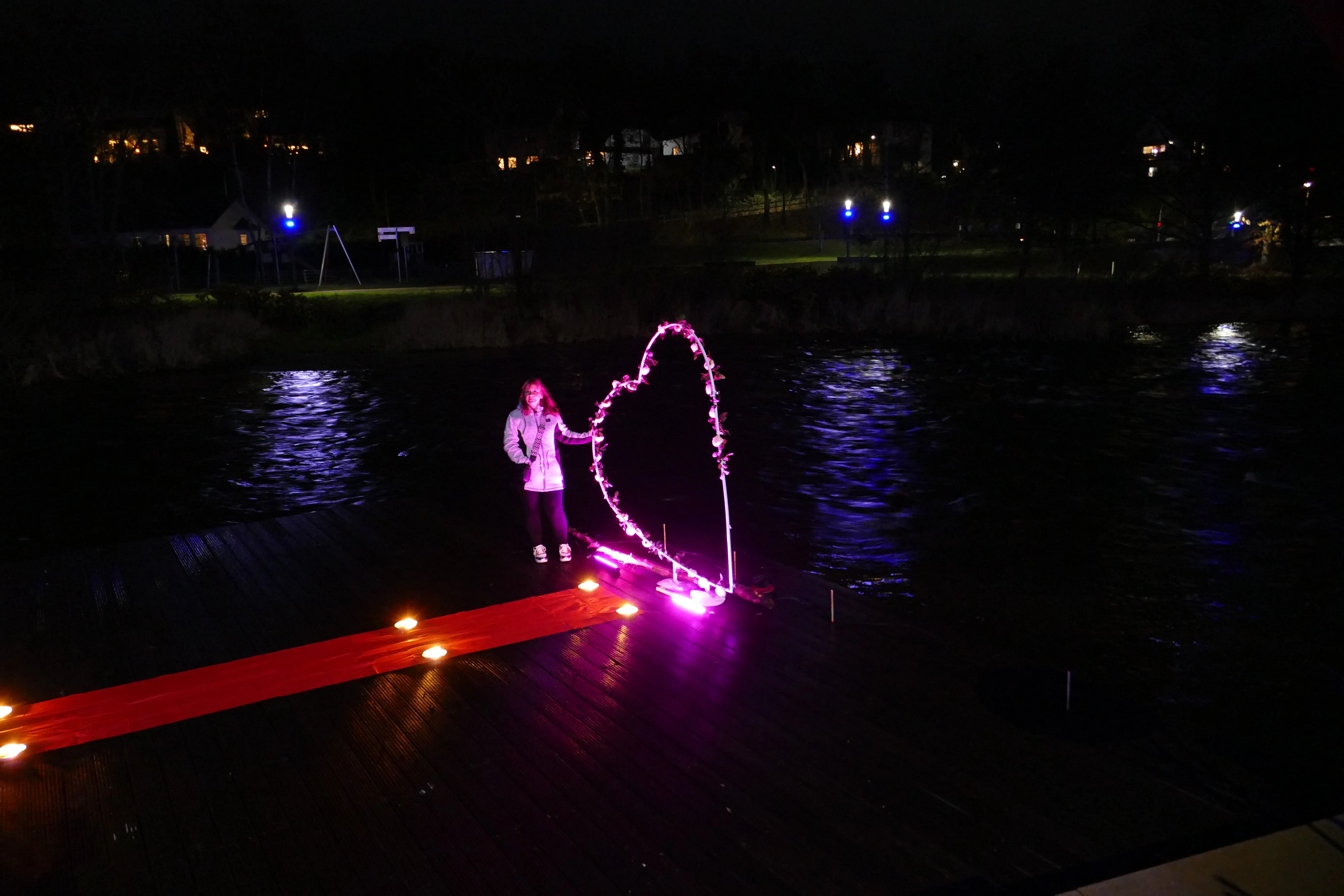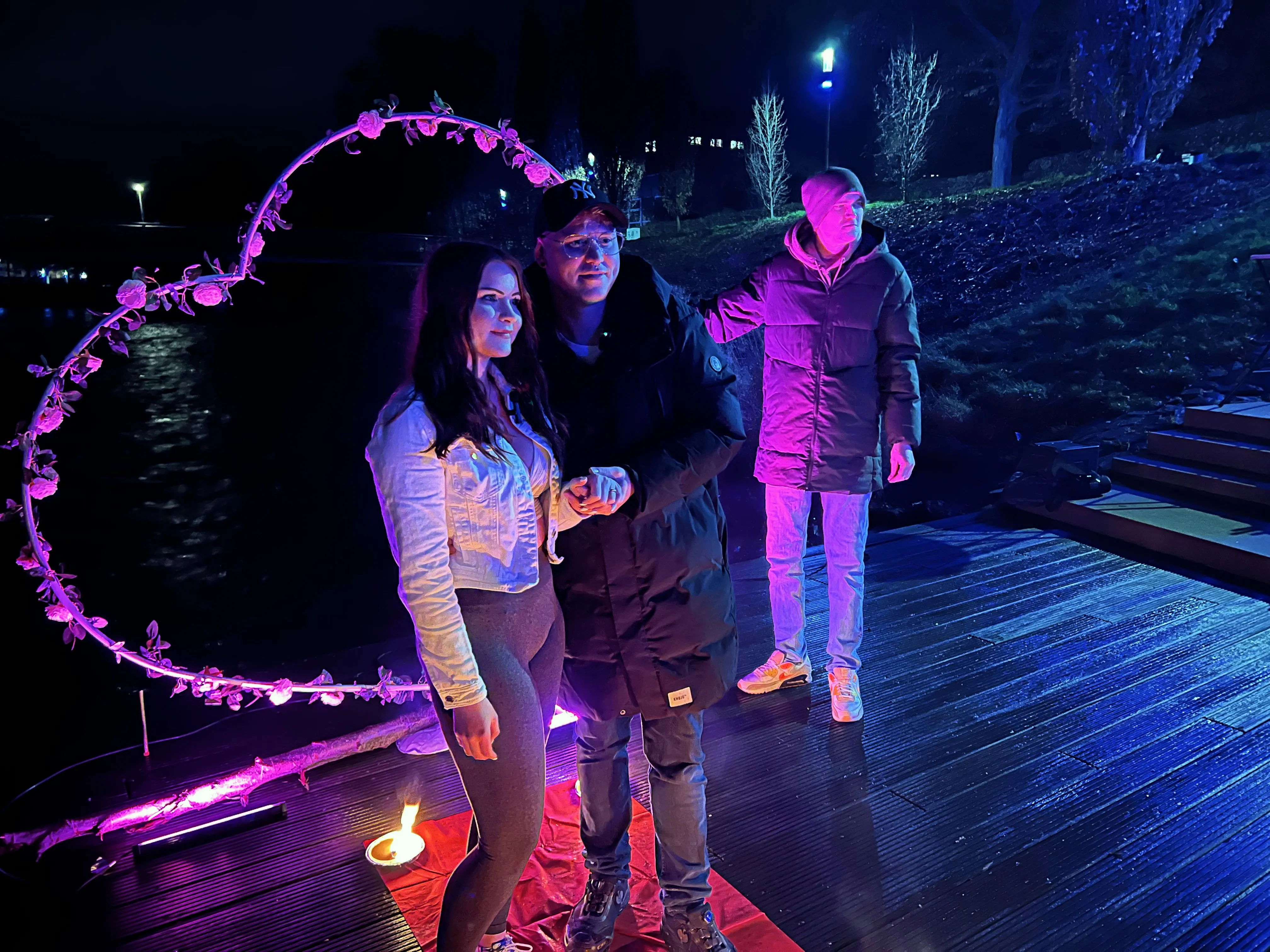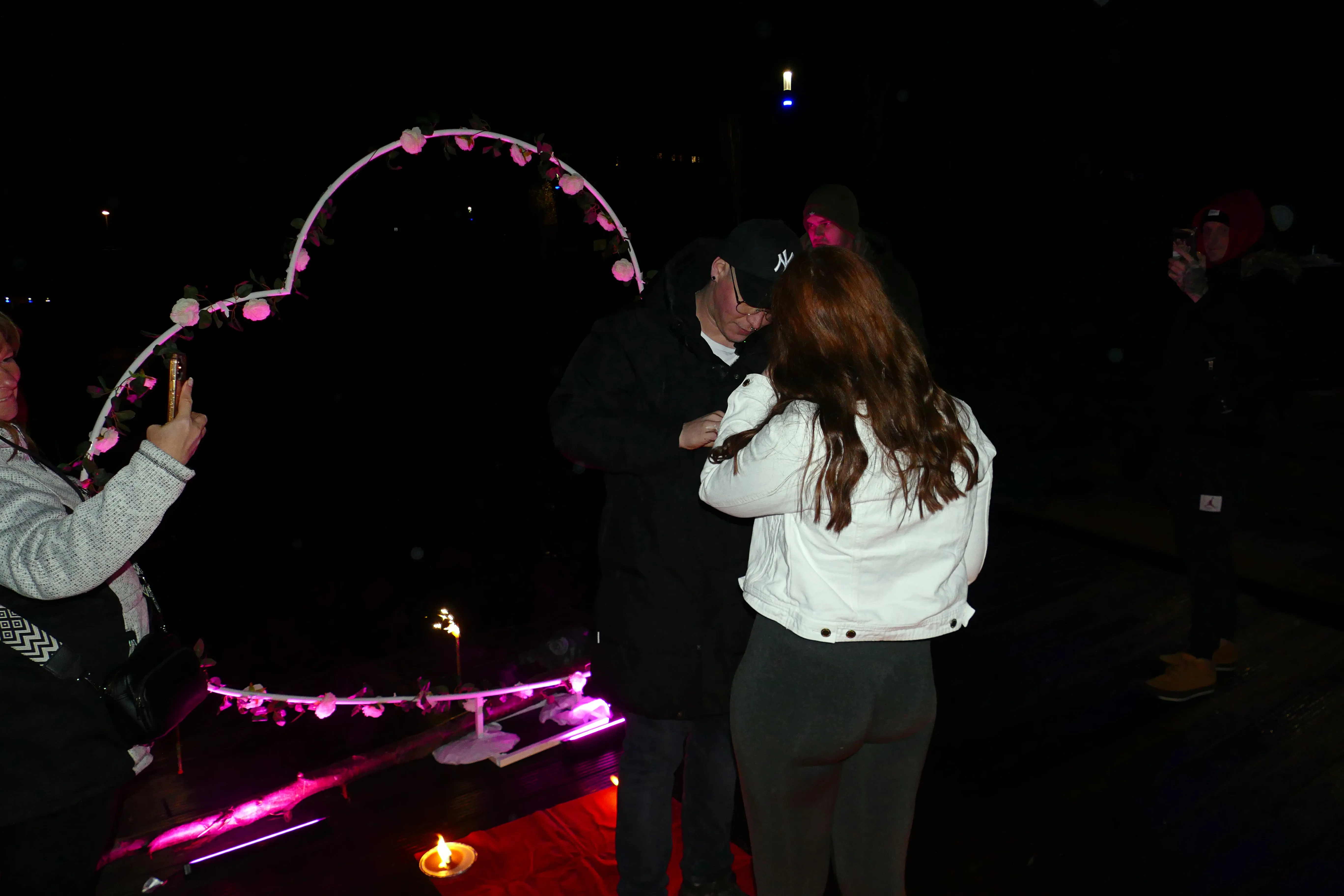 Romantische Musik, roter Teppich, Wunderkerzen und ein illuminiertes Herz – Jonathan Schweitzer hatte am Freitag, 28. November, für ein besonderes Ambiente an der Lenne-Waterkant gesorgt. Das hatte einen guten Grund: Der 29-Jährige machte seiner Freundin Vanessa Wenger den Heiratsantrag.