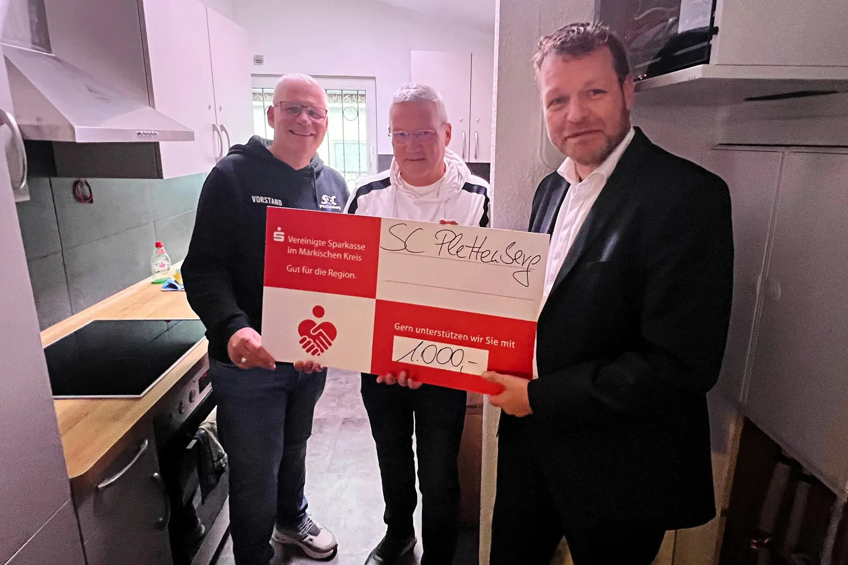 Mit etwa 17.000 Euro beziffert Barnewitz die Kosten. Diesen Betrag konnte der Förderverein auch dank der Unterstützung durch Sponsoren aufbringen. So spendete die Vereinigte Sparkasse im Märkischen Kreis 1000 Euro aus dem Erlös der Sparlotterie der Sparkassen. „Vereine wie der SC Plettenberg leisten einen wichtigen Beitrag zum gesellschaftlichen Leben in unserer Region“, betonte Marktbereichsleiter Michael Dabow bei der Übergabe des symbolischen Spendenschecks. „Es ist uns ein Anliegen, dieses Engagement zu unterstützen.“