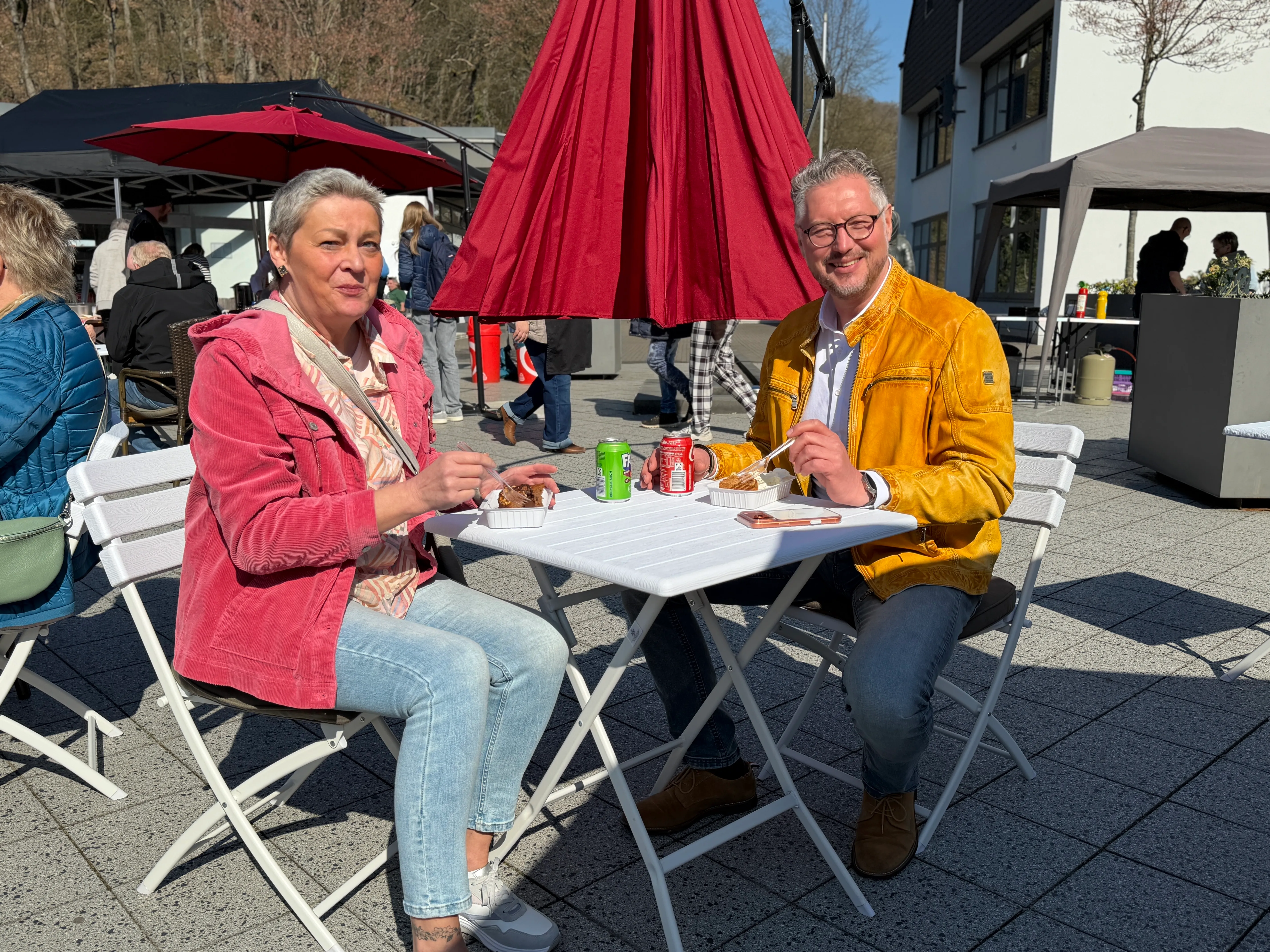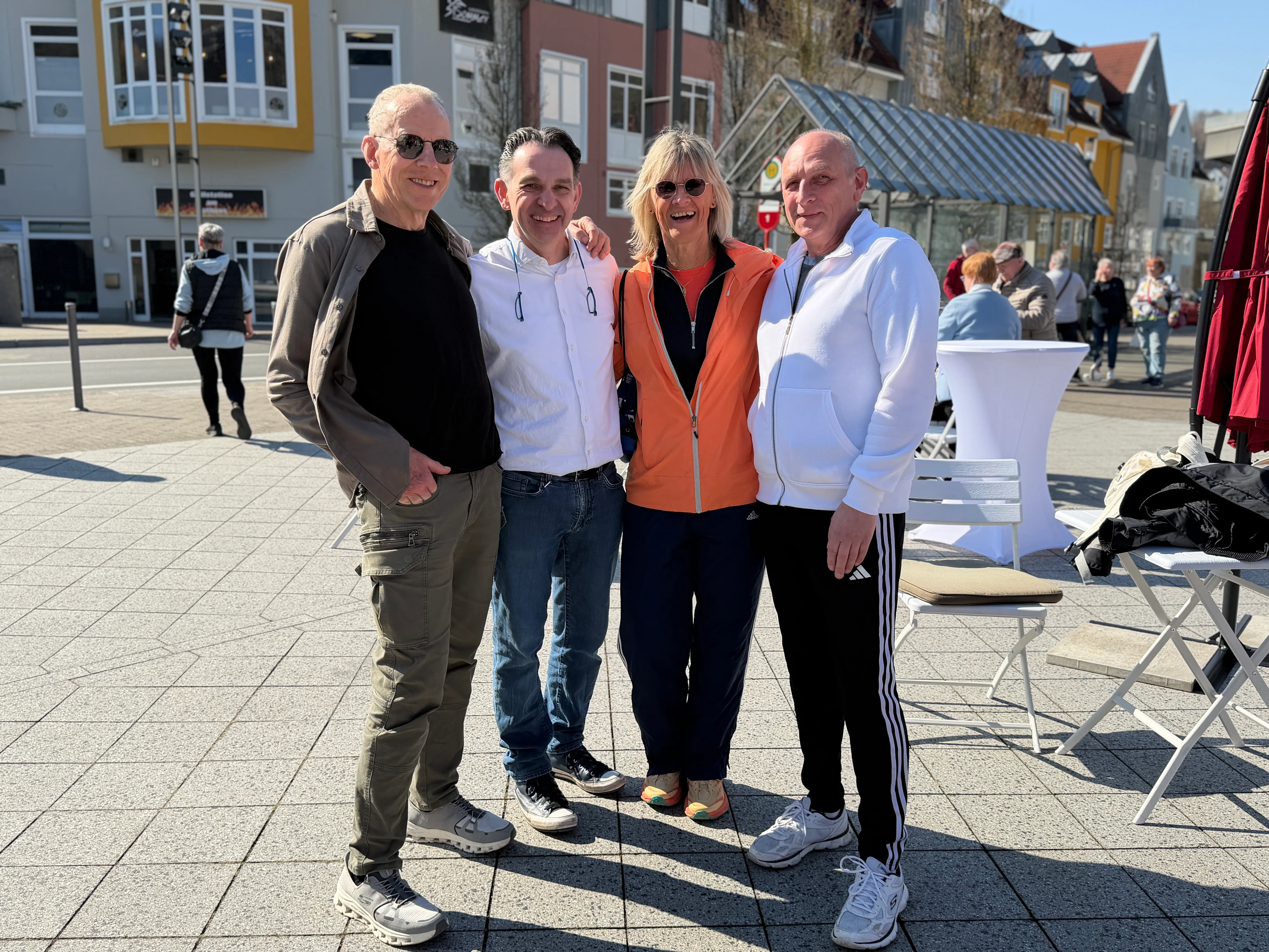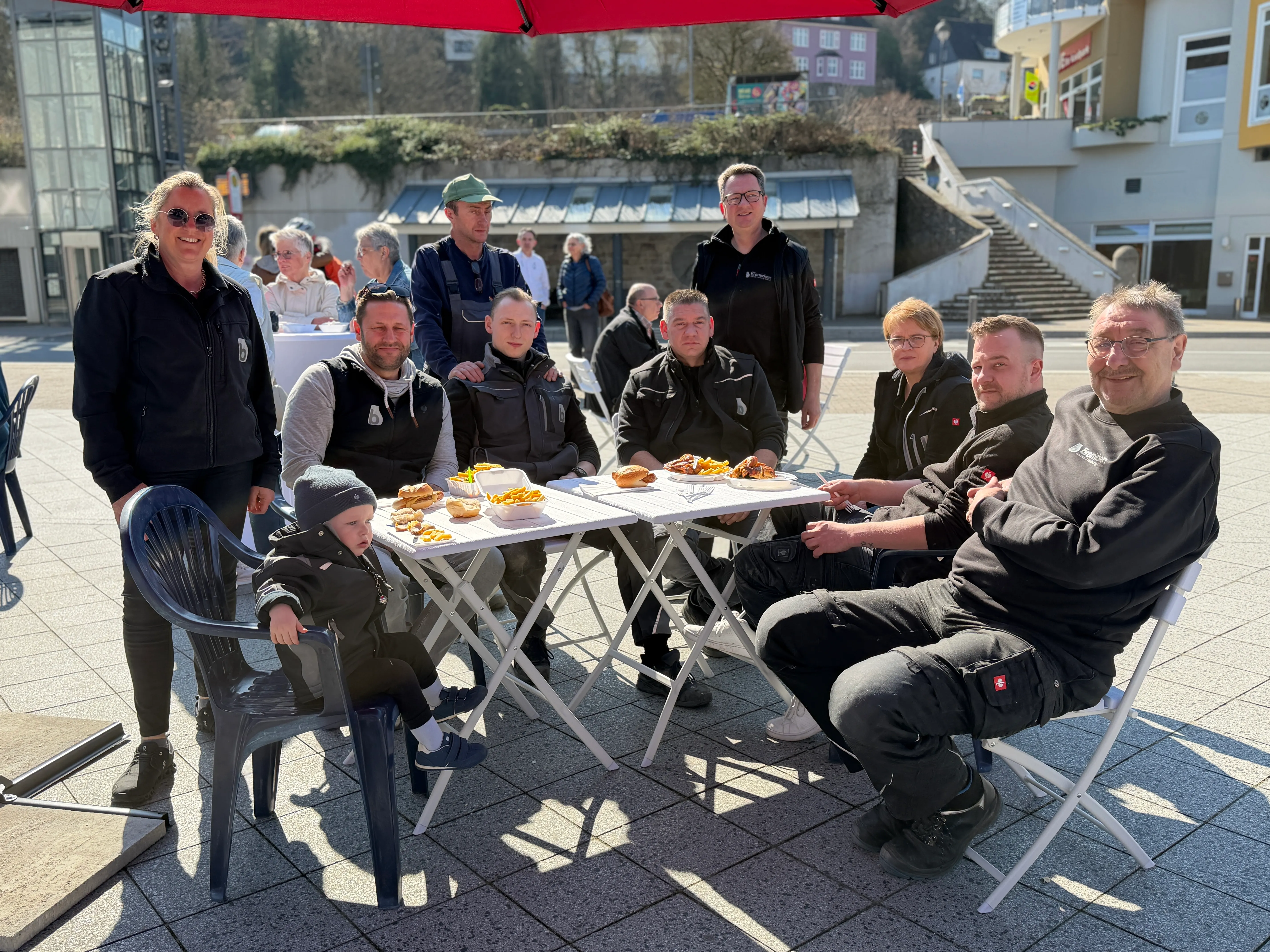 Unter den Gästen auf dem Rathausplatz waren auch zahlreiche Unternehmer aus der Umgebung - unter ihnen Claudia Bremicker vom Schalksmühler Sanitärbetrieb Bremicker. "Um ein Zeichen zu setzen und sowohl die Aktion, aber speziell auch die Händler selbst, zu unterstützen, haben wir heute das gesamte Team zum Mittagessen hierher eingeladen", erklärt sie. "Wir sind ein örtliches Unternehmen, zahlen hier unsere Gewerbesteuer - und freuen uns, wenn das Geld im Ort bleibt."