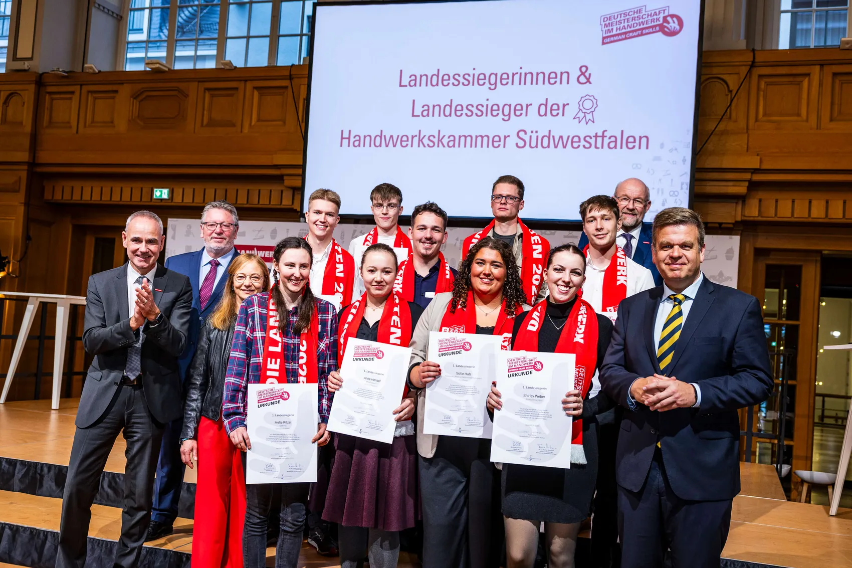 73 junge Handwerkerinnen und Handwerker aus allen sieben NRW-Handwerkskammern sind die Landessieger des Wettbewerbs „Deutsche Meisterschaft im Handwerk - German Craft Skills“ - und elf von ihnen kommen sogar aus Südwestfalen. Die meisten nahmen persönlich an der Abschlussveranstaltung des Westdeutschen Handwerkskammertags (WHKT) im Kasino Leverkusen teil, die von der Handwerkskammer (HWK) zu Köln ausgerichtet wurde. Mit rot-weißen „Landesbesten“- Schals jubelten sie auf der Bühne.
