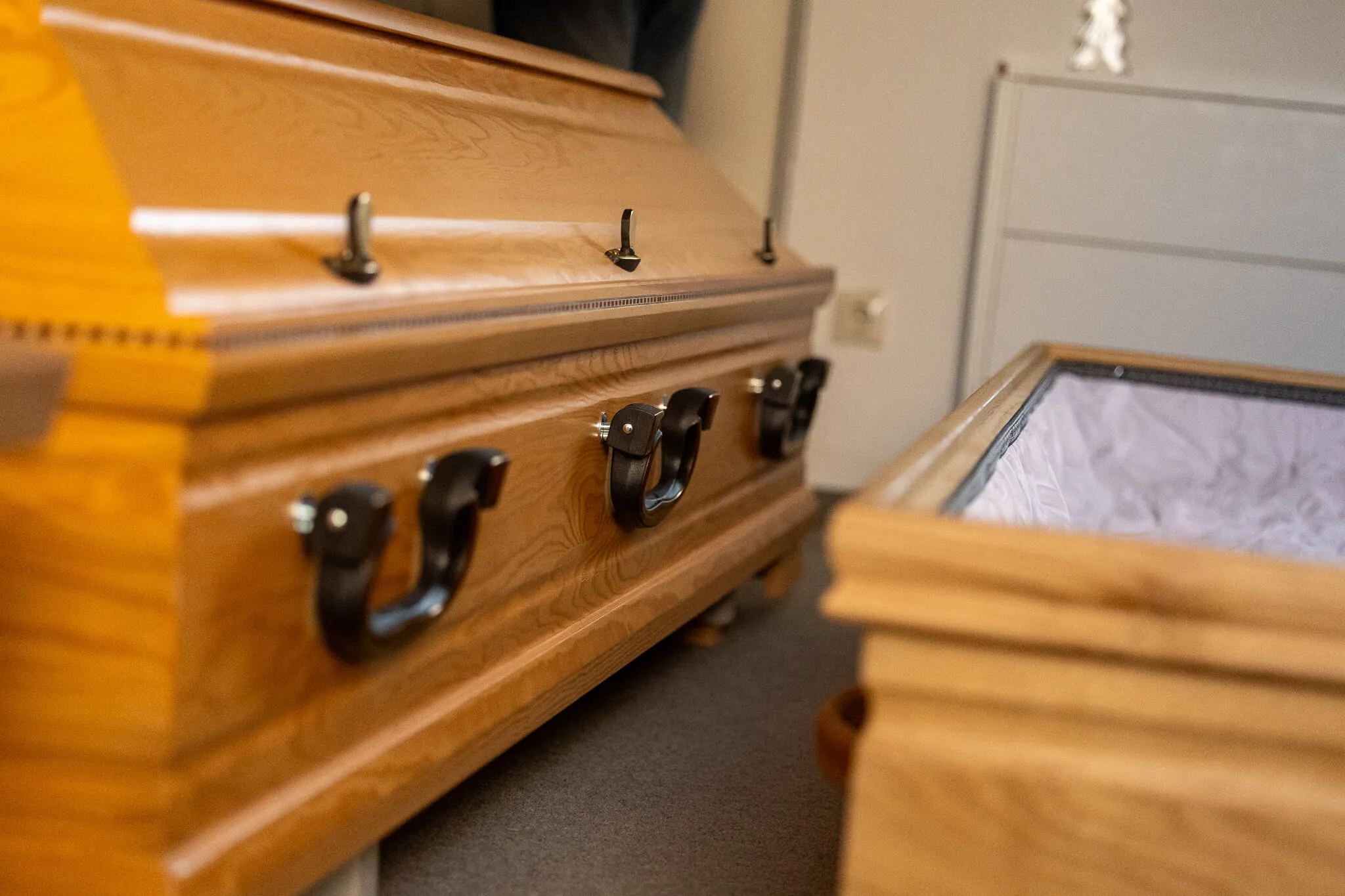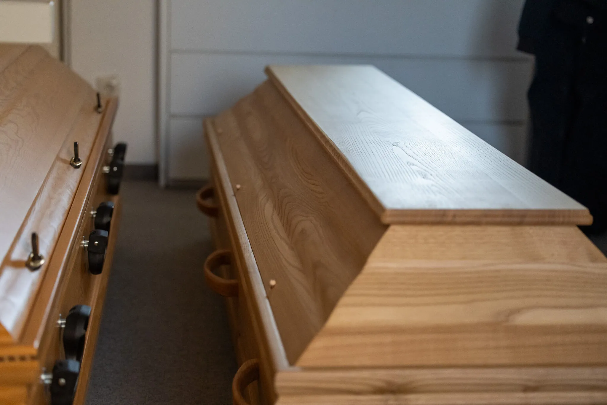 Zum Abschluss unseres Gesprächs — und vielleicht auch, um die durch das Thema "Kindstod" bedrückende Situation zu verlassen — bitten wir Martin Schriever darum, uns ein paar Särge anschauen zu dürfen. Also führt er uns zu einem Raum im Bestattungsinstitut und öffnet die Tür: Zum Vorschein kommen sieben Särge. Die Luft riecht nach Holz. Der Raum ist gefüllt mit Stille.