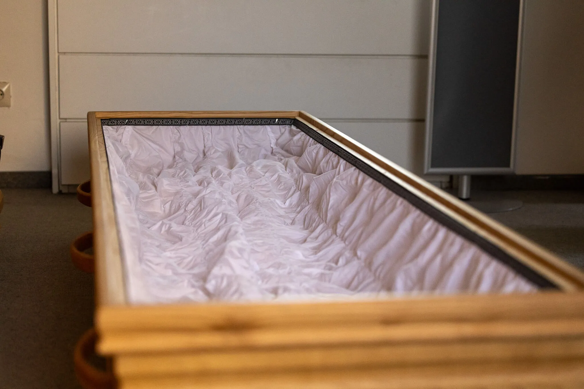 Zwei der Särge zeigt uns Martin Schriever auch von innen. Er hebt den Deckel vorsichtig an. Darunter liegt die Sargmatratze. "Unter der weißen Bespannung, die mit einem schwarzen Lotband gedeckt, befindet sich eine Füllung aus Spänen", erklärt er und als er mit der Hand über das etwas höher gelegene Kopfteil der Matratze fährt, raschelt es leise.