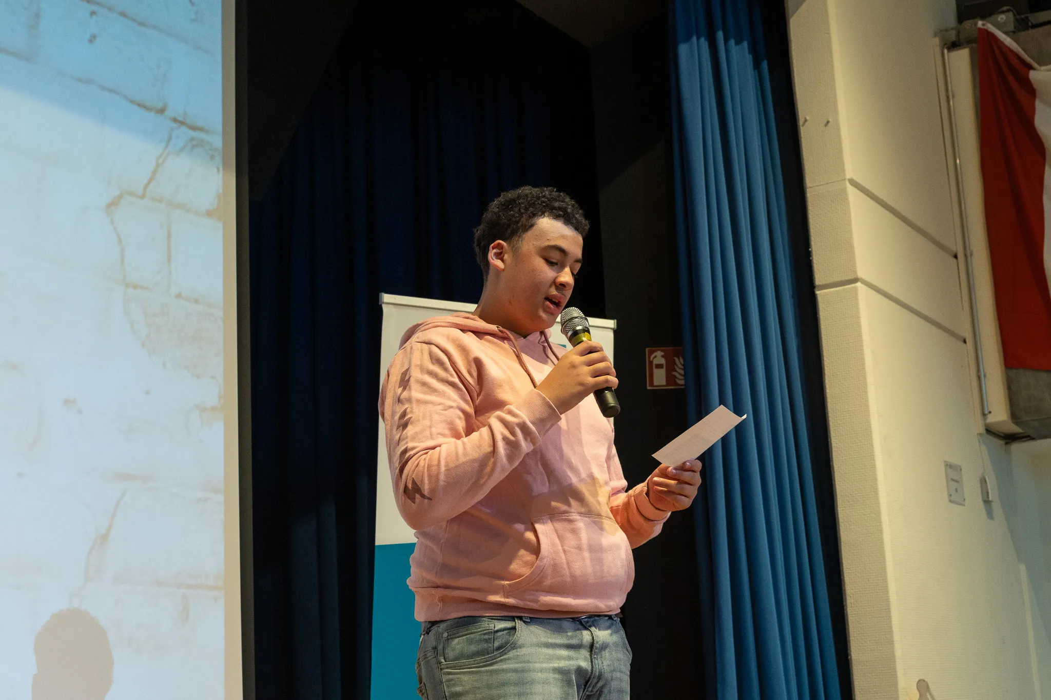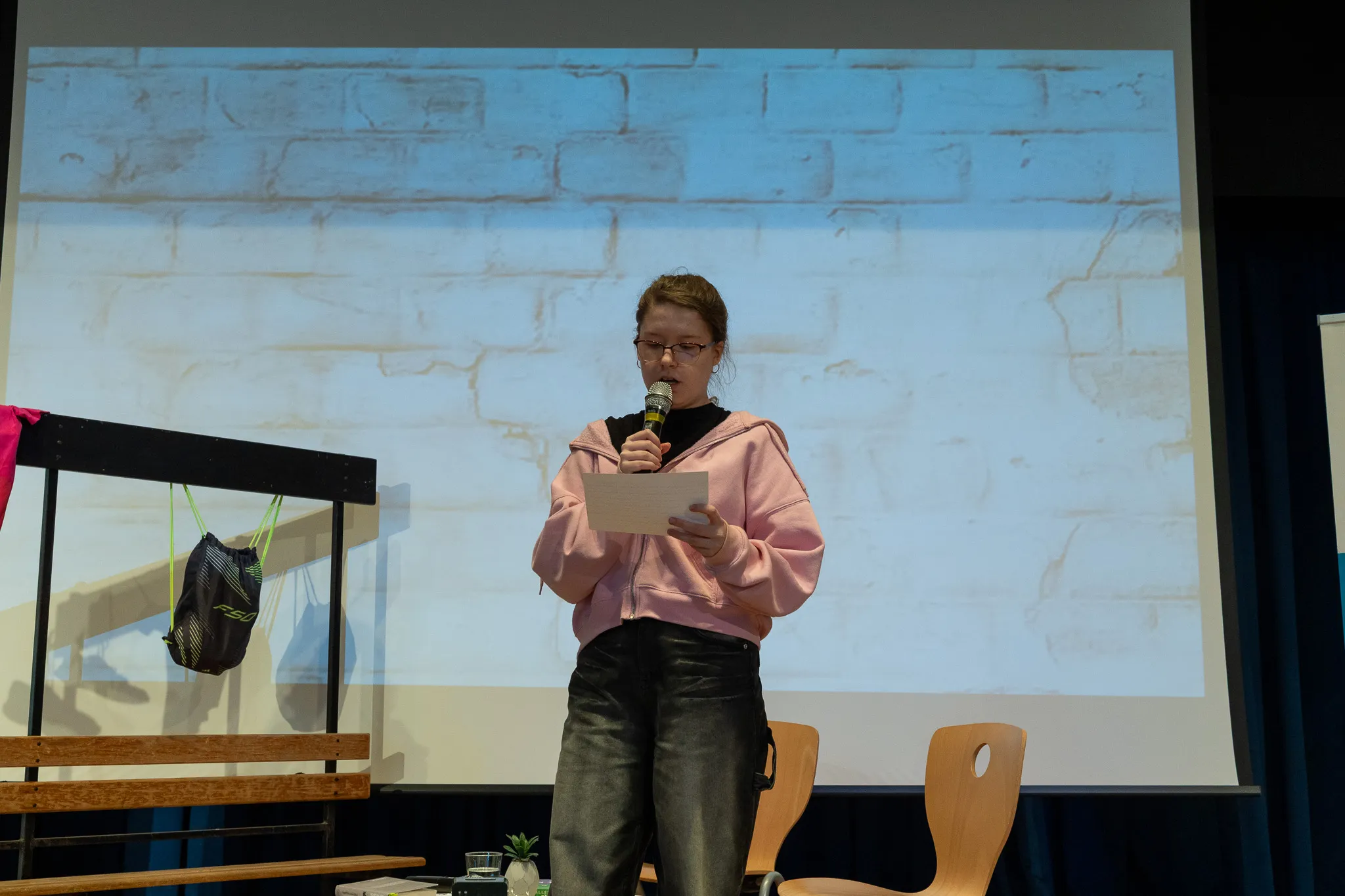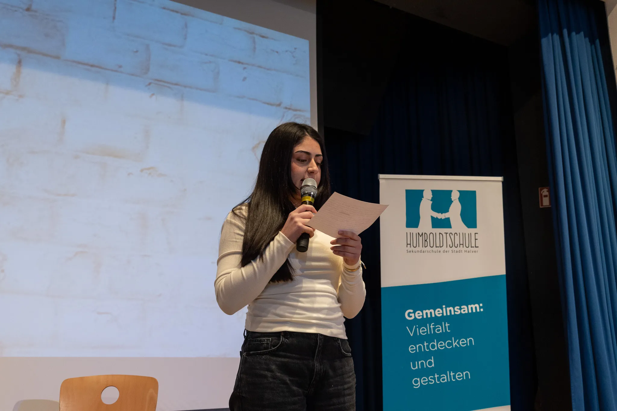 Als die Lesung beendet war, überprüften die Mitglieder der Lerngruppe, ob denn auch alle aufgepasst hatten. Sie stellten inhaltliche Fragen zum Buch und gaben dem Publikum drei Antwortmöglichkeiten. Bei der richtigen Antwort wurde das Publikum gebeten aufzustehen.