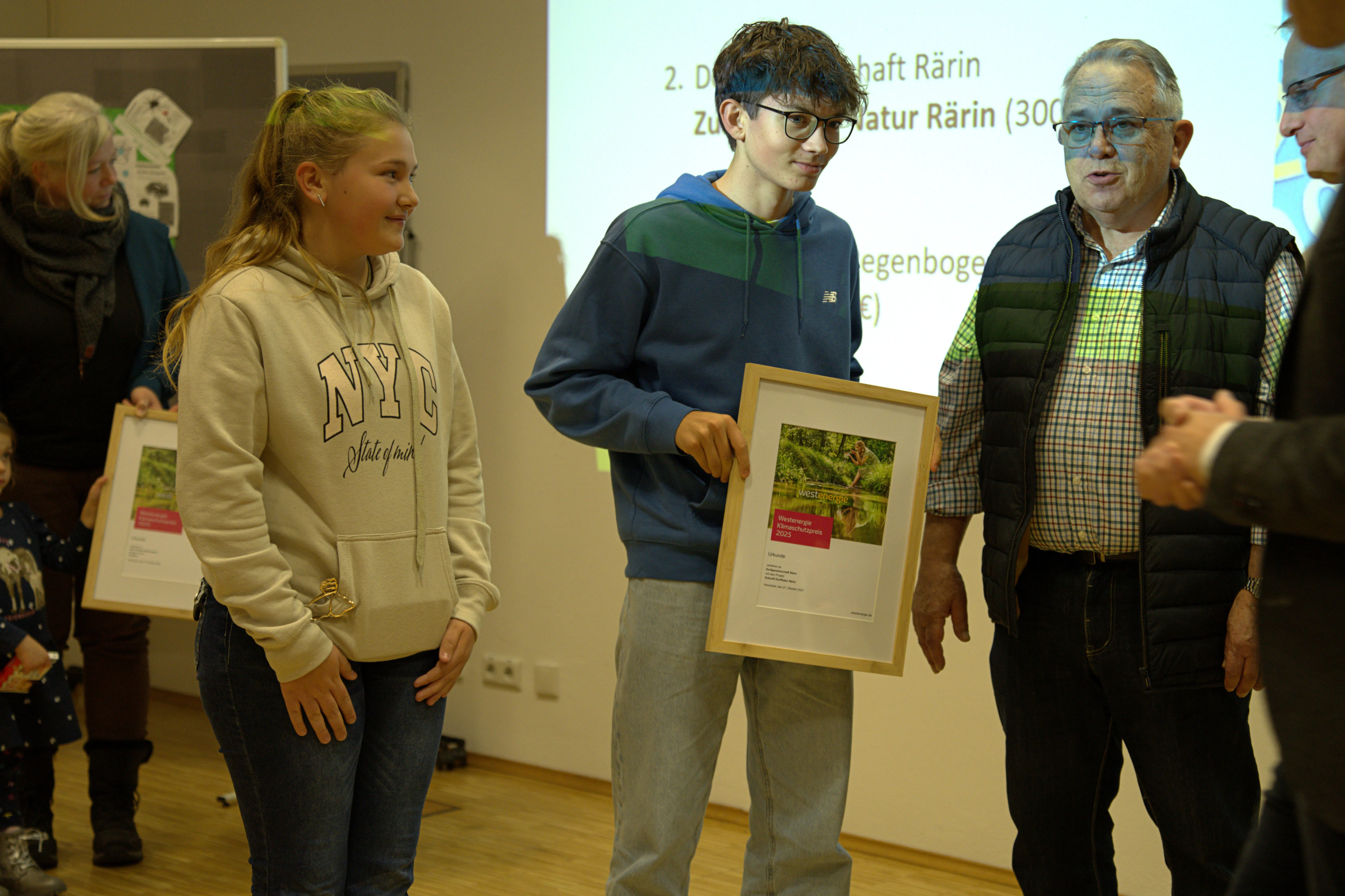 Über den zweiten Platz freute sich die Dorfgemeinschaft Rärin. Gerd Holthaus erläuterte unterhaltsam die verfolgten Projekte. Am Feuerwehrgerätehaus wurde mit viel Erfolg eine Lehmpfütze erstellt, die darauf ausgerichtet ist, Schwalben einen entsprechenden Platz zur Sammlung ihres Nistmaterials zu bieten. Es wurden selbst Baumsetzlinge gezüchtet, da man sich von eigenen Züchtungen eine höhere Resistenz gegen Verbiss erhofft. Am Osterfeuerplatz wurde eine Blumenwiese angelegt und der alte Feuerlöschteich wurde kurzerhand aufgestaut, um Amphibien einen weiteren Lebensraum zu bieten. Auch nachtaktive Lebewesen wurden bedacht, die Dorfgemeinschaft brachte im Dorf verteilt Fledermauskästen an, die bereits nach kurzer Zeit bewohnt waren.