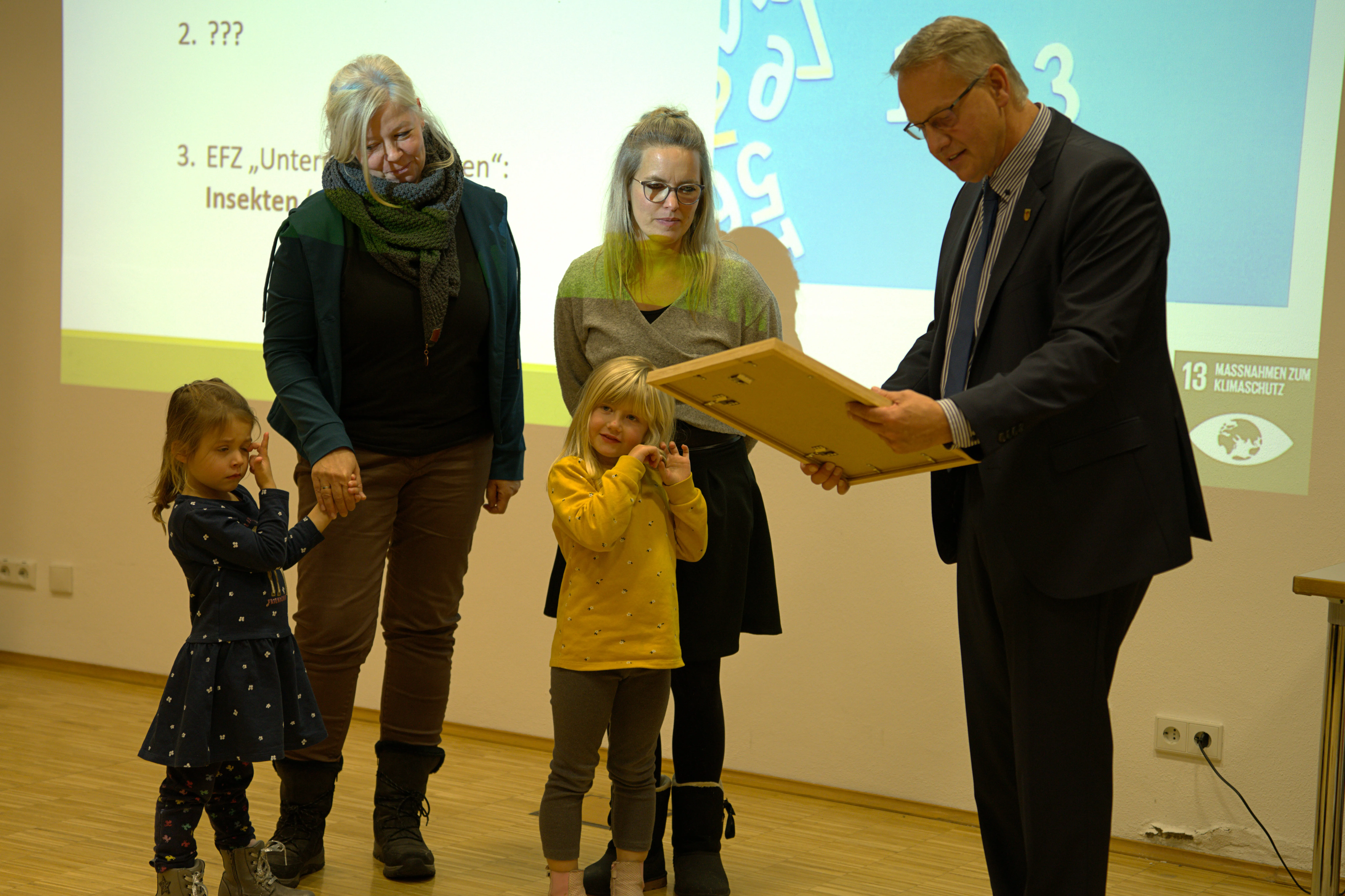 Den dritten Platz sicherte sich das evangelische Familienzentrum „Unterm Regenbogen“. Grundlage ihres eingereichten Projektes war die Neugier der Kinder auf Insekten, hier insbesondere Spinnen und Schmetterlingsraupen. Insekten wurden gefangen, beobachtet und erklärt. Spielerisch wurden hierbei den Kindern Scheu und Furcht vor den krabbelnden Kleintieren genommen und ihnen die entsprechenden Erfahrungen ermöglicht.