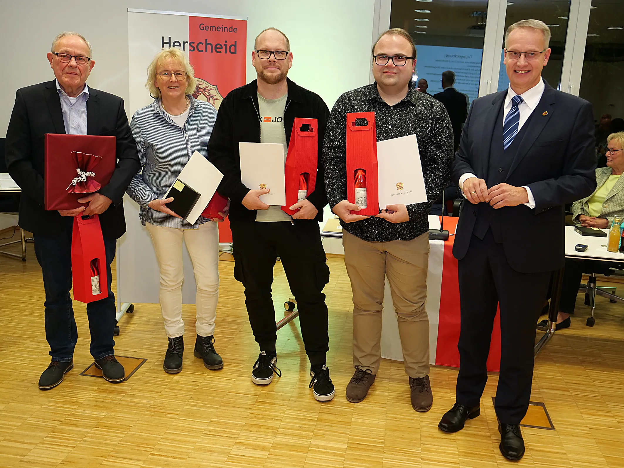 Des Weiteren wurden drei Herscheider Politiker und eine Politikerin geehrt, die aus dem Rat ausgeschieden sind. Fünf Wahlperioden gehörte Peter Reinhardt (SPD) dem Gemeinderat an; er schied mit dem Ende der Legislatur aus. Bürgermeister Uwe Schmalenbach zollte dem Sozialdemokraten größten Respekt und würdigte dessen großes Engagement, das auch und vor allem im Rechnungsprüfungsausschuss zu Tage getreten war. Diesem Gremium hatte Reinhardt seit 1999 ununterbrochen angehört und war dessen Vorsitzender seit 2011. Er habe die Zahlen stets im Kopf gehabt und sei überaus gut vorbereitet gewesen, lobte Schmalenbach, nannte ihn mit gebührendem Schalk „Mister Rechnungsprüfung“. Reinhardt war bereits früher mit der Goldenen Ehrenplakette bedacht worden; nun gab es erhielt zum Abschied ein Präsent.