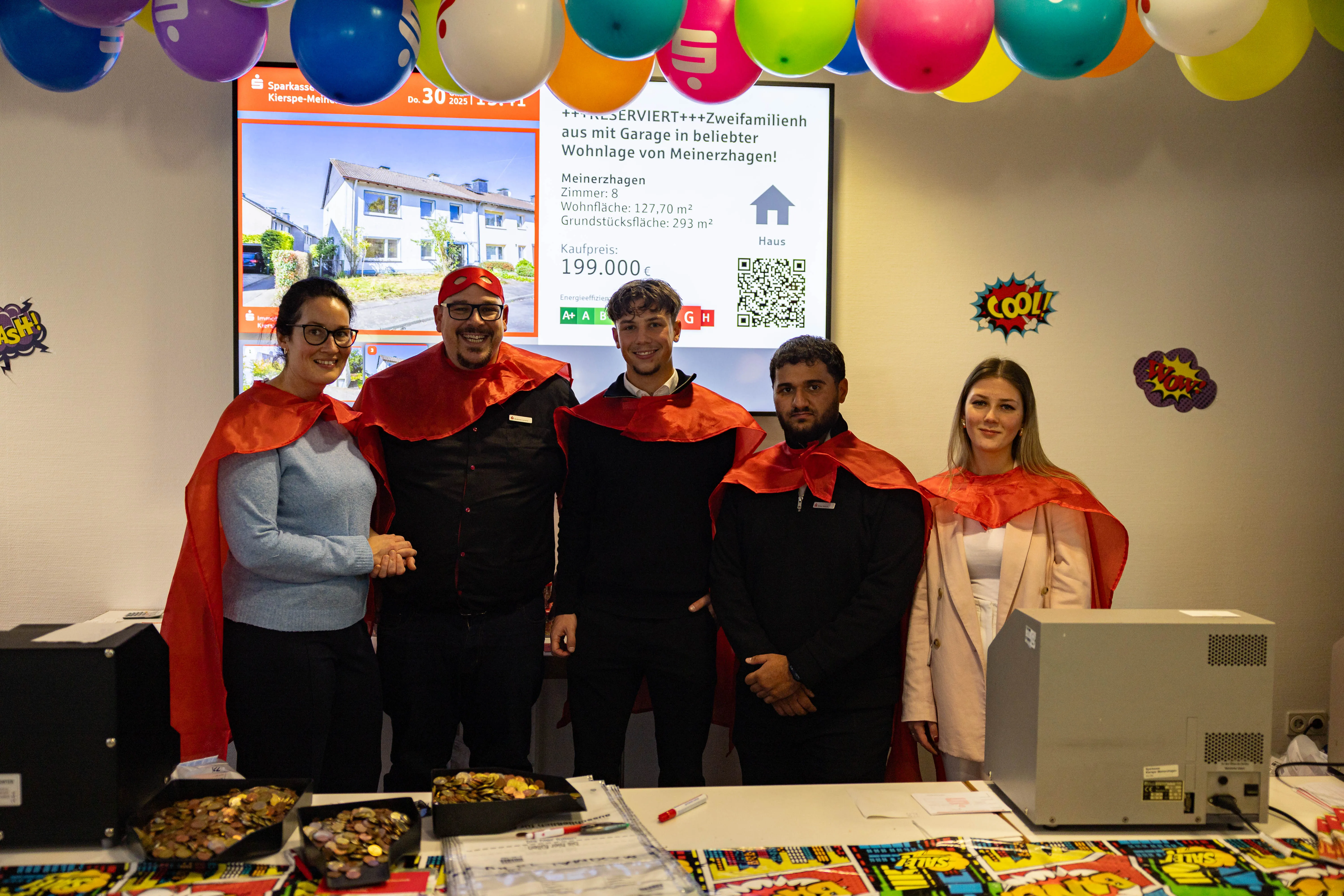 400 Meter weiter in der Sparkasse war die große Halle ebenfalls üppig geschmückt - jedoch mit zahlreichen Ballons statt mit Girlanden. In den beiden Hauptstellen der Sparkasse Kierspe-Meinerzhagen waren die Spar-Helden zu Gast. Hier ist die Leitfarbe der Helden das bekannte Sparkassen-Rot.