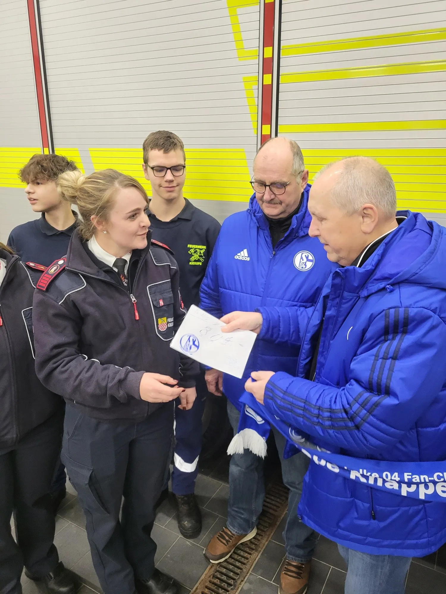 Klaus Müller und Uwe Deuschle, die beiden Vorsitzenden des Vereins, überreichten die Spende im Gerätehaus. Beide betonten wie wichtig sie die Nachwuchsarbeit der Feuerwehr finden und dass es eine große Freude sei, dass die Summe so groß ist. Passend sei auch, dass die Spendenübergabe mit dem Start der 2. Liga in die Rückrunde zusammenfiel.