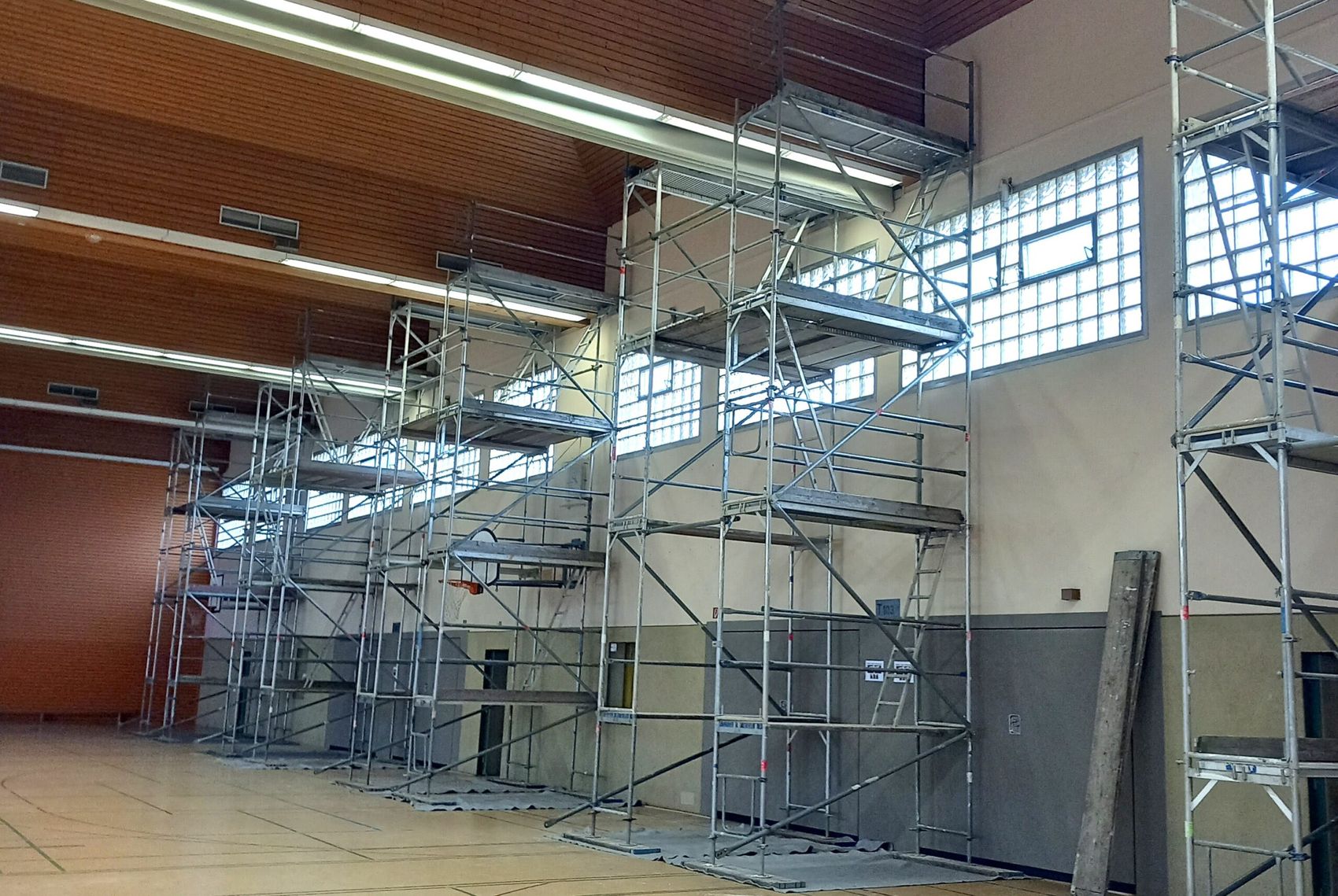 Um die Wasserschäden und ihre Auswirkungen beurteilen zu können, muss zunächst die Verkleidung der Dachkonstruktion abmontiert werden. Auch Beleuchtung und Heizung müssen vorübergehend abgebaut werden. Diese Arbeiten, für die an mehreren Stellen Gerüste zum Einsatz kommen, laufen bereits. In der kommenden Woche wird ein Gutachter die Holzbeschaffenheit im Bereich der Auflagerpunkte einer eingehenden Prüfung unterziehen und mit Bohrungen Materialproben nehmen, die anschließend in einem Labor analysiert werden. Die entscheidende Frage dabei: Wie stark hat das eingetretene Wasser die Beschaffenheit des Leimbinders angegriffen und die Tragfähigkeit der Dachkonstruktion beschädigt?