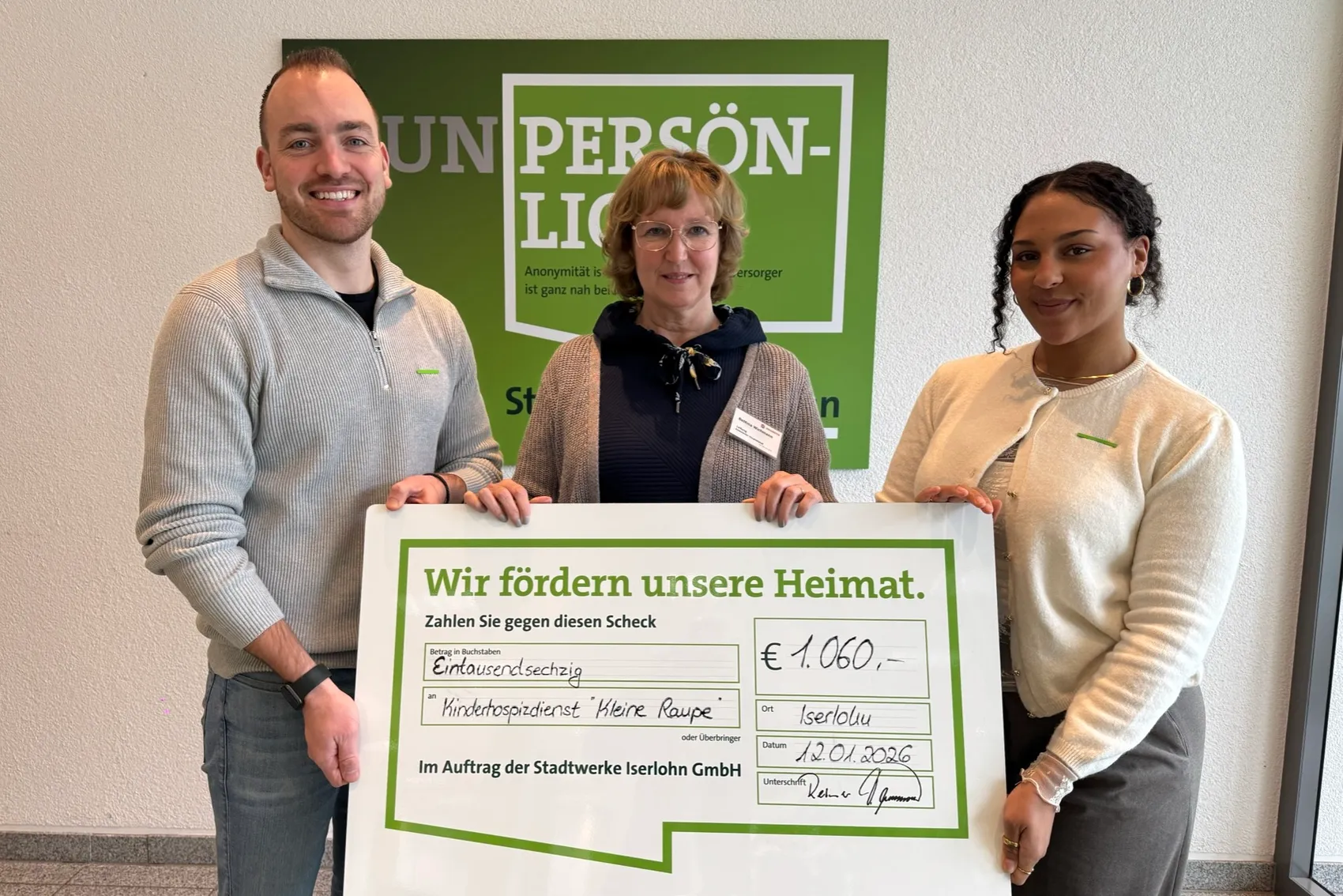 Im Rahmen ihrer diesjährigen Weihnachtsfeier haben die Mitarbeitenden der Stadtwerke Iserlohn nicht nur gemeinsam gefeiert, sondern auch Gutes getan: Bei einer Spendenaktion des Heimatversorgers wurden insgesamt 1060 Euro für das Kinderhospiz „Kleine Raupe“ gesammelt.
