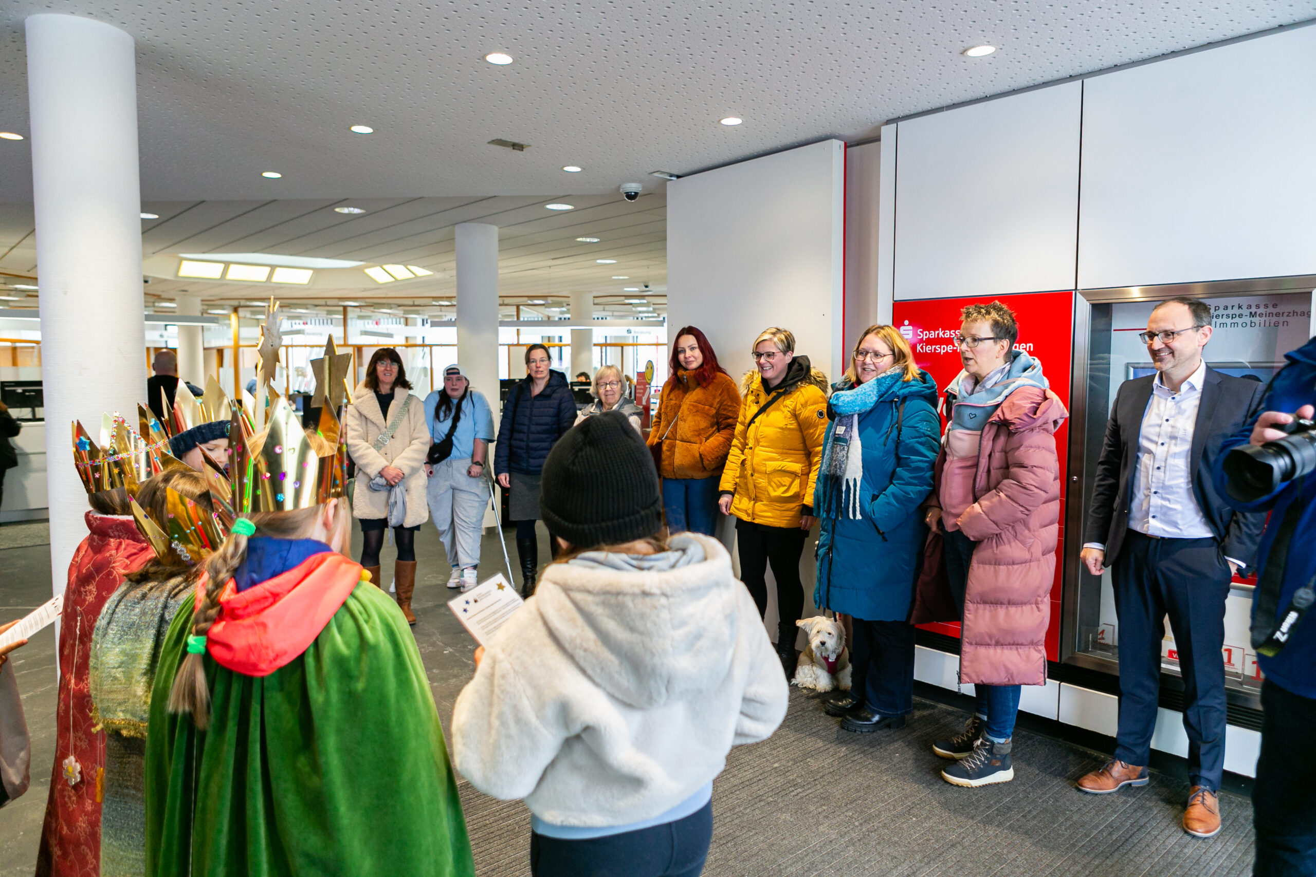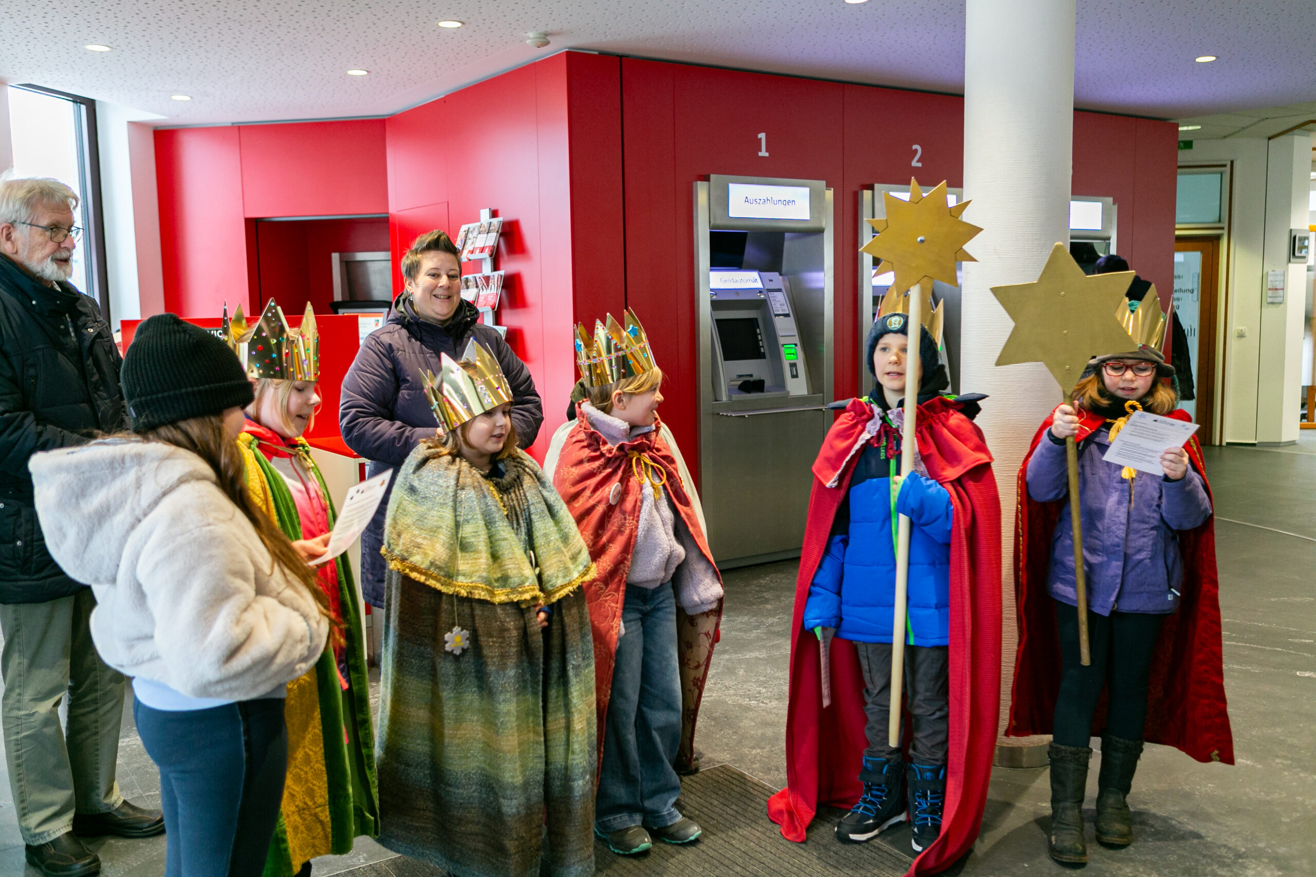 Dafür darf natürlich auch der Gesangspart der Kinder nicht fehlen: „Wir kommen daher aus dem Morgenland“ sangen die Kinder im Foyer des Geldinstitutes für Mitarbeiter, Kunden und Eltern. Vorstandsmitglied Thorsten Rath freute sich, die Sternsinger erneut bei sich im Haus begrüßen zu dürfen und betonte die Wichtigkeit der Aktion, gerade im Hinblick auf das diesjährige Motto.
