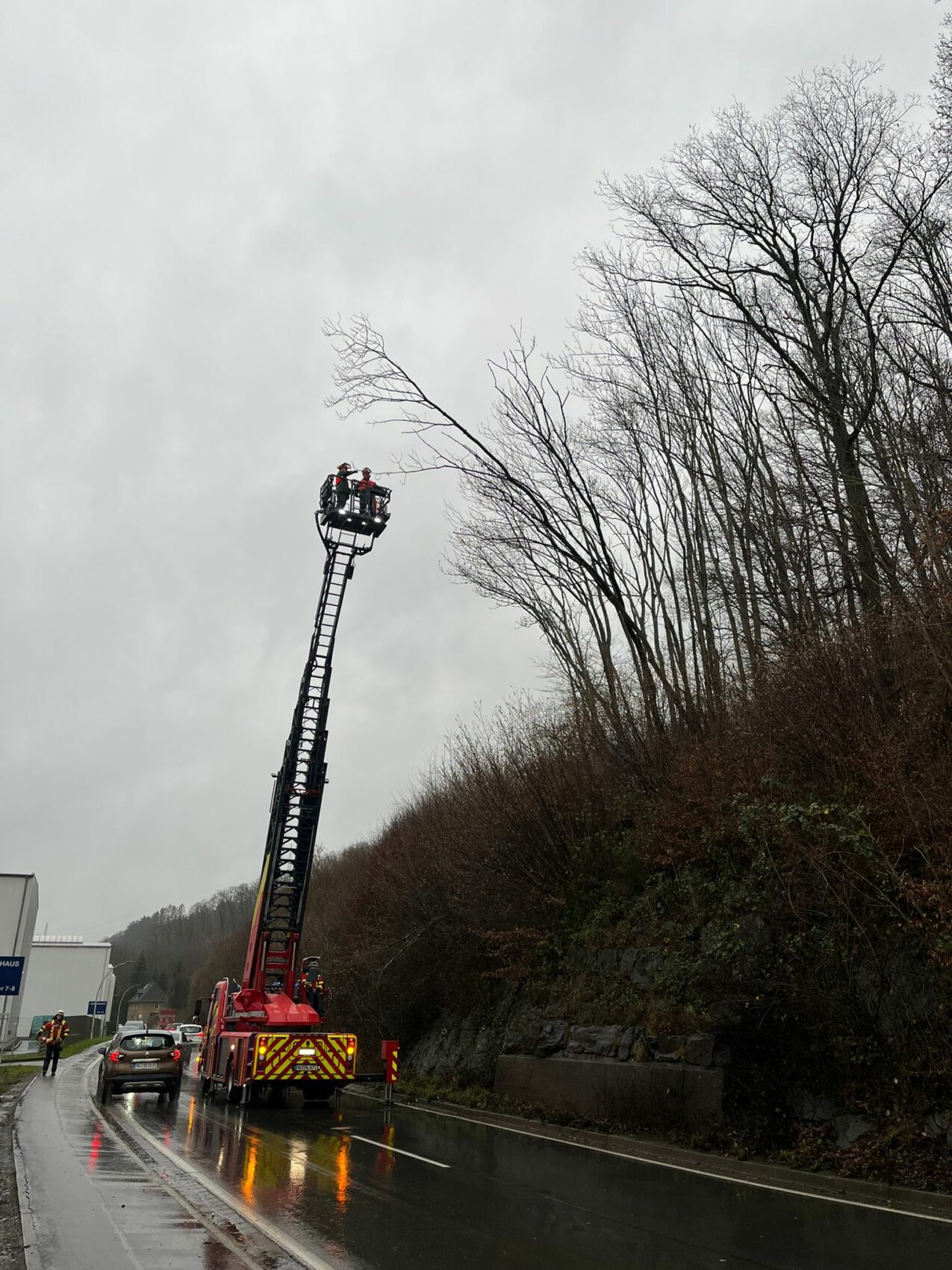 Ein Anwohner hatte den im Einsatz befindlichen Kräften einen weiteren Baum auf einer Telefonleitung gemeldet. Da dies zunächst nicht eindeutig verifizierbar war, konnte der Vertreter des Energieversorgers Abhilfe schaffen. Die Bäume konnten vom Korb der Drehleiter aus entfernt werden, sodass kein weiterer Schaden entstand.