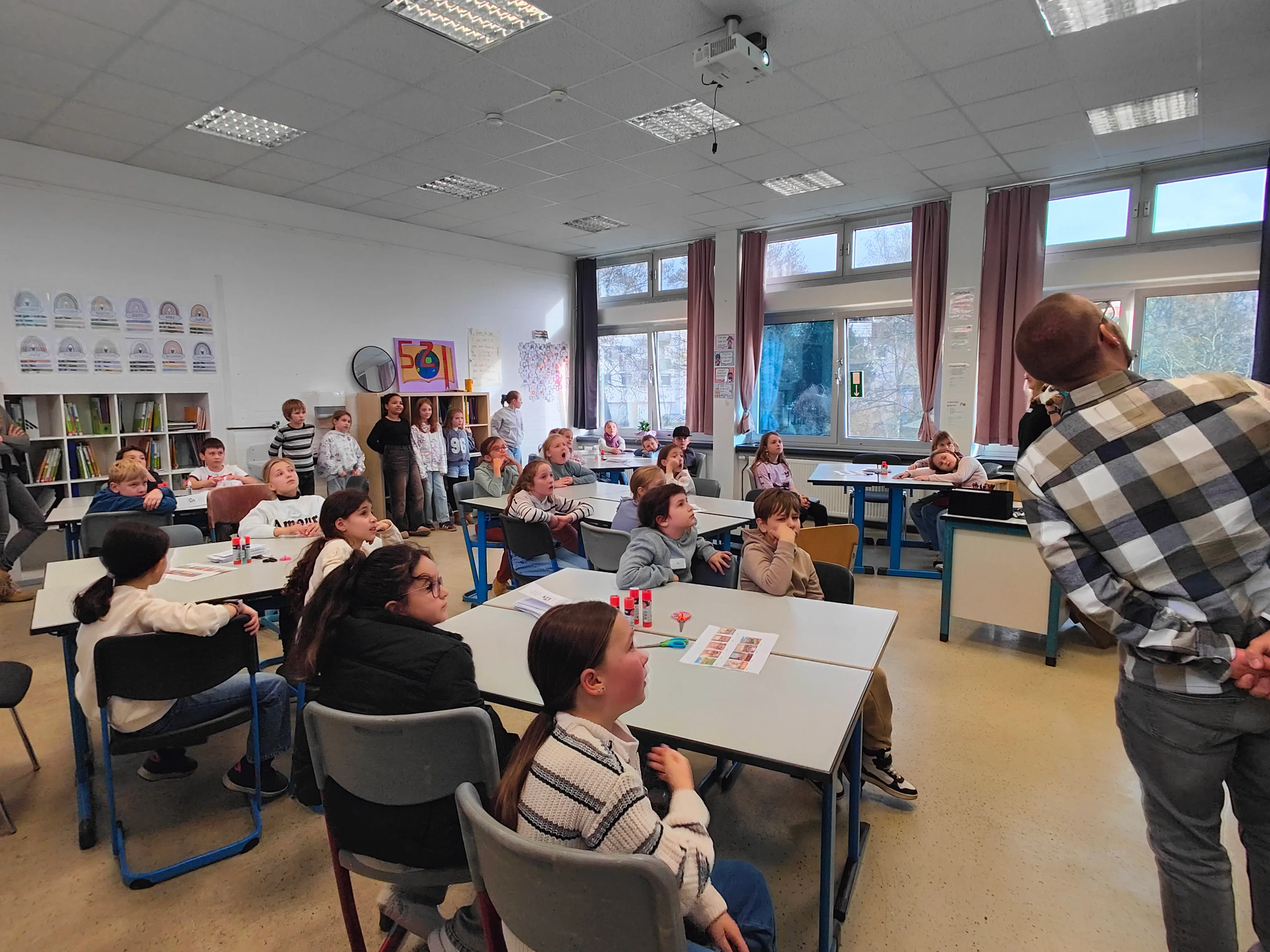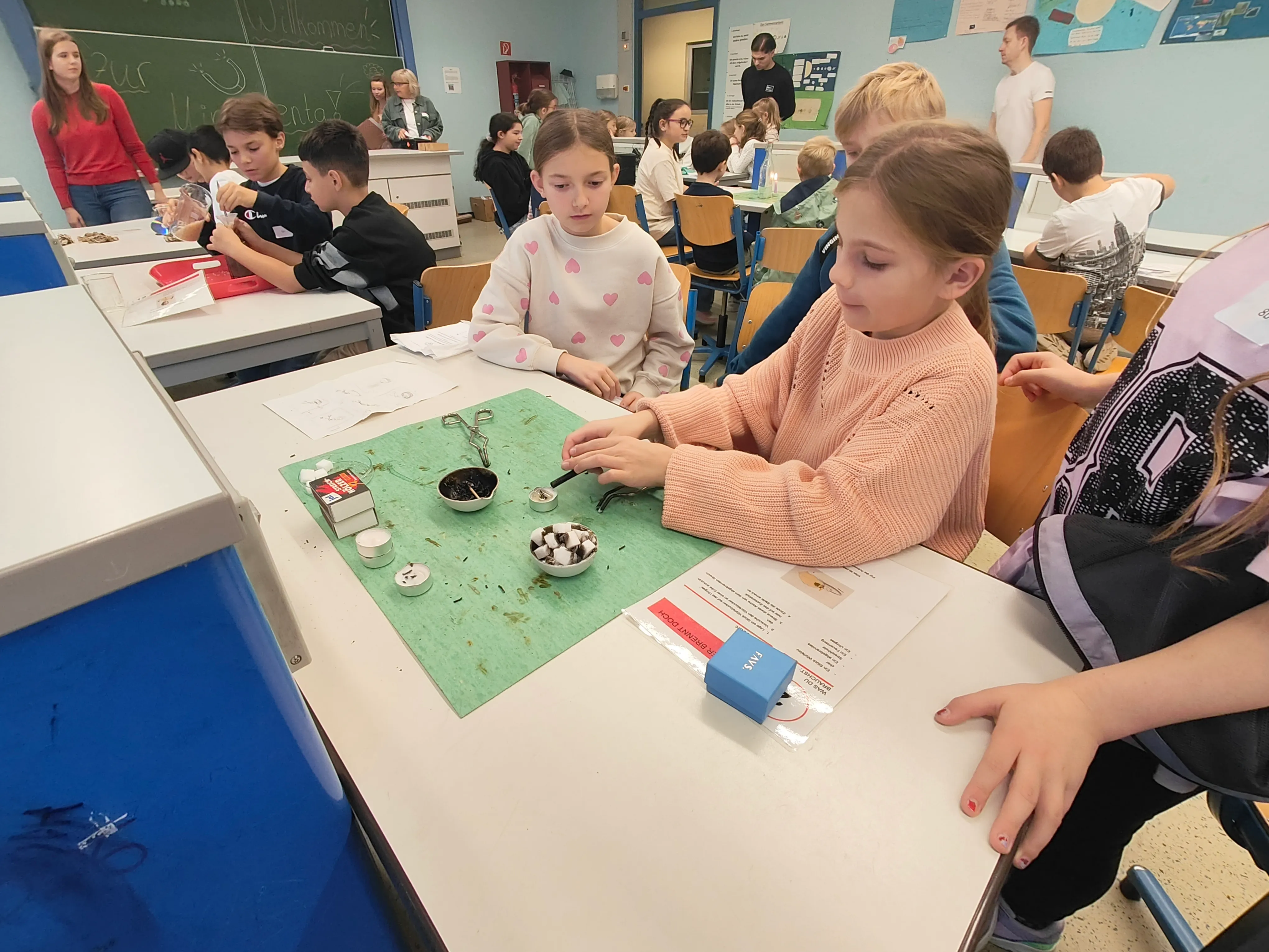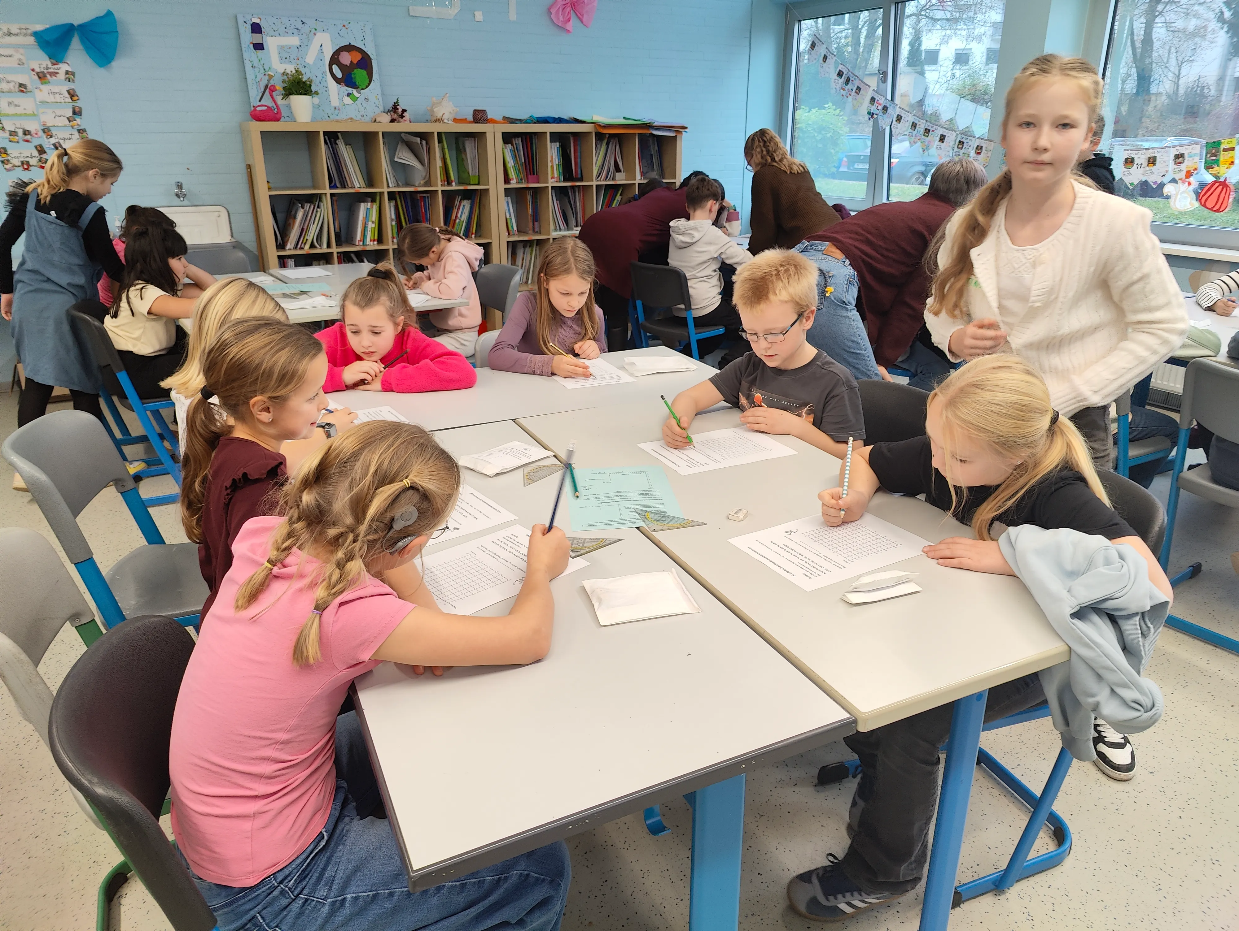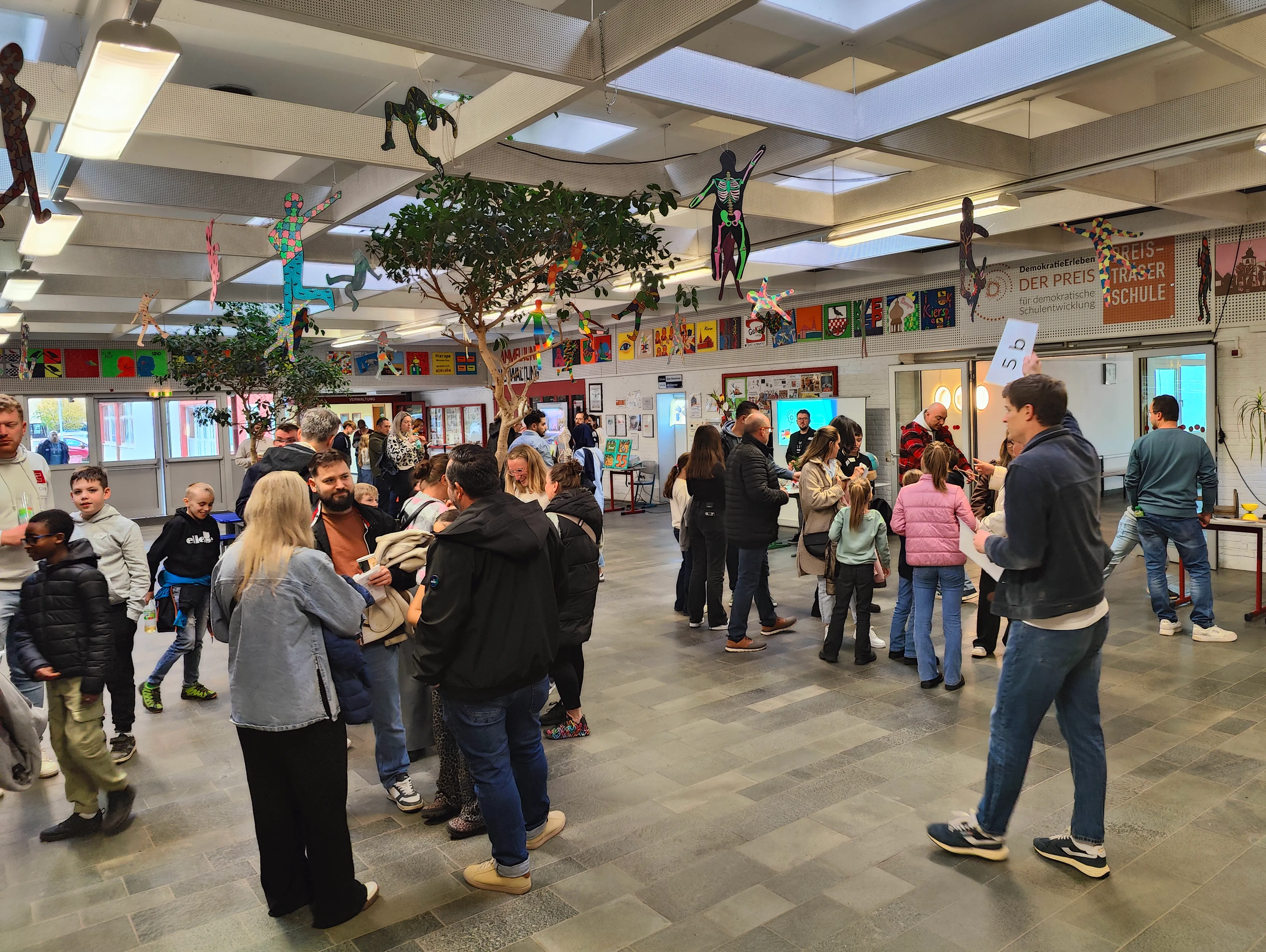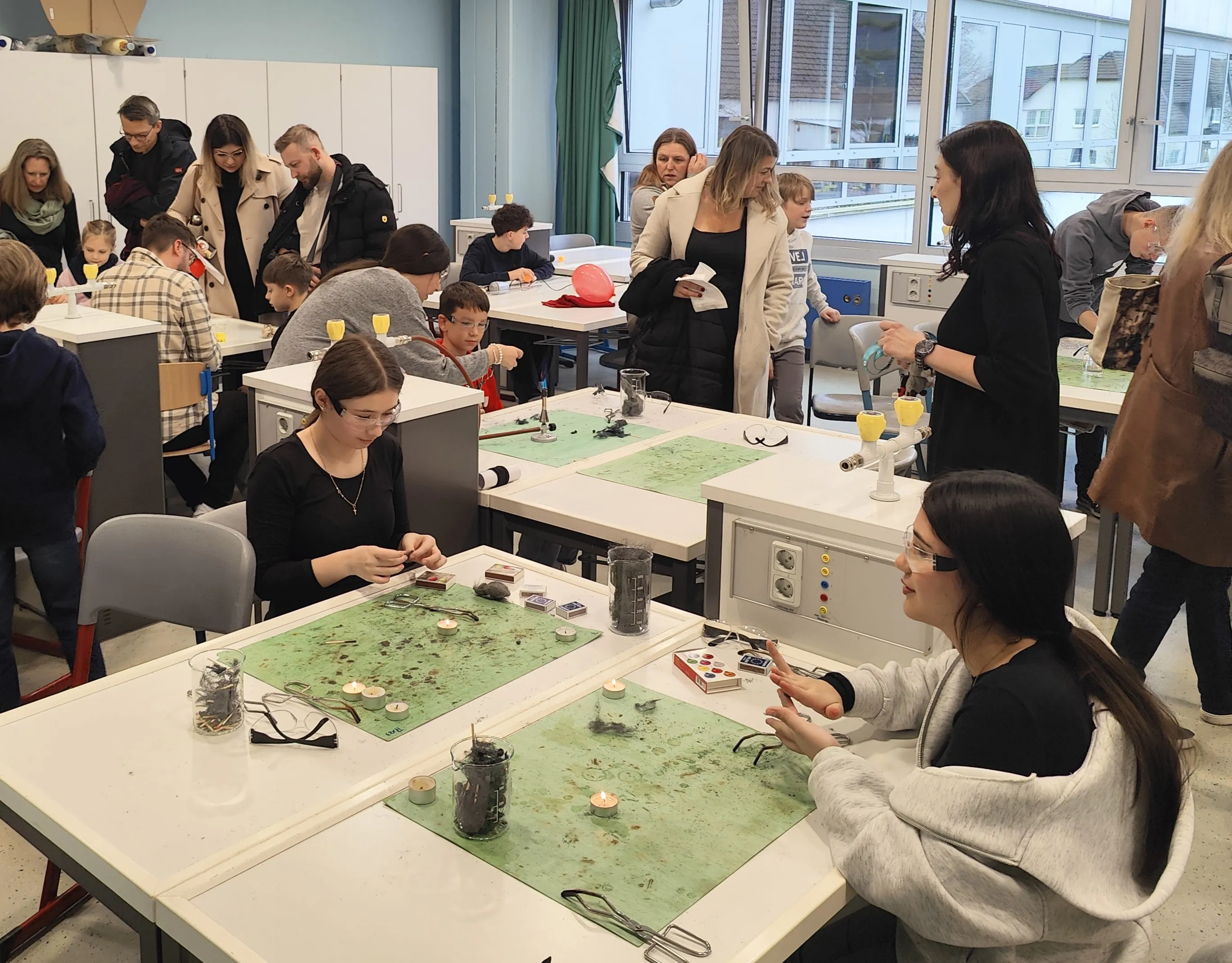 Im Anschluss gab es einen Rundgang für Eltern und Kinder durch die Schule, bei dem die Räumlichkeiten vorgestellt wurden. Hier bekamen die Eltern viele Informationen über den Unterricht und konnten Rückfragen stellen, während die Kinder sich mit kleinen, fachspezifischen Aufgaben beschäftigten. Je nachdem, welcher Unterrichtsraum gerade angeschaut wurde, wurden also im Mathe-Raum Rechenaufgaben bearbeitet, im DG-Kurs (Darstellen und Gestalten) ein Schatten-Standbild gestaltet oder im Physikraum kleine Experimente durchgeführt.