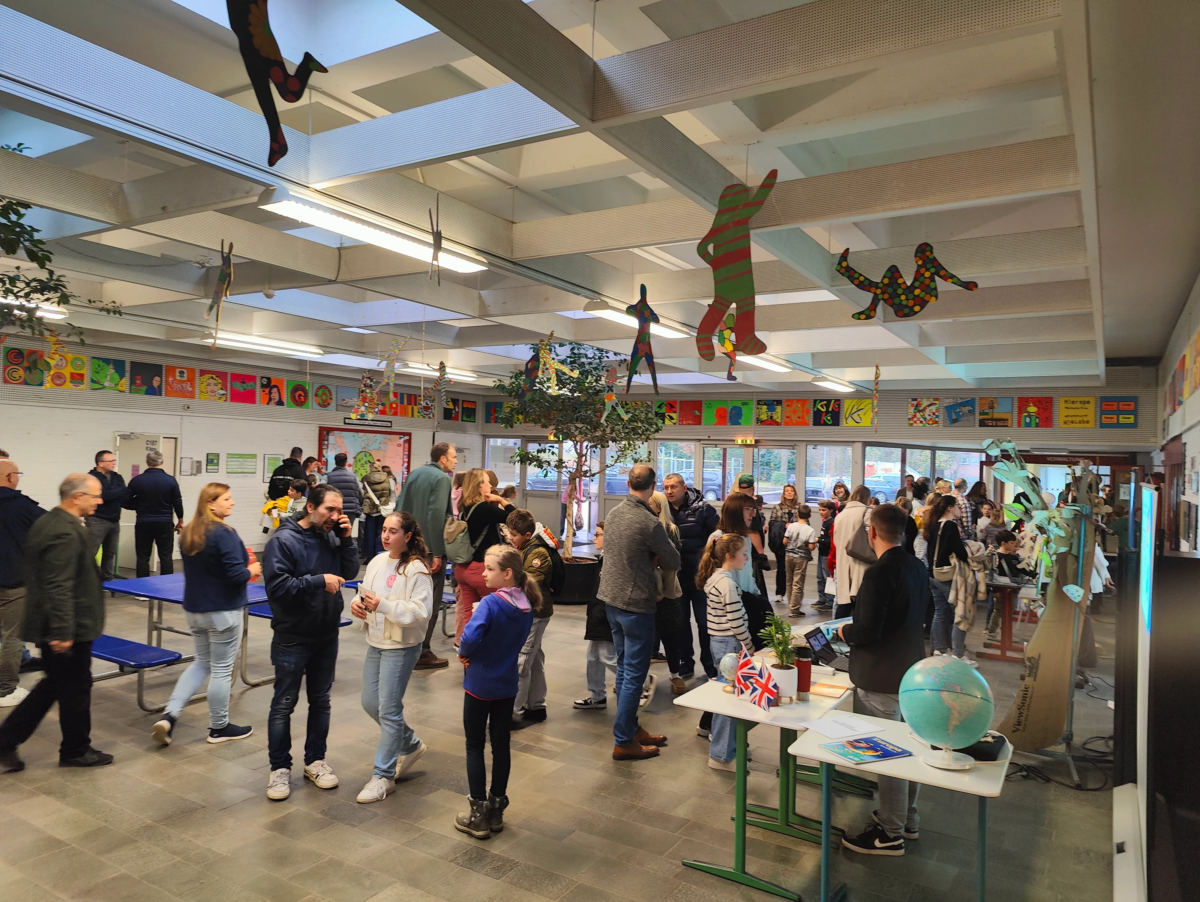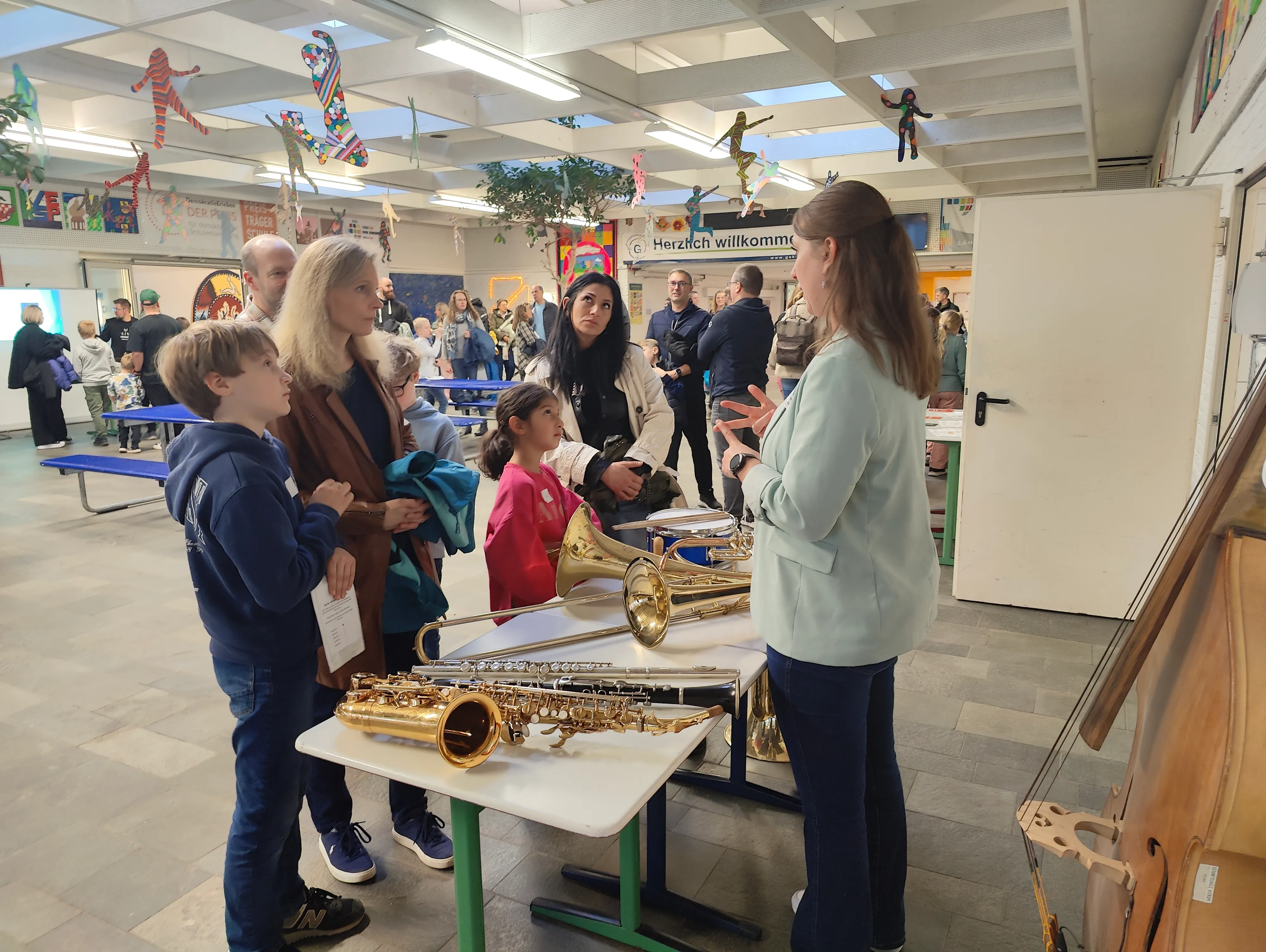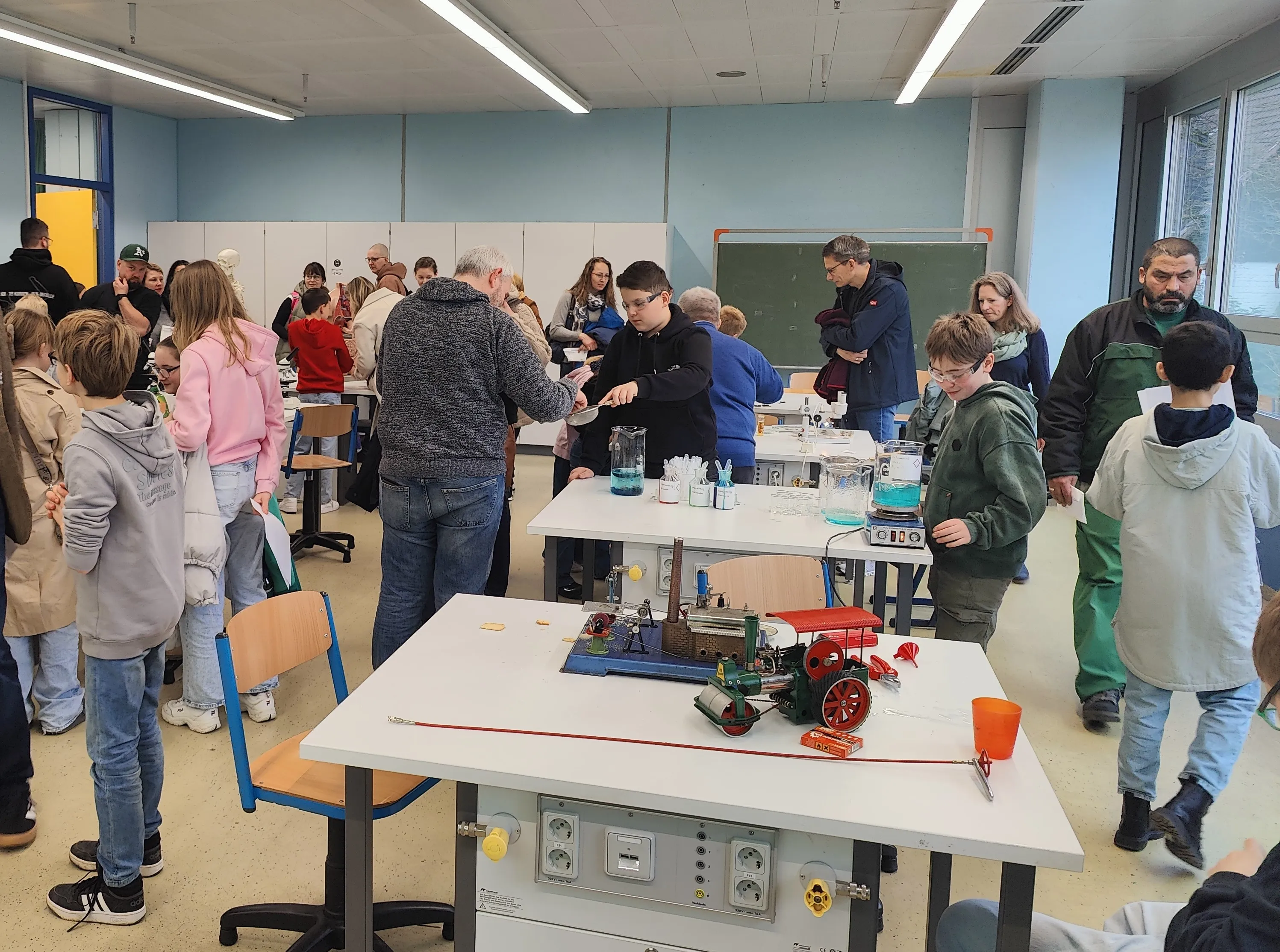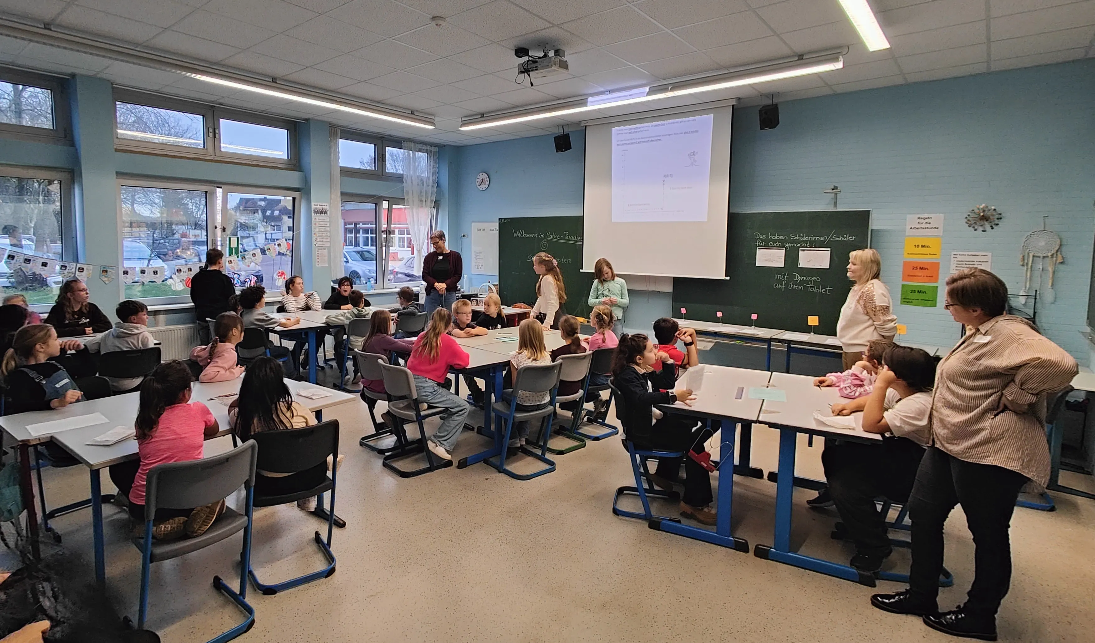 Im Anschluss gab es einen Rundgang für Eltern und Kinder durch die Schule, bei dem die Räumlichkeiten vorgestellt wurden. Hier bekamen die Eltern viele Informationen über den Unterricht und konnten Rückfragen stellen, während die Kinder sich mit kleinen, fachspezifischen Aufgaben beschäftigten. Je nachdem, welcher Unterrichtsraum gerade angeschaut wurde, wurden also im Mathe-Raum Rechenaufgaben bearbeitet, im DG-Kurs (Darstellen und Gestalten) ein Schatten-Standbild gestaltet oder im Physikraum kleine Experimente durchgeführt.