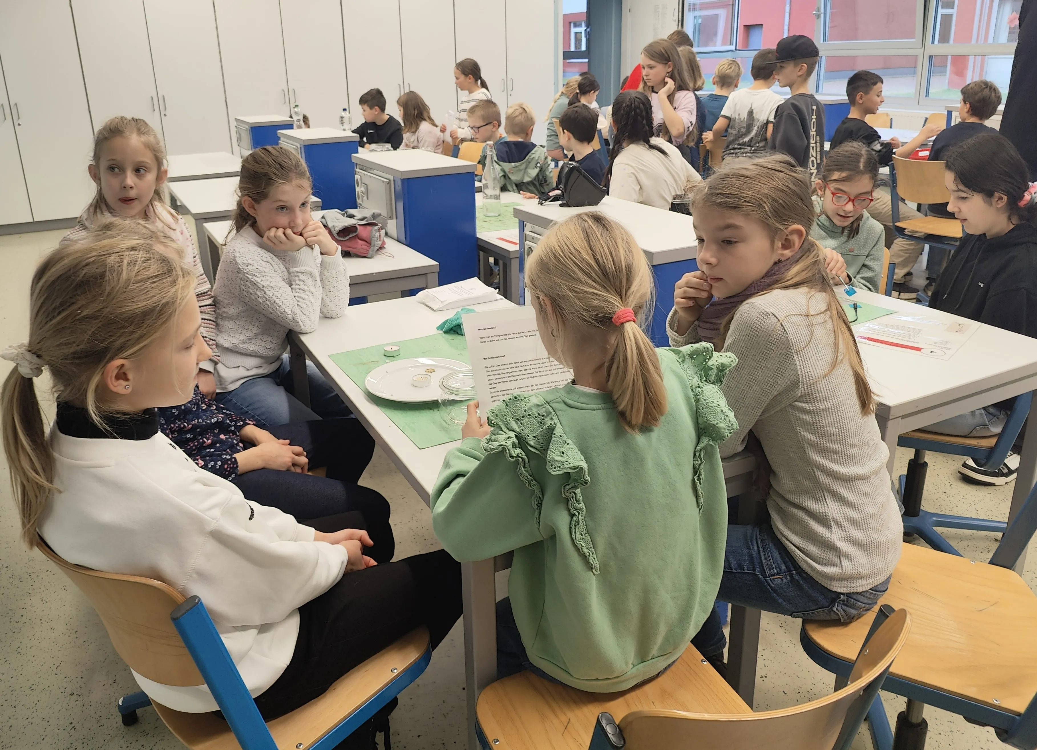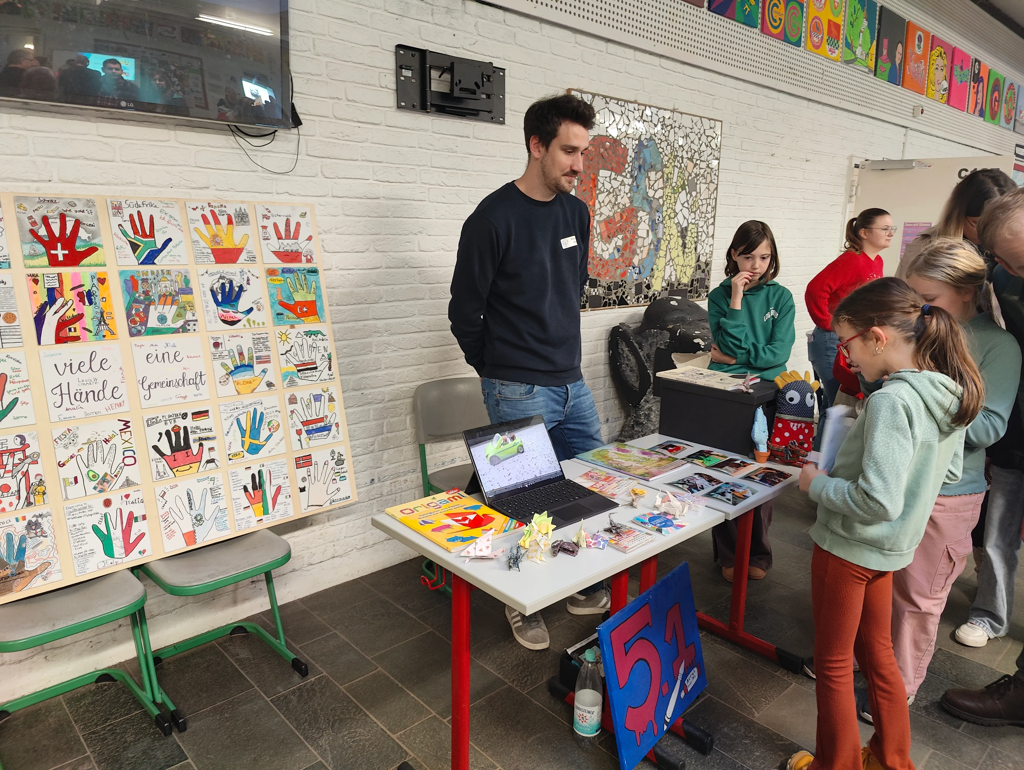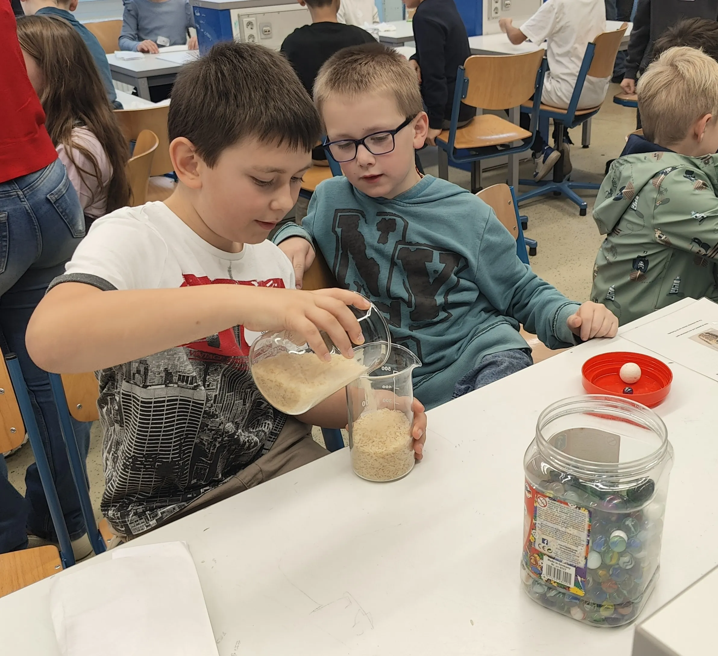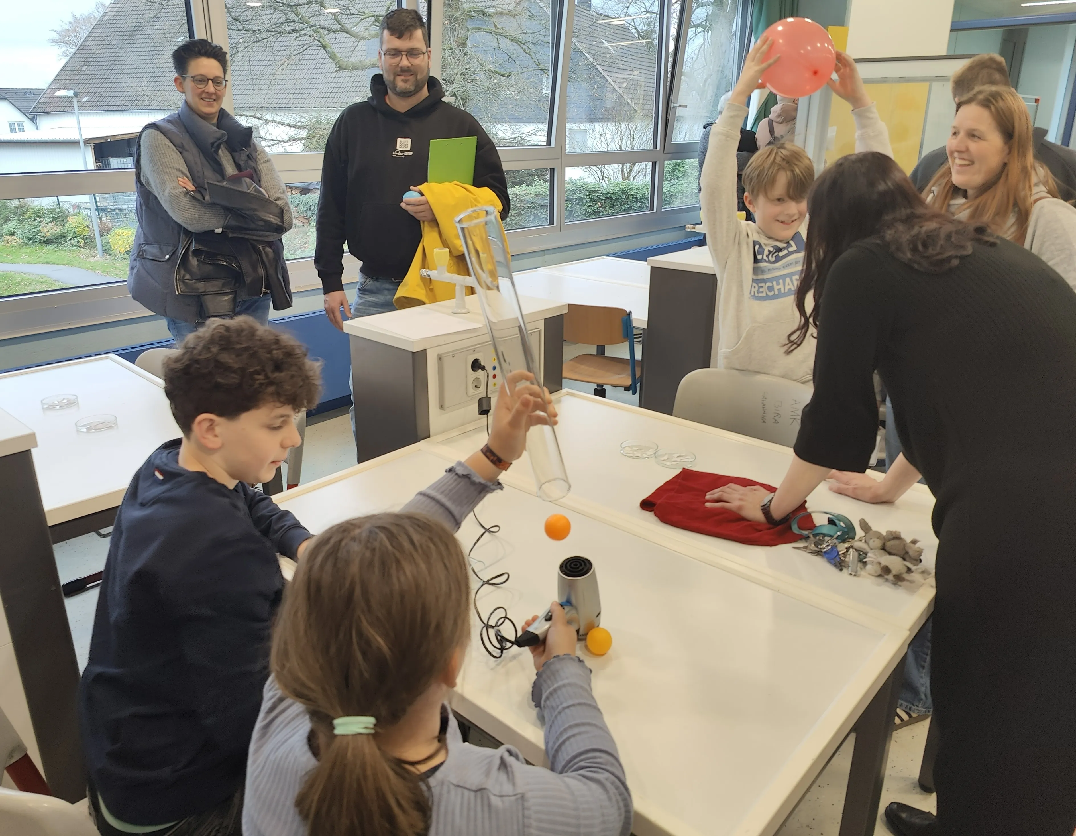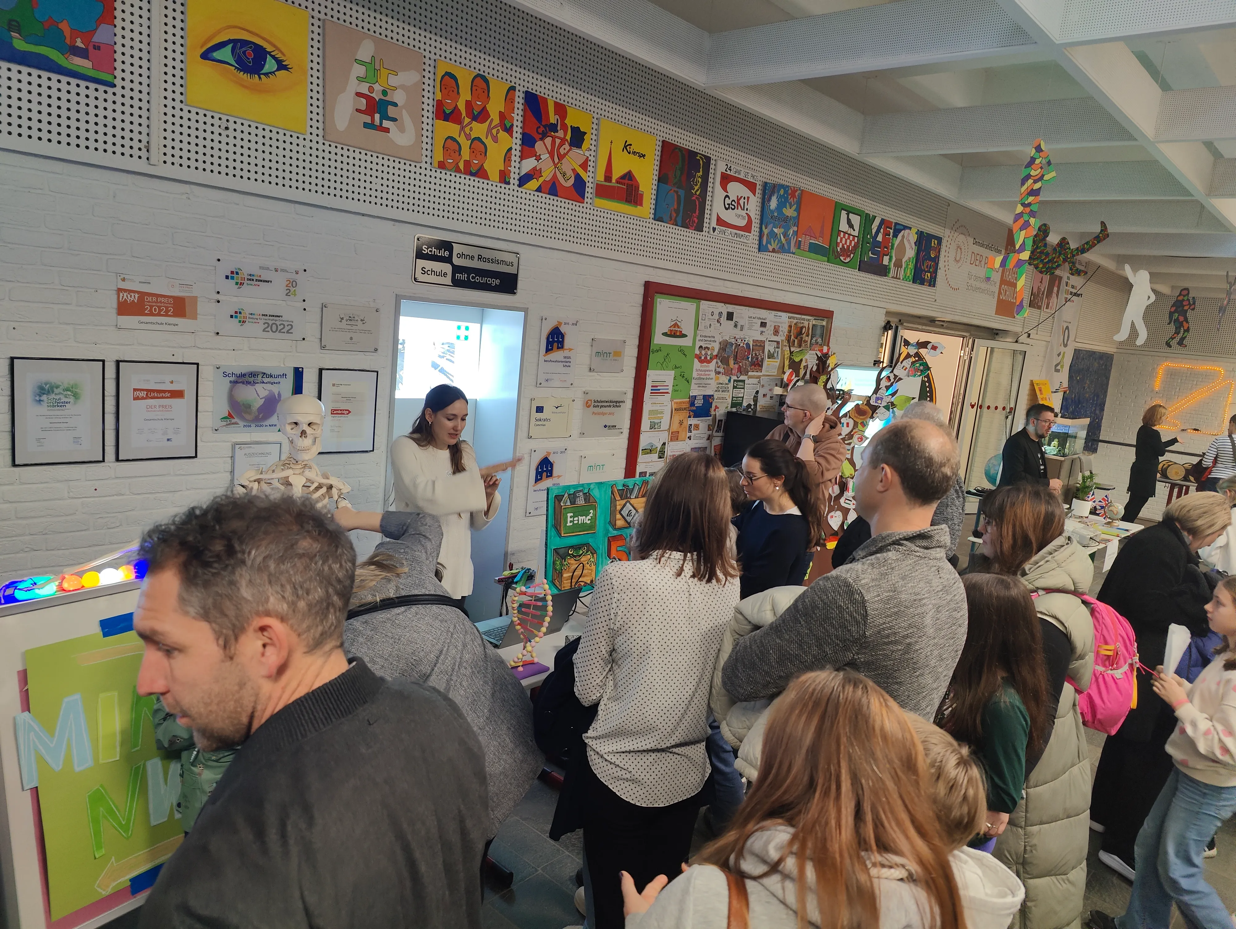 Im Anschluss gab es einen Rundgang für Eltern und Kinder durch die Schule, bei dem die Räumlichkeiten vorgestellt wurden. Hier bekamen die Eltern viele Informationen über den Unterricht und konnten Rückfragen stellen, während die Kinder sich mit kleinen, fachspezifischen Aufgaben beschäftigten. Je nachdem, welcher Unterrichtsraum gerade angeschaut wurde, wurden also im Mathe-Raum Rechenaufgaben bearbeitet, im DG-Kurs (Darstellen und Gestalten) ein Schatten-Standbild gestaltet oder im Physikraum kleine Experimente durchgeführt.