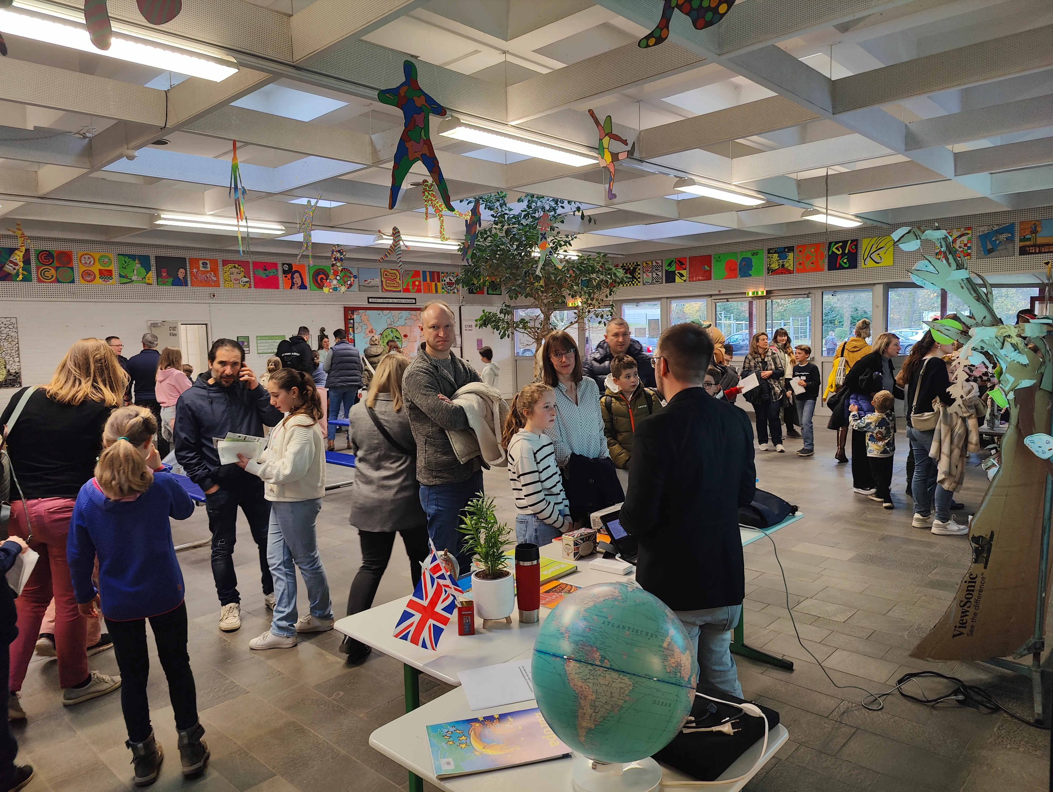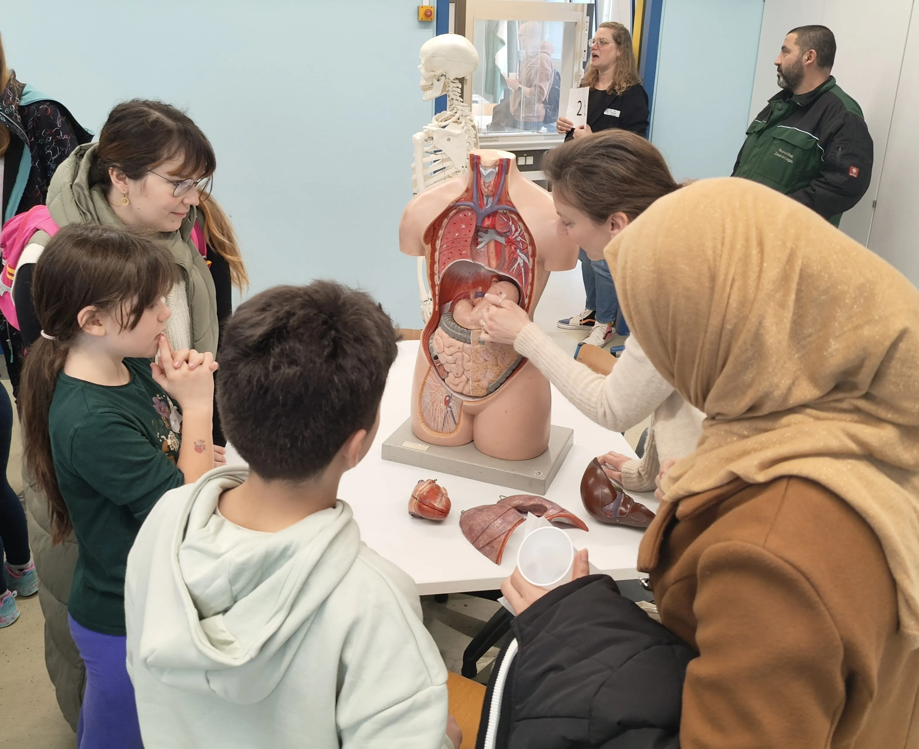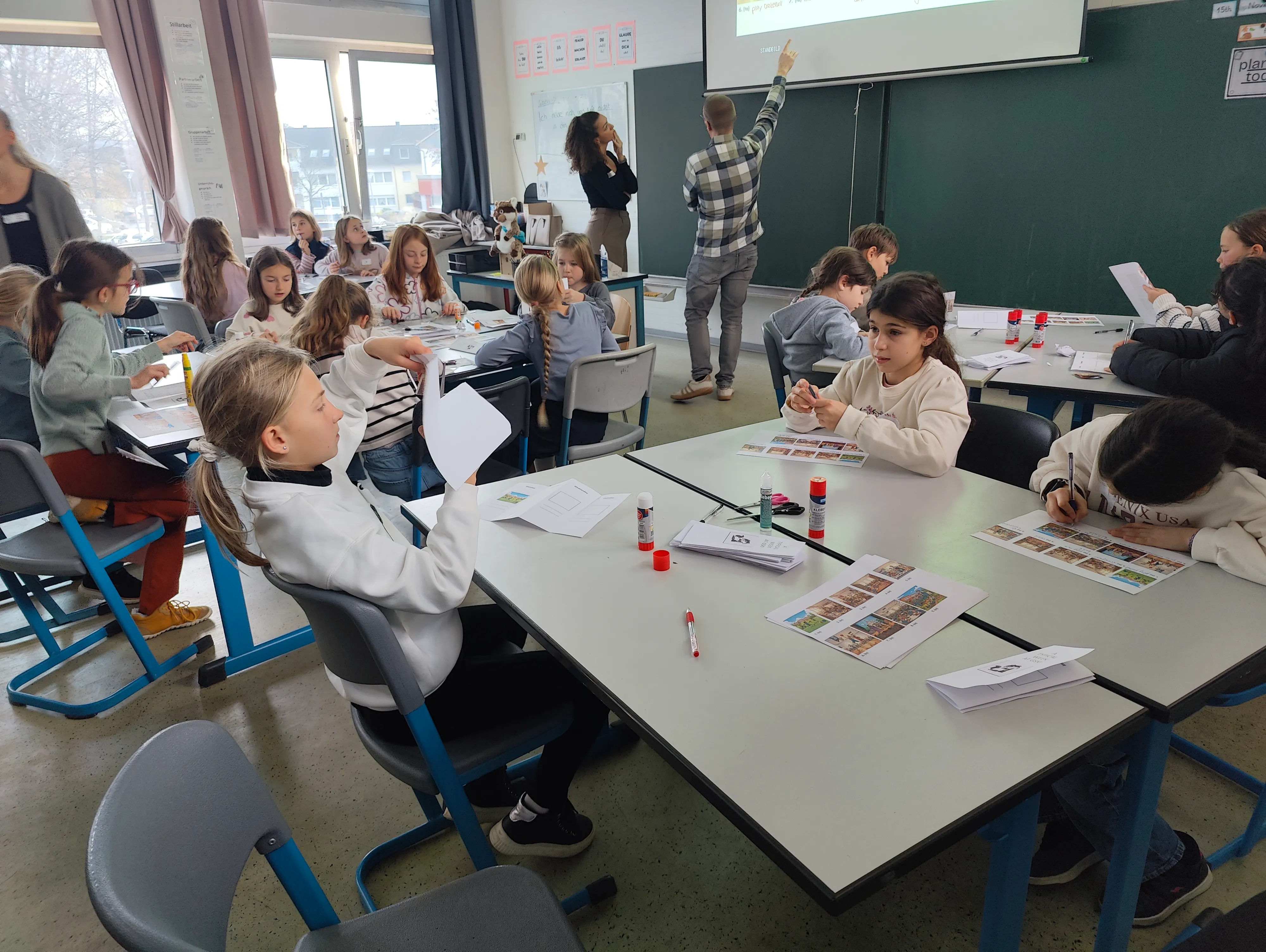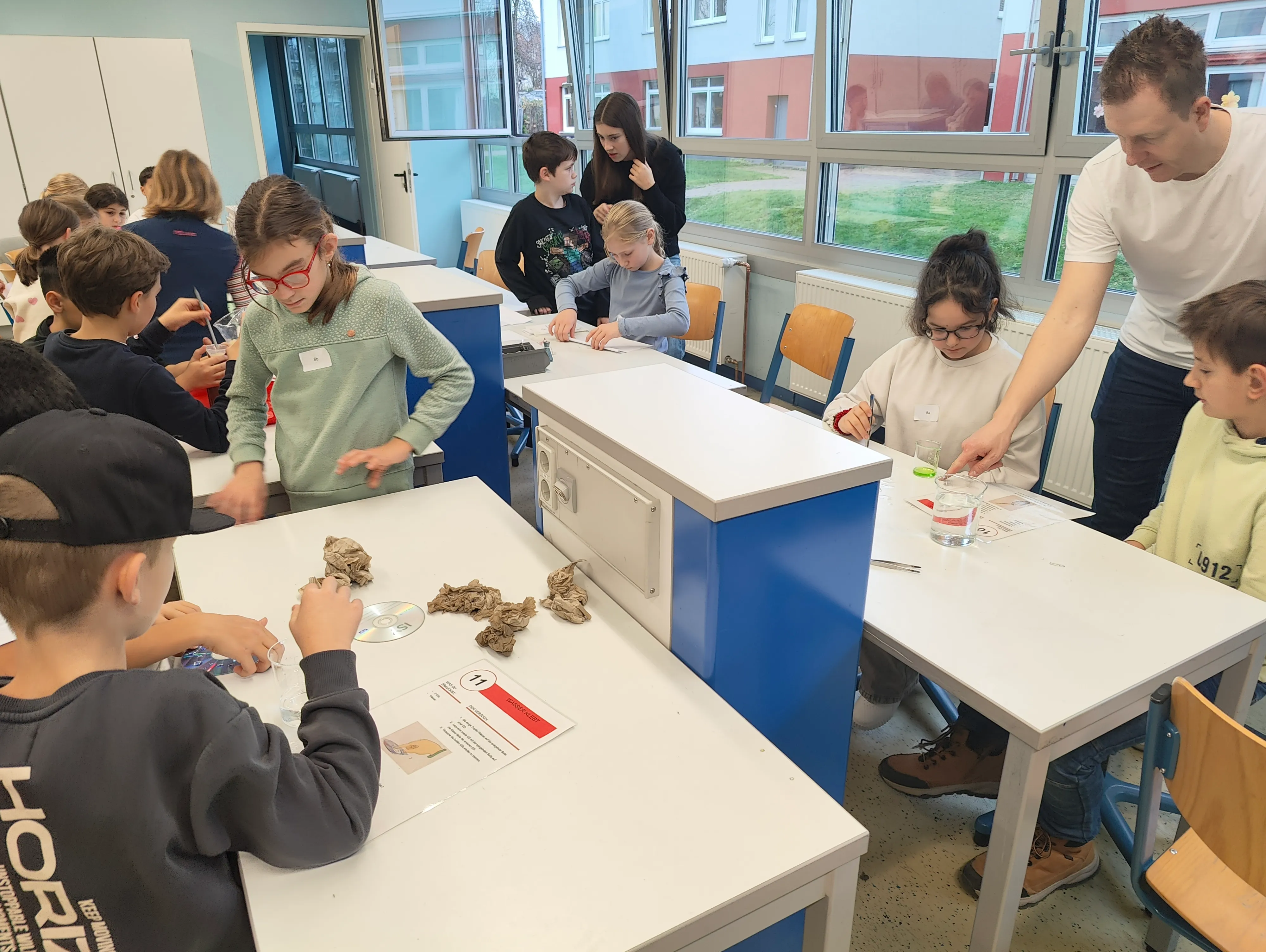 Im Anschluss gab es einen Rundgang für Eltern und Kinder durch die Schule, bei dem die Räumlichkeiten vorgestellt wurden. Hier bekamen die Eltern viele Informationen über den Unterricht und konnten Rückfragen stellen, während die Kinder sich mit kleinen, fachspezifischen Aufgaben beschäftigten. Je nachdem, welcher Unterrichtsraum gerade angeschaut wurde, wurden also im Mathe-Raum Rechenaufgaben bearbeitet, im DG-Kurs (Darstellen und Gestalten) ein Schatten-Standbild gestaltet oder im Physikraum kleine Experimente durchgeführt.