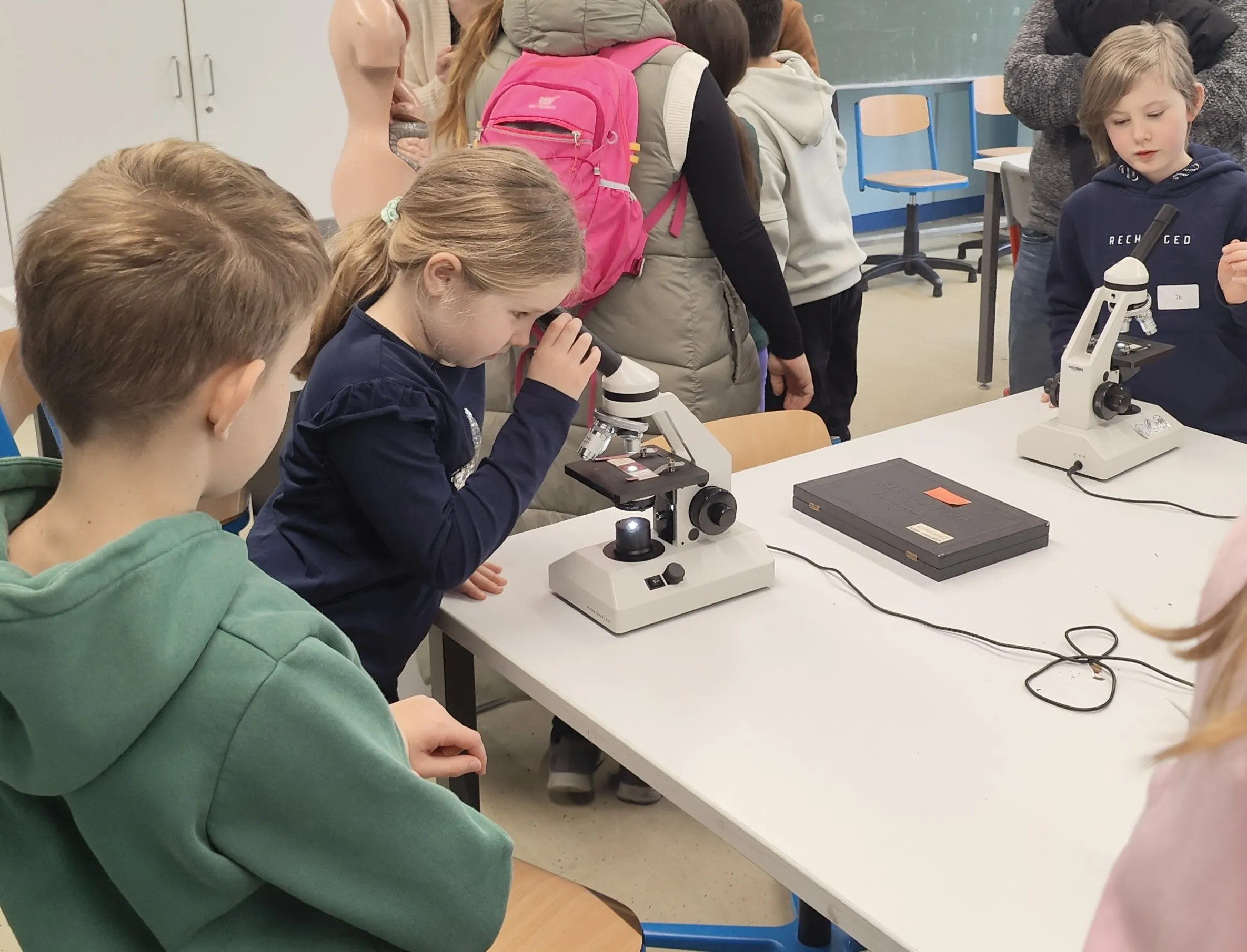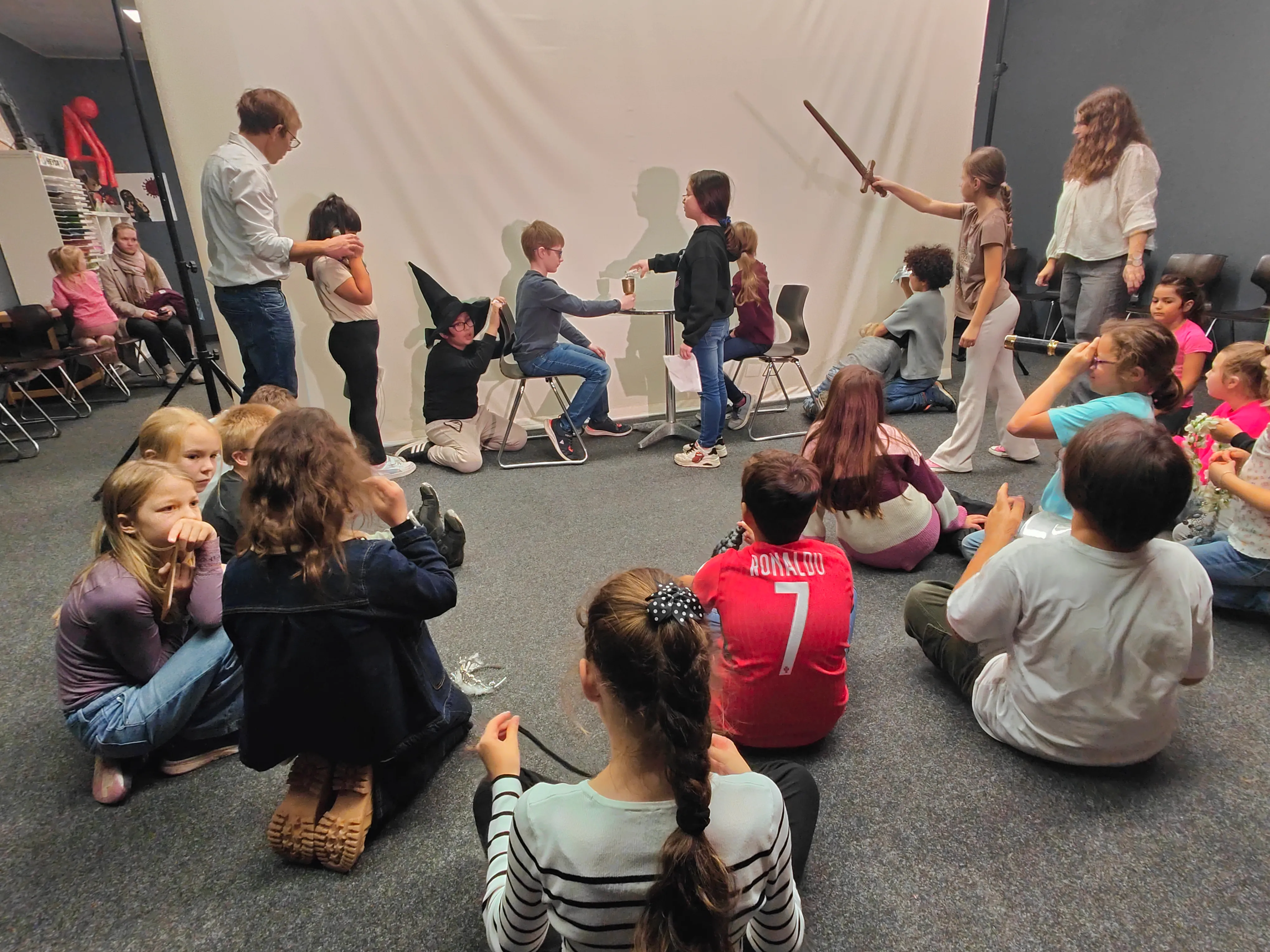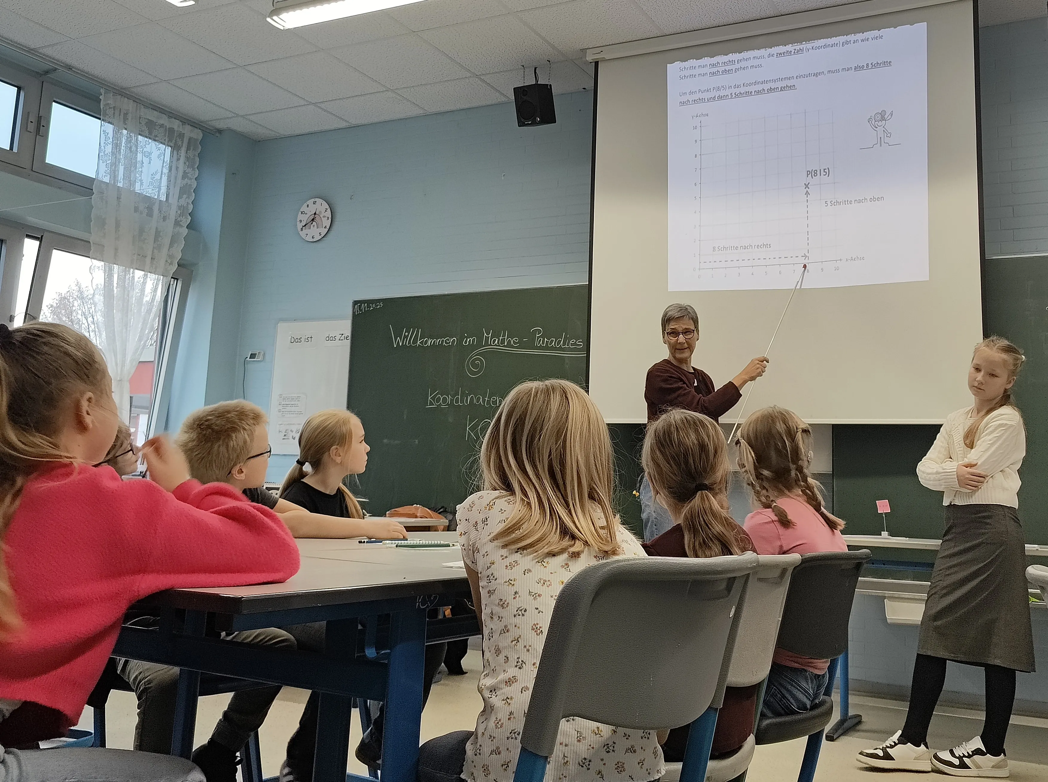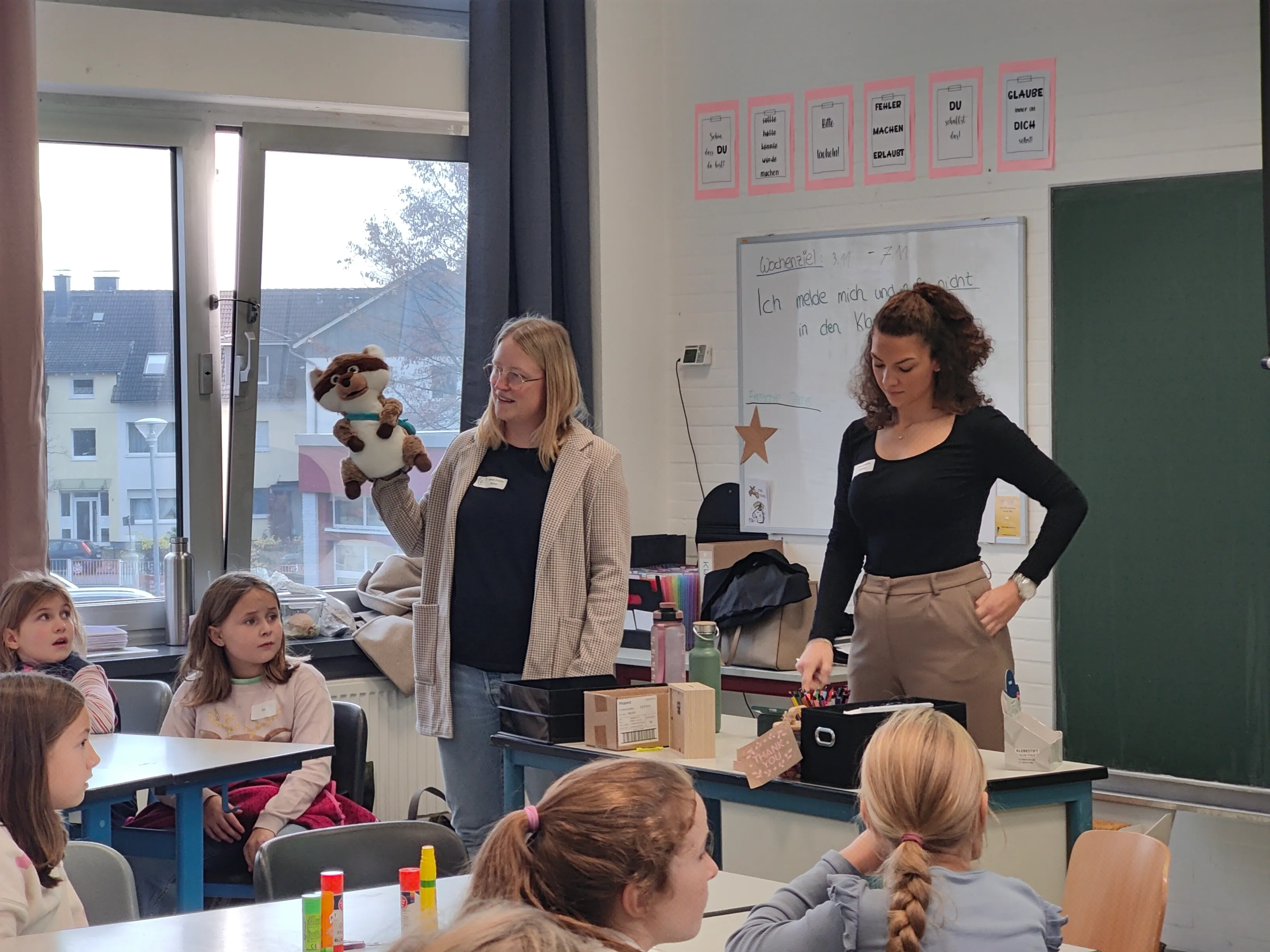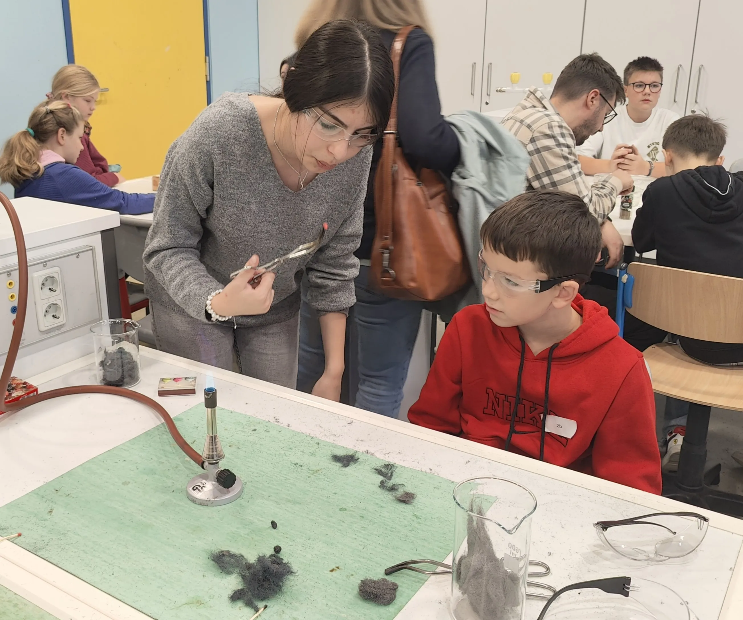 Im Anschluss gab es einen Rundgang für Eltern und Kinder durch die Schule, bei dem die Räumlichkeiten vorgestellt wurden. Hier bekamen die Eltern viele Informationen über den Unterricht und konnten Rückfragen stellen, während die Kinder sich mit kleinen, fachspezifischen Aufgaben beschäftigten. Je nachdem, welcher Unterrichtsraum gerade angeschaut wurde, wurden also im Mathe-Raum Rechenaufgaben bearbeitet, im DG-Kurs (Darstellen und Gestalten) ein Schatten-Standbild gestaltet oder im Physikraum kleine Experimente durchgeführt.