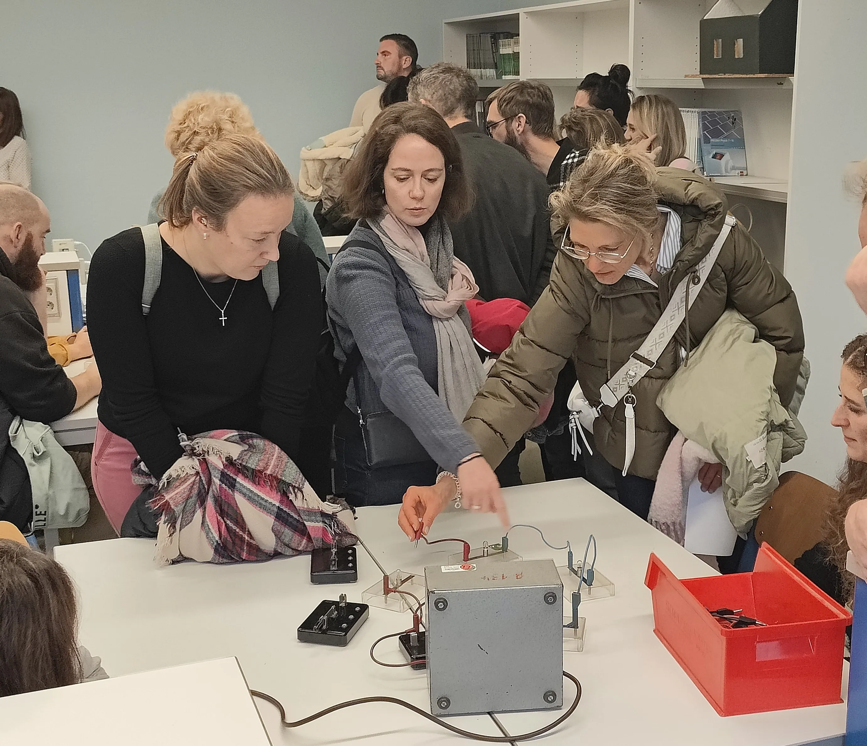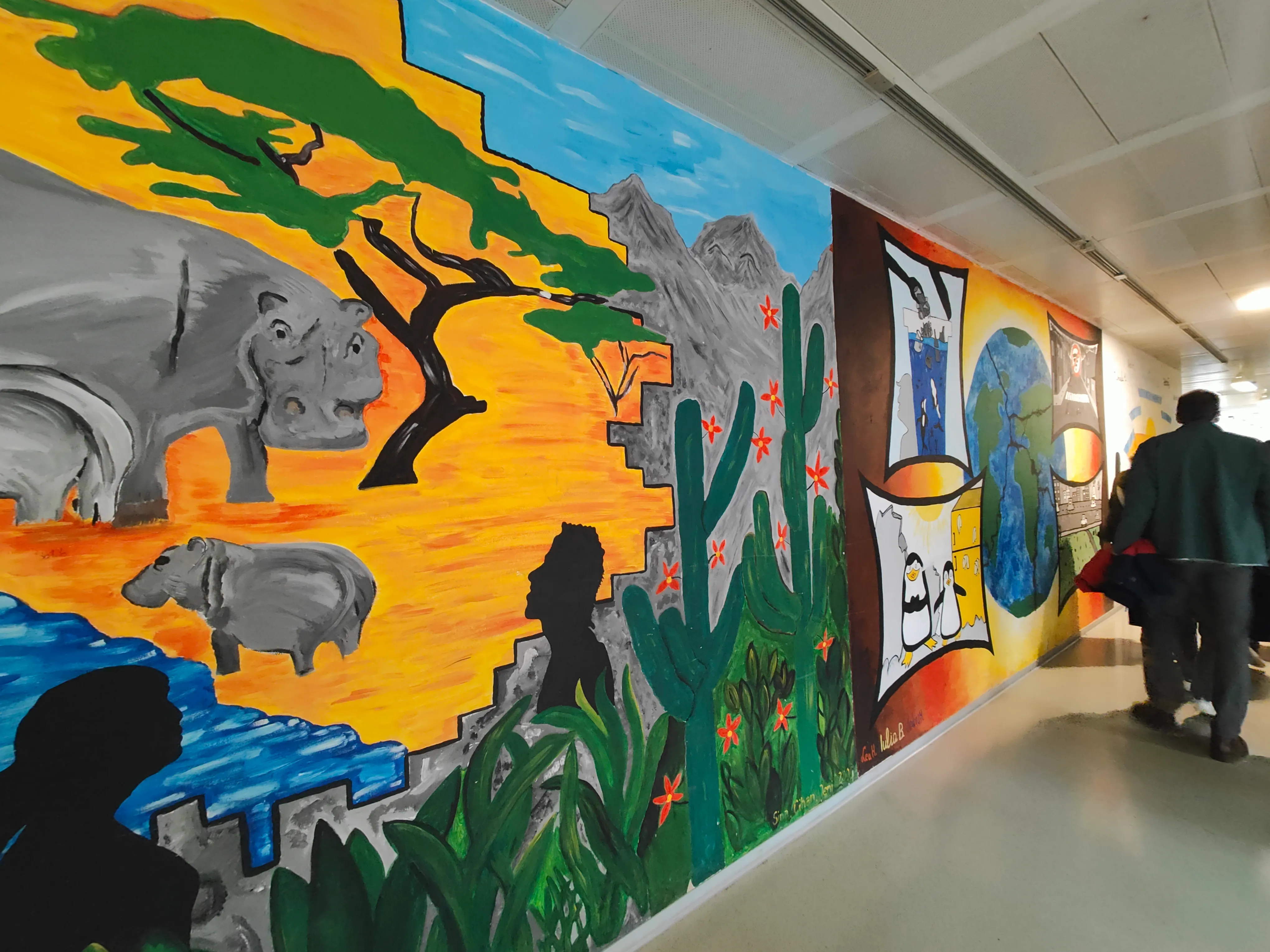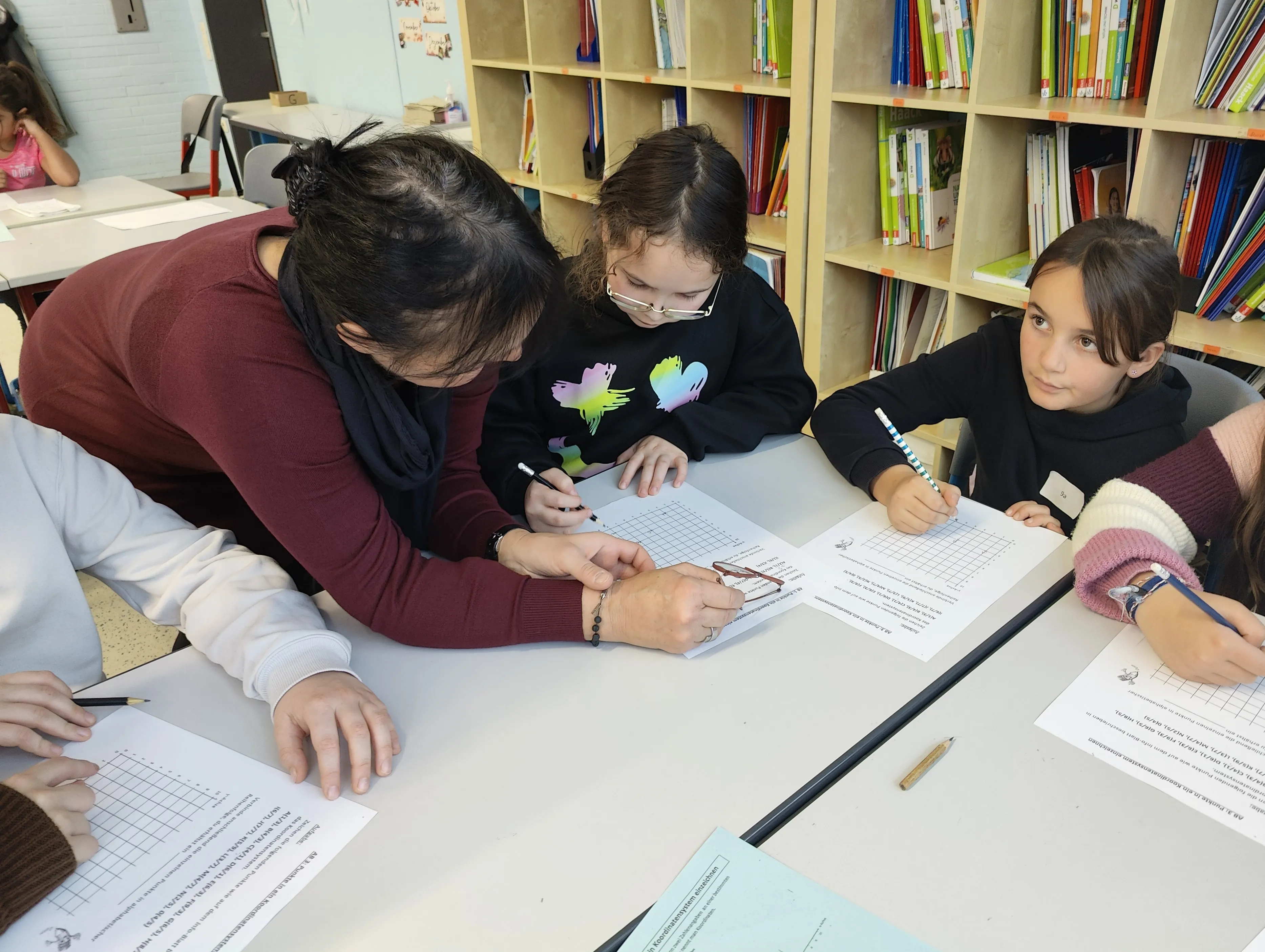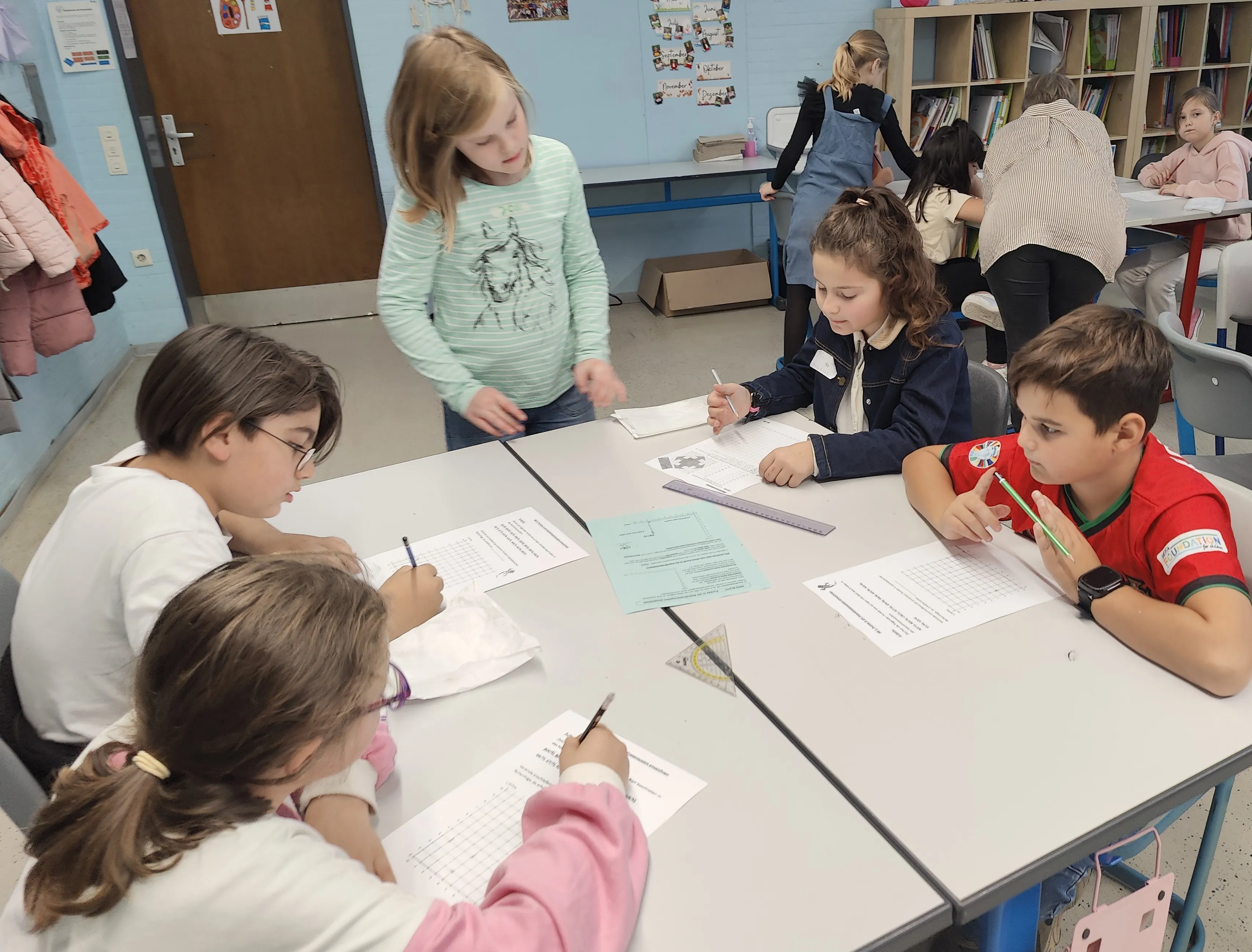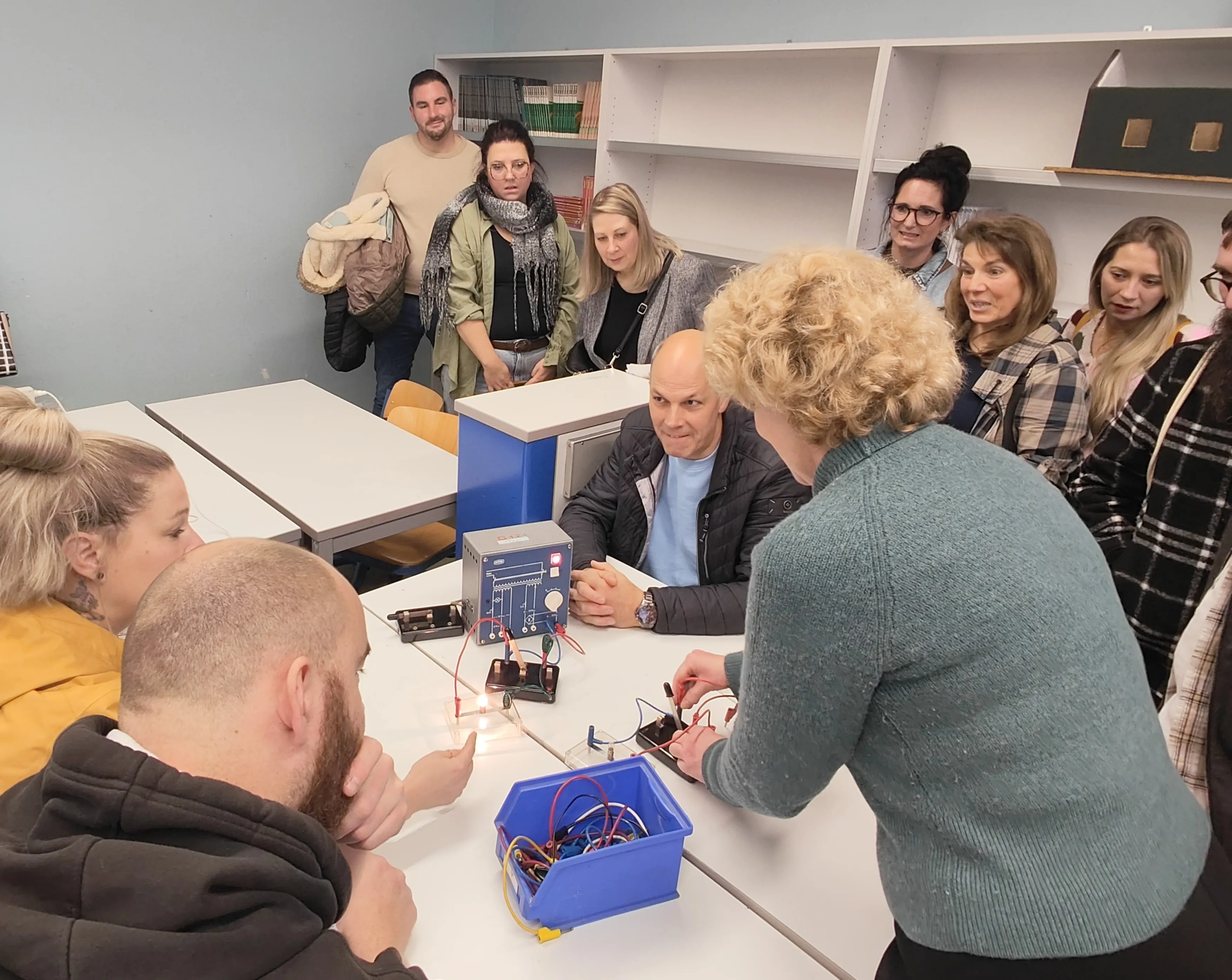 Im Anschluss gab es einen Rundgang für Eltern und Kinder durch die Schule, bei dem die Räumlichkeiten vorgestellt wurden. Hier bekamen die Eltern viele Informationen über den Unterricht und konnten Rückfragen stellen, während die Kinder sich mit kleinen, fachspezifischen Aufgaben beschäftigten. Je nachdem, welcher Unterrichtsraum gerade angeschaut wurde, wurden also im Mathe-Raum Rechenaufgaben bearbeitet, im DG-Kurs (Darstellen und Gestalten) ein Schatten-Standbild gestaltet oder im Physikraum kleine Experimente durchgeführt.