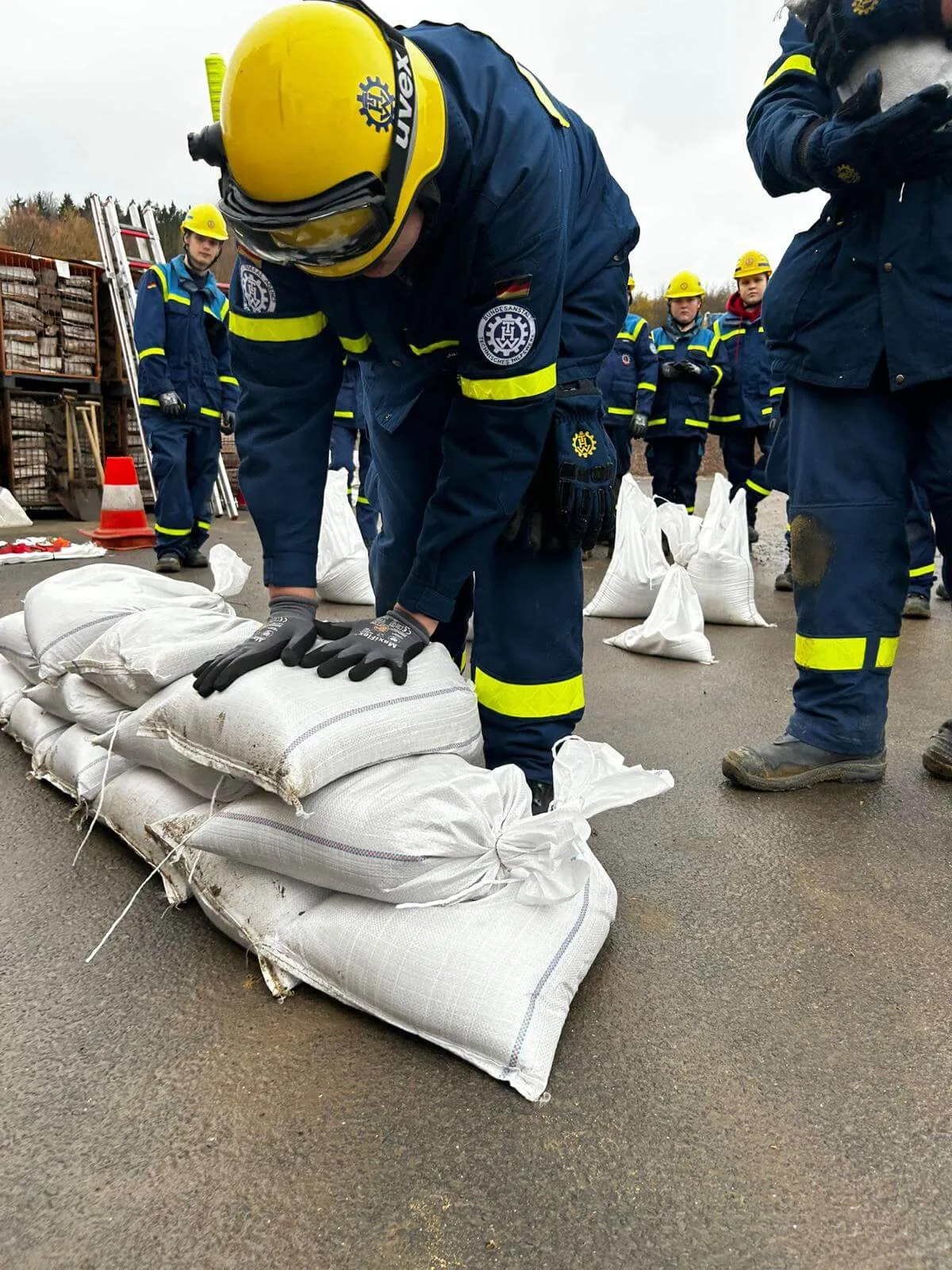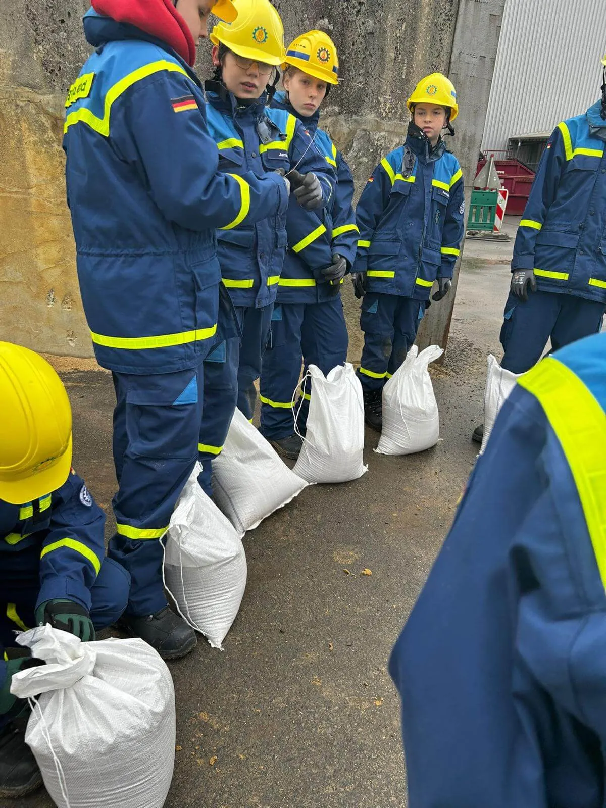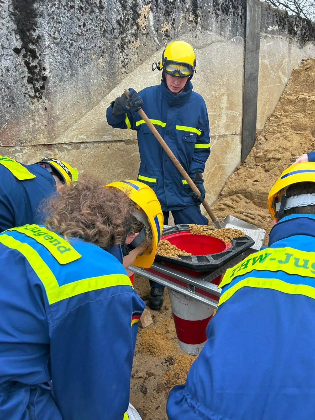 Um 10.30 Uhr wurde ein Hochwasseralarm bei der Firma Dunkel in Herscheid ausgelöst. Die Jugendlichen befüllten Sandsäcke und verstärkten eine angenommene Hochwasserschutzlinie – eine Übung, die körperliche Ausdauer und Teamkoordination verlangte.