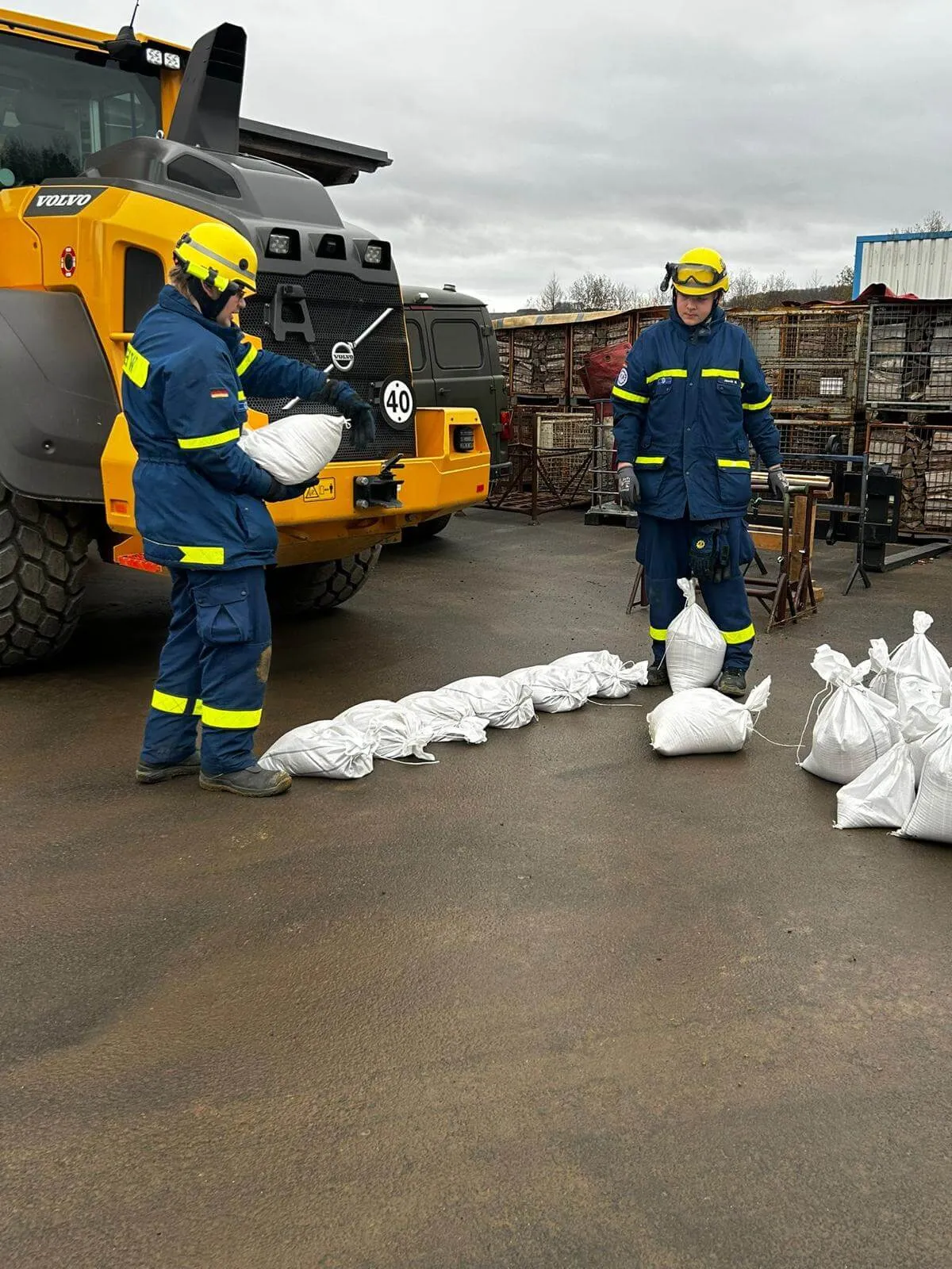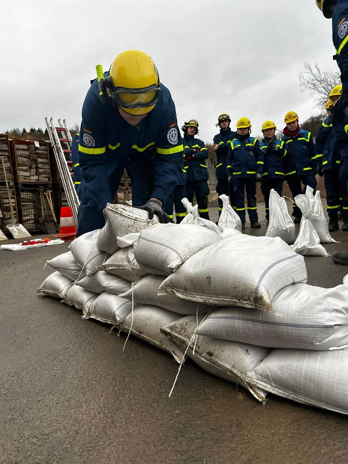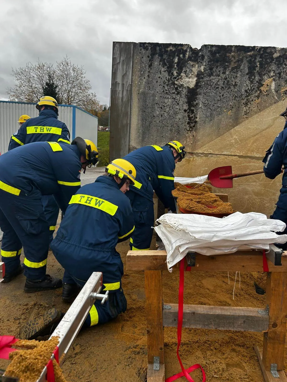 Um 10.30 Uhr wurde ein Hochwasseralarm bei der Firma Dunkel in Herscheid ausgelöst. Die Jugendlichen befüllten Sandsäcke und verstärkten eine angenommene Hochwasserschutzlinie – eine Übung, die körperliche Ausdauer und Teamkoordination verlangte.