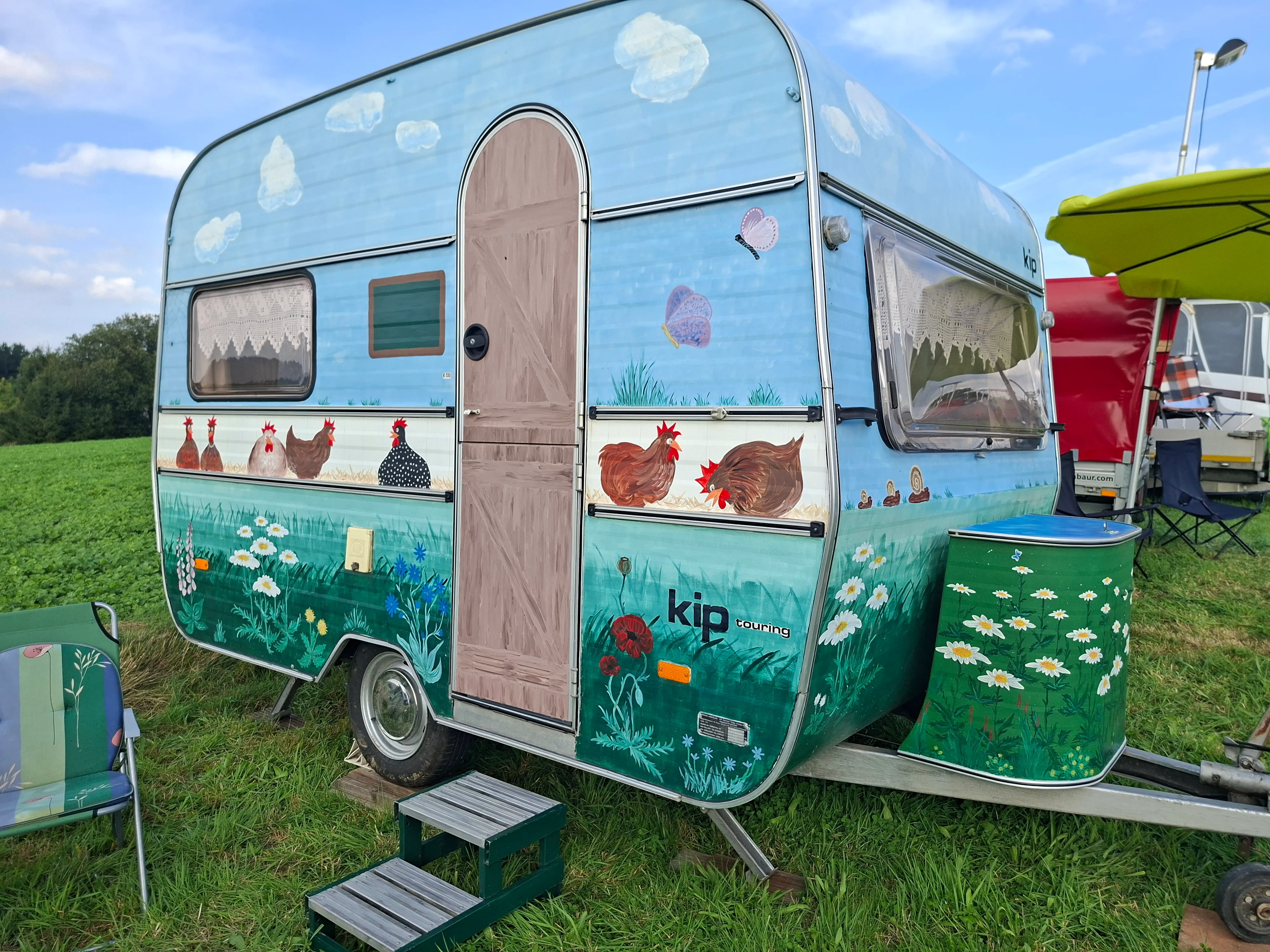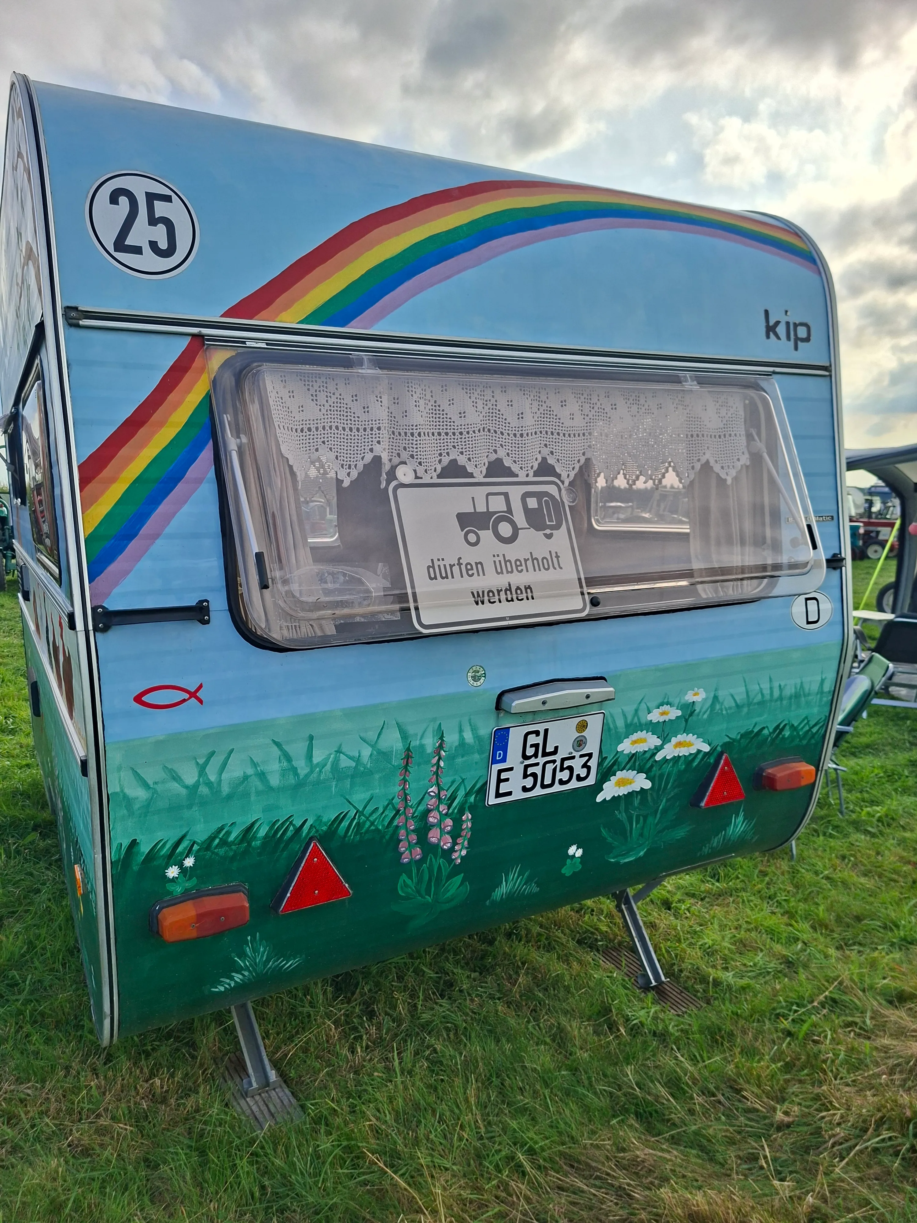Viele Menschen - und nicht nur Männer, träumen davon, einmal einen Trecker zu besitzen. So erging es auch Siegfried Eggermann. "Er sprach schon seit Jahren davon, dass das sein größter Wunsch sei", erinnert sich seine Frau Elisabeth. Zum 60. Geburtstag war es dann soweit. Die ganze Familie hat zusammengelegt und ihm zu seinem Ehrentag einen alten Kramer Trecker gekauft. "Er hatte TÜV und lief auch, sah aber ziemlich runtergekommen aus", erzählt sie weiter. Siegfried Eggermann hat den Schlepper dann in unzähligen Stunden restauriert und fährt nun mit seinem grünen Prachtstück so oft es geht zu den Treffen der Schlepperfreunde. "Die weiteste Fahrt haben wir bis nach Gutmadingen im Schwarzwald unternommen", erzählen beide. Wir waren sechs Tage unterwegs, bis wir dort waren. Der Schlepper fährt ja nur maximal 28 km/h. Wir haben dort drei Tage auf dem Treffen verbracht und sind dann wieder zurückgefahren." Für solche Touren haben sich die beiden extra einen alten, kleinen Wohnwagen angeschafft, den Elisabeth Eggermann liebevoll selbst bemalt hat. Lustige Hühner und eine Blumenwiese zieren das Gefährt. Außerdem darf ihr Wahlspruch: "Wir haben es gut - wir haben uns", darauf nicht fehlen.