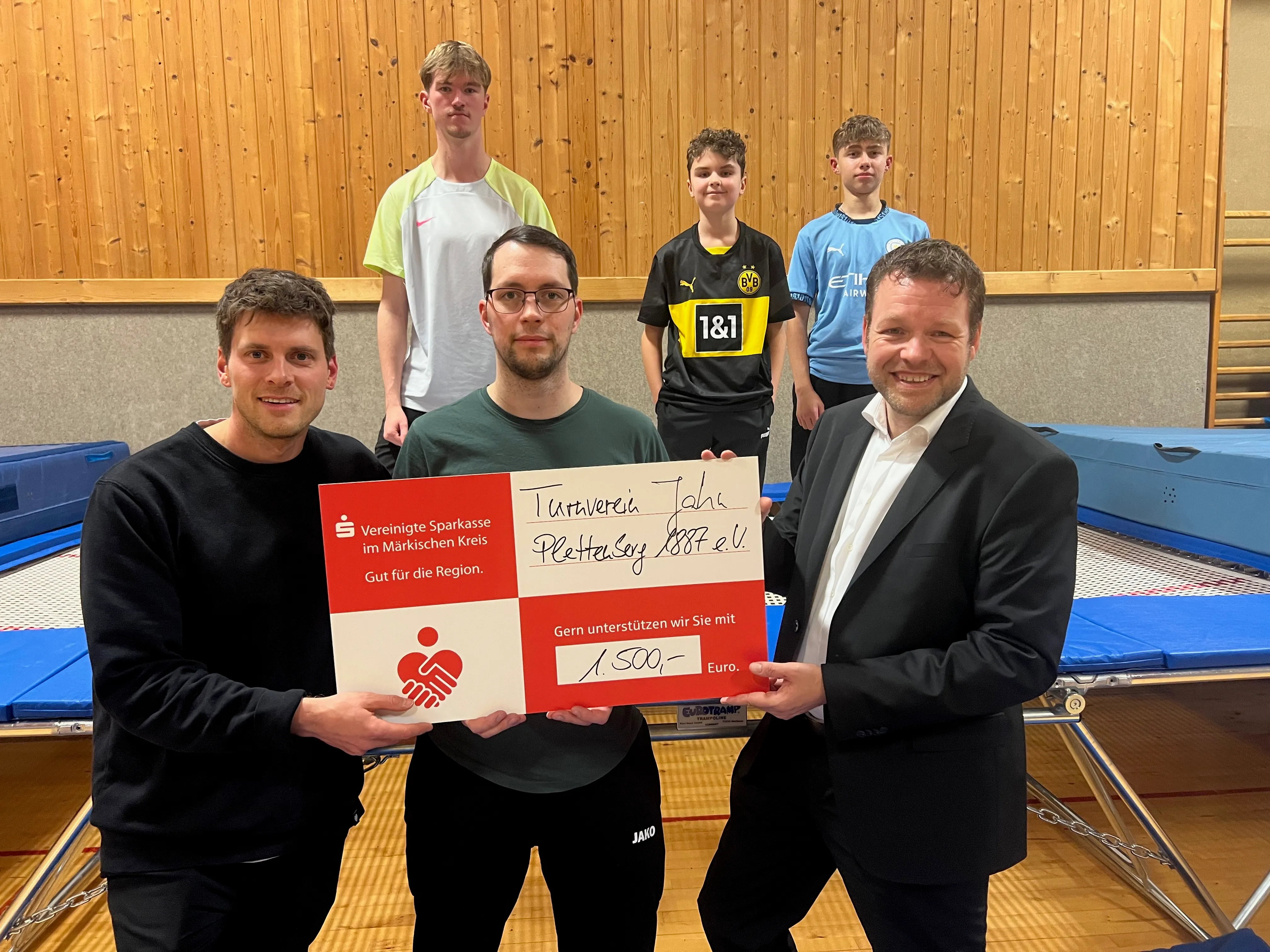 Dank der Unterstützung durch die Vereinigte Sparkasse im Märkischen Kreis konnte der TV Jahn Plettenberg das neue Trampolin erwerben. Marktbereichsleiter Michael Dabow übergab am Donnerstag, 20. November, den symbolischen Spendenscheck über 1500 Euro und konnte das neue Sportgerät beim Training des Turnnachwuchses in Augenschein nehmen. „Es ist uns eine Freude, den TV Jahn zu unterstützen“, sagte Dabow. „Die Arbeit des Vereins fördert nicht nur die sportliche Entwicklung, sondern auch den Gemeinschaftssinn und die Jugendarbeit in unserer Region.“