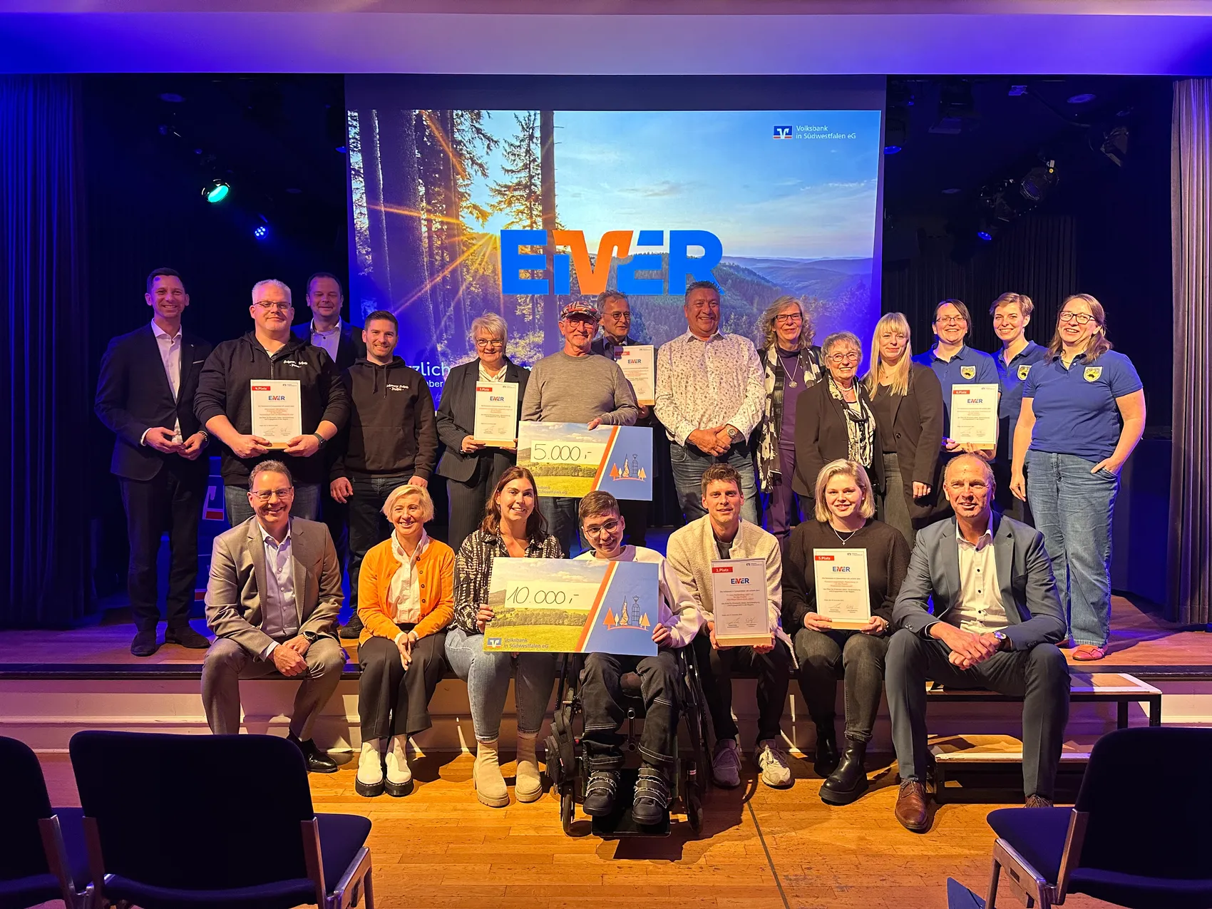 Die Volksbank lobte den EIVER-Preis zum fünften Mal aus, um das vielseitige Ehrenamt in Südwestfalen zu würdigen. Insgesamt wurden 30.000 Euro Preisgelder an die Gewinner vergeben. Sechs Vereine und Institutionen im Geschäftsgebiet der Volksbank in Südwestfalen überzeugten die Jury von ihrem Engagement für die Gesellschaft. Roland Krebs und Jens Brinkmann, Vorstände der Volksbank, übergaben die Preise bei der Siegerehrung am Montag, 10. November, in Kreuztal.