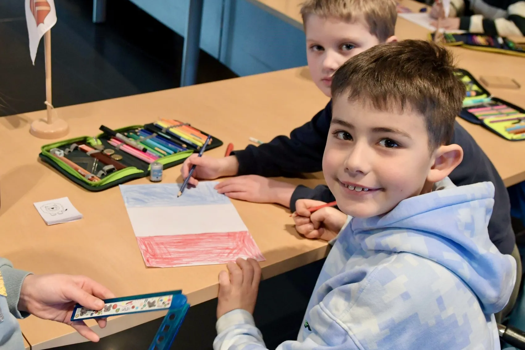 Empfangen wurden die Kinder im Rathaus von Claudia Stelse vom Fachdienst Rat und Bürgermeister. Sie vermittelte auf anschauliche und altersgerechte Weise, wie Ratsarbeit funktioniert, was Demokratie bedeutet und welche Rolle Städtepartnerschaften spielen. Dabei blieb es nicht bei der Theorie: Die Kinder lernten Lüdenscheids Partnerstädte kennen, beschäftigten sich mit deren Ländern und Flaggen – und griffen anschließend selbst zu Stiften und Farben, um diese nachzumalen.