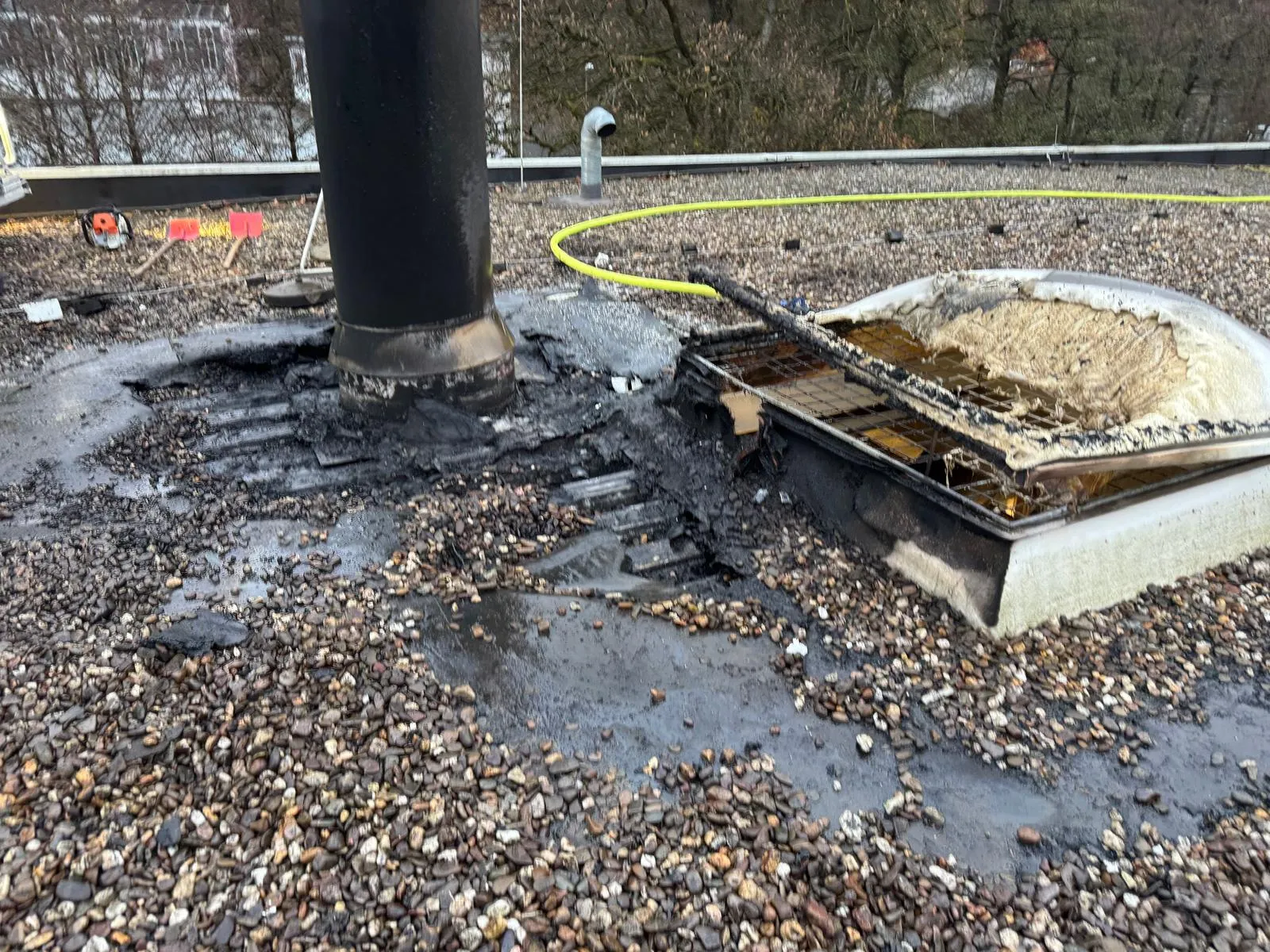 Die Dachhaut wurde an mehreren Stellen geöffnet, um Glutnester abzulöschen. Anschließend wurde mit einer Wärmebildkamera kontrolliert.