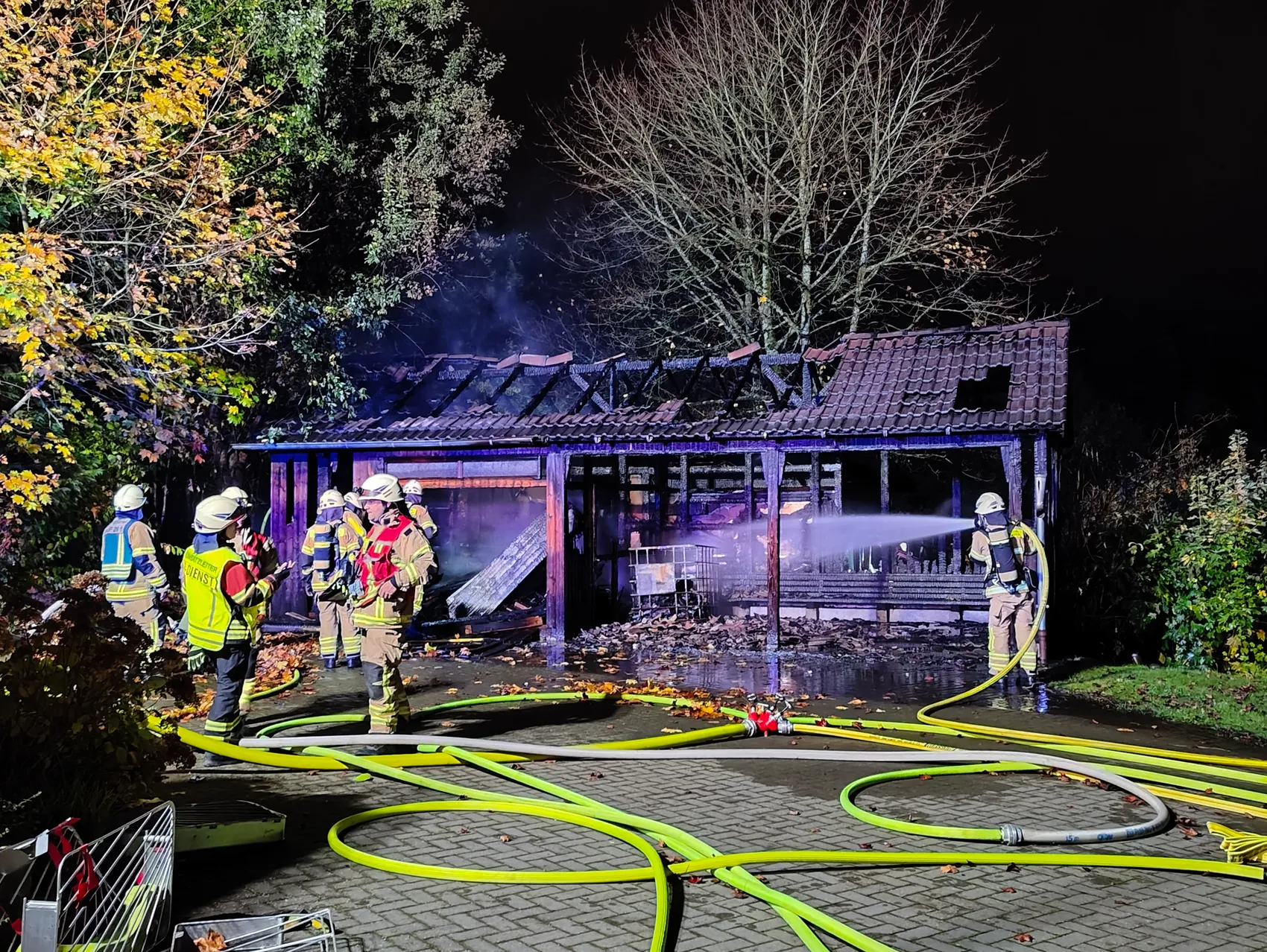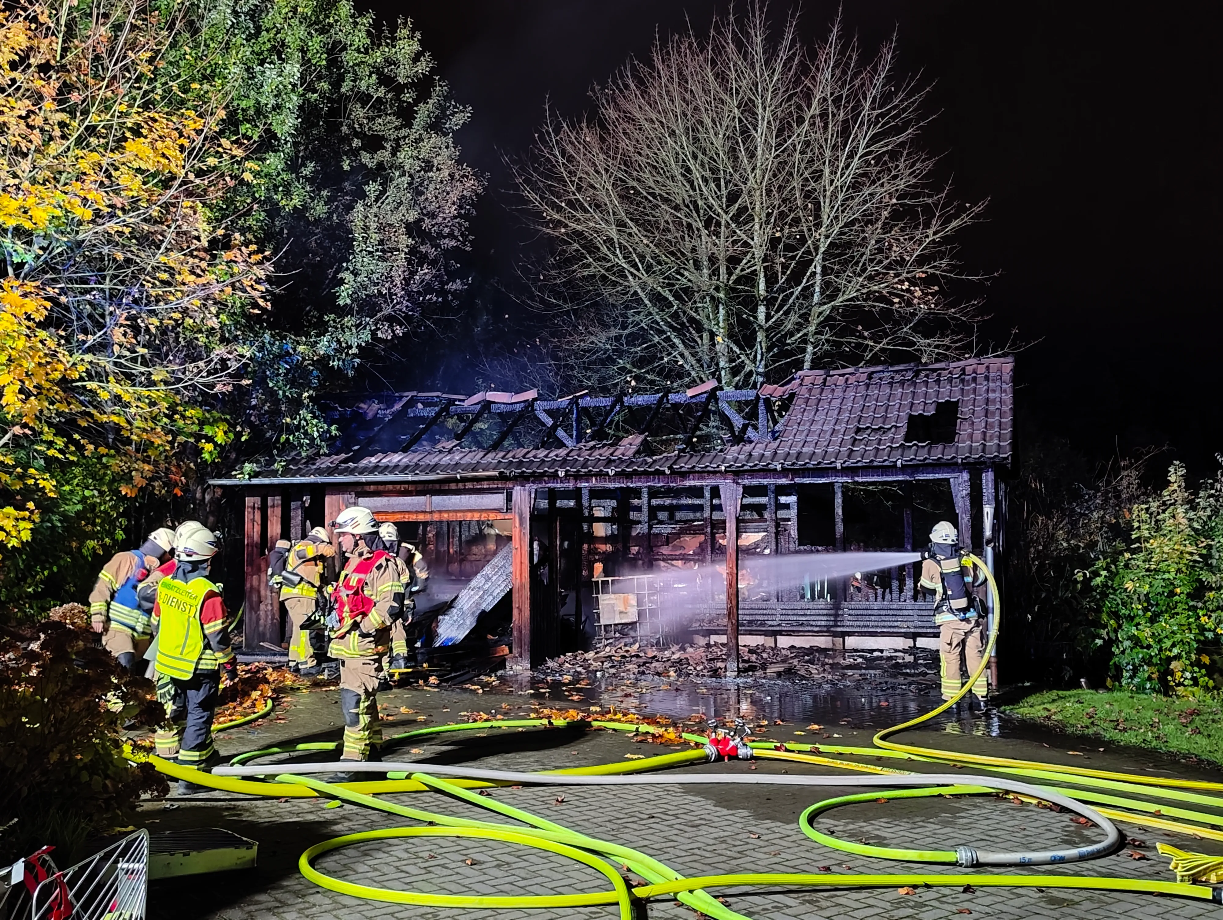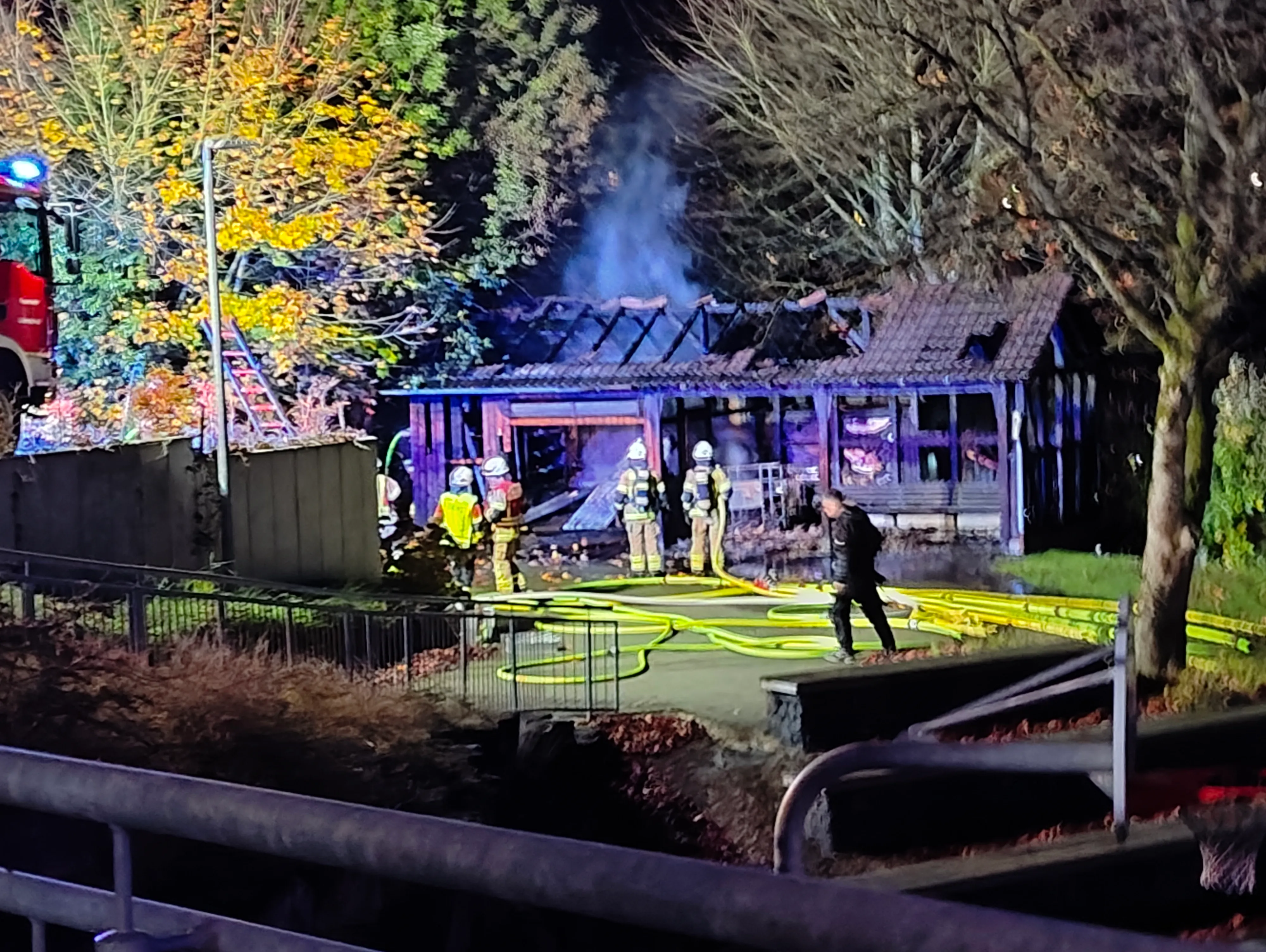 Erneut ein großer Brand im Lüdenscheider Ortsteil Worth: Zu einer brennenden Holzhütte rückten am Montagabend, 20. Oktober, die Kräfte der hauptamtlichen Wache und der Löschzug Lüdenscheid-Stadtmitte aus.