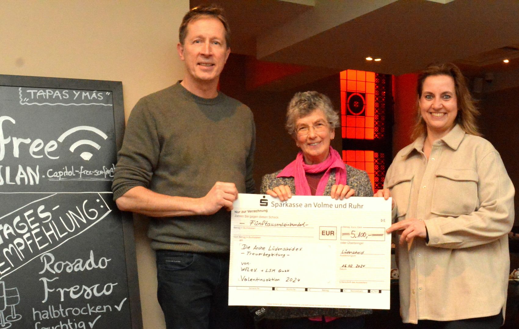 Am Freitag (16. Februar) übergaben Katja Schlorff, Lüdenscheider Stadtmarketing GmbH (LSM), und Marc Tegtmeyer, „Wir für Lüdenscheid“ den symbolischen Spendenscheck über 5100 Euro an Margit Hillesheim. Sie ist Mitbegründerin der Arche Lüdenscheid und Vorsitzende des Vereins „Die Arche Lüdenscheid e. V.“