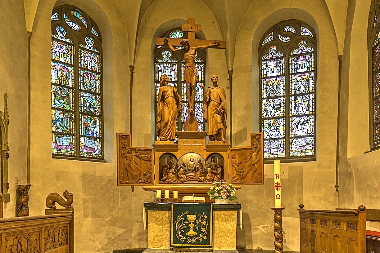 Und jetzt, nach der Renovierung? Es ist nicht zu glauben und macht fassungslos. Nunmehr wurde die Predella mit der Kreuzigungsgruppe auf der Nordseite neben der Orgel in eine Ecke gequetscht, die um ein Vielfaches kleiner ist als der Chorraum. Dabei hatten die Kritiker seinerzeit argumentiert, der Altar sei zu wuchtig für den Chorraum, was natürlich absurd ist! Wie kein anderer sakraler Gegenstand, auch die Fenster nicht, verkörpert er die christliche Heilsbotschaft in anschaulicher Weise: Abendmahl, Kreuzigung, Auferstehung und Himmelfahrt Christi. Was ist daran eigentlich so störend, dass man ihn in die äußerste Ecke verbannt?