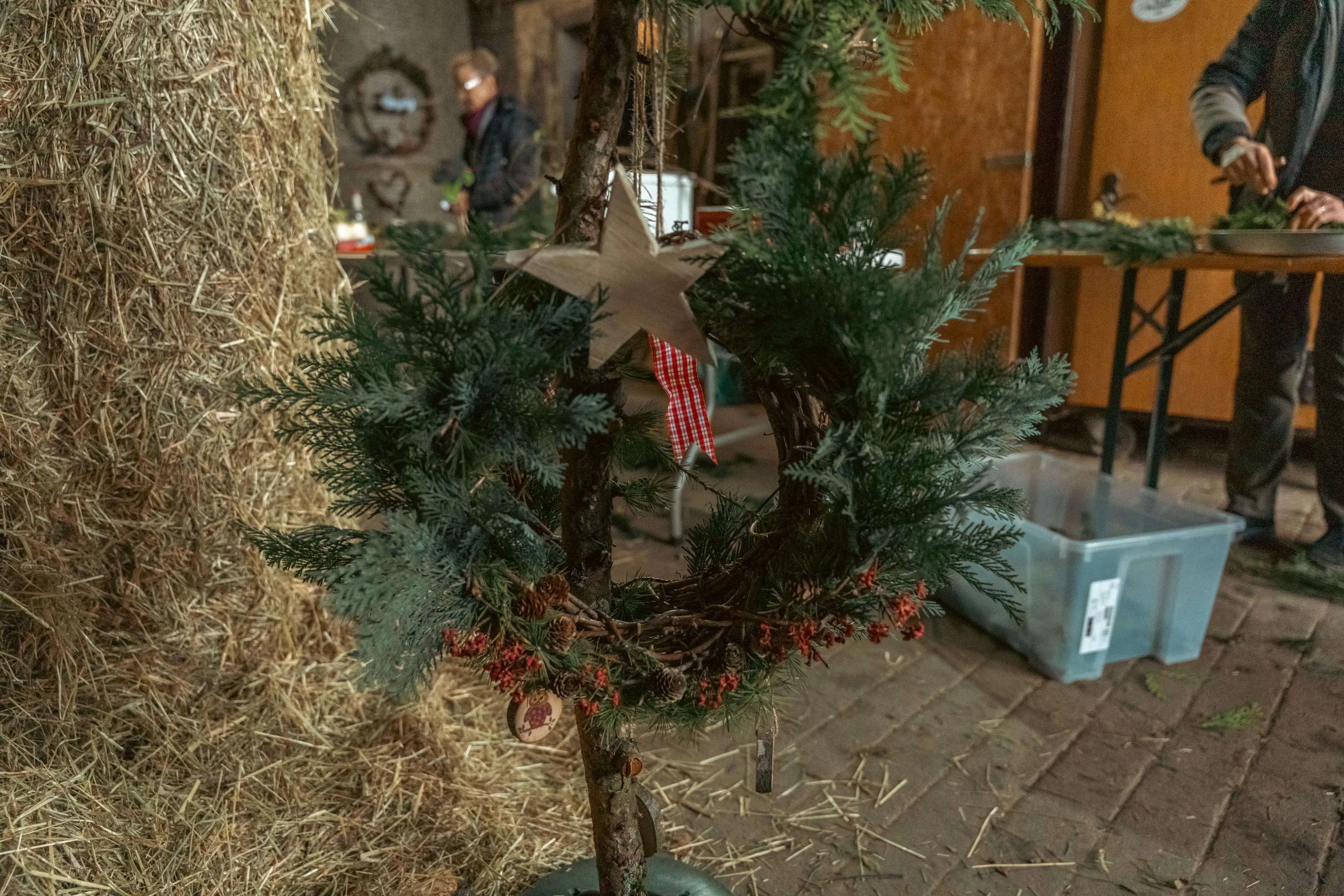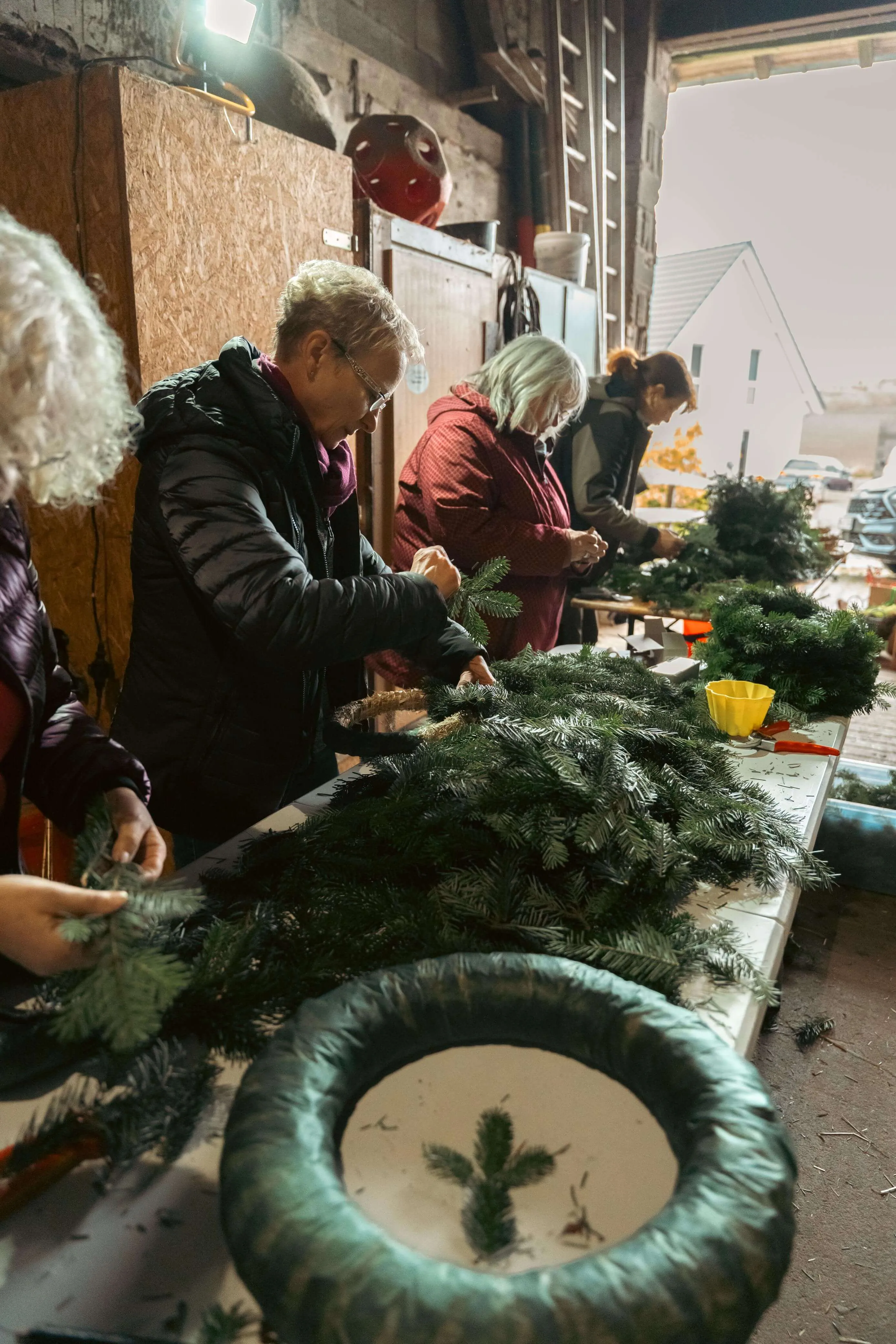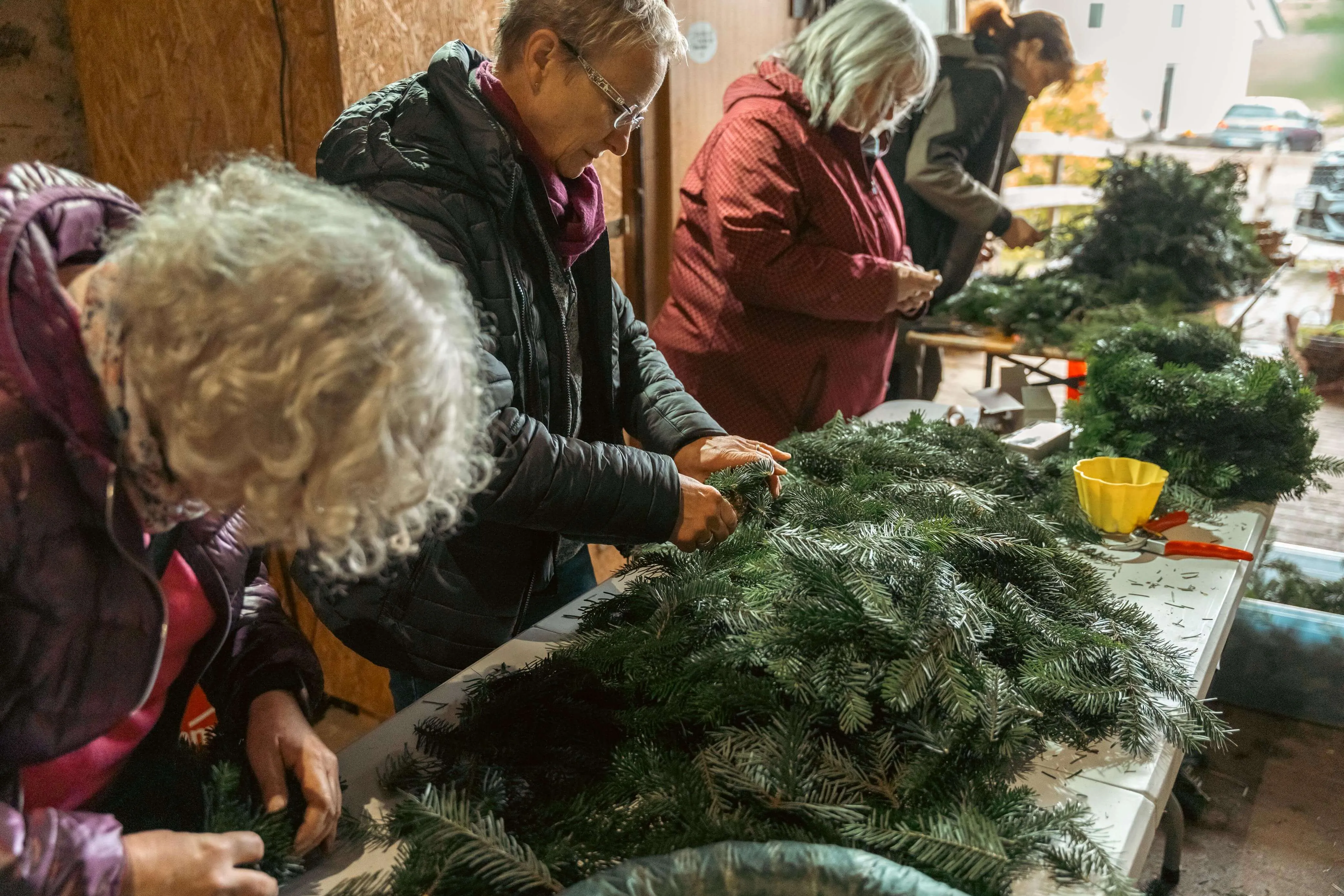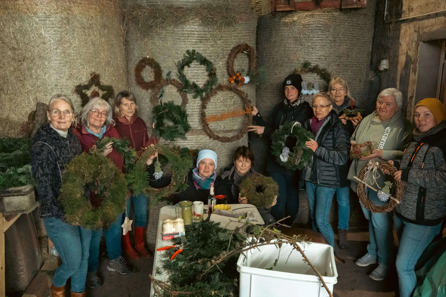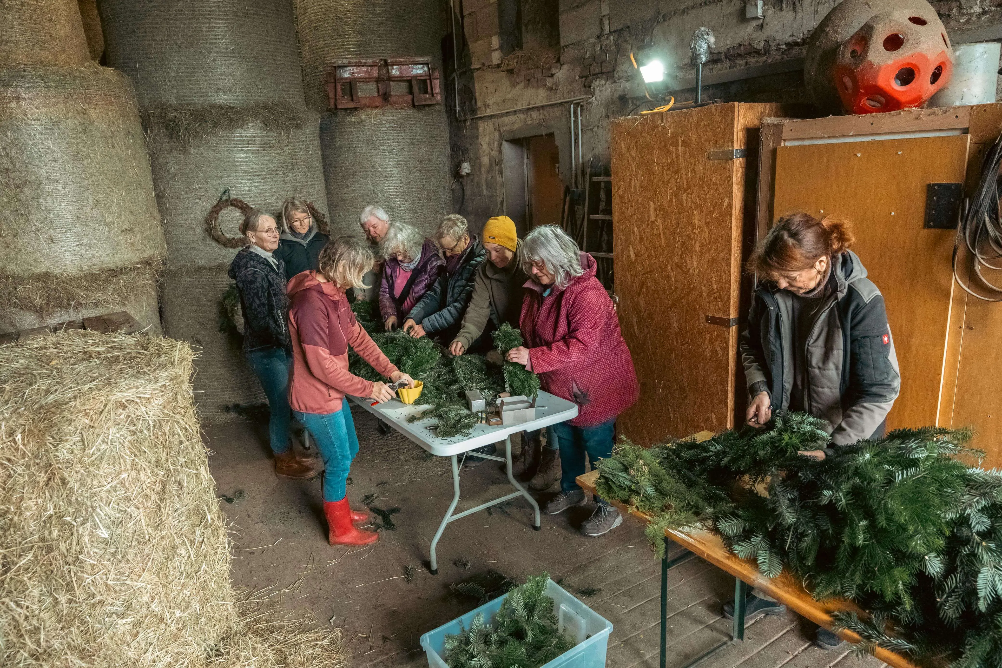 Schon früh am Morgen treffen sich die Frauen auf dem Heuboden von Familie Pühl in Haste. Im Gepäck haben sie Weinranken, Tannengrün, getrocknete Blumen, Rosenscheren und Vieles mehr. Denn heute soll gebastelt werden. Winterliche Tür- und Tischkränze sollen entstehen. Alle freuen sich auf den Markt und packen gerne mit an. Denn, wenn es schon so eine Möglichkeit in Wiblingwerde gibt, dann wolle man sich selbstverständlich auch daran beteiligen.