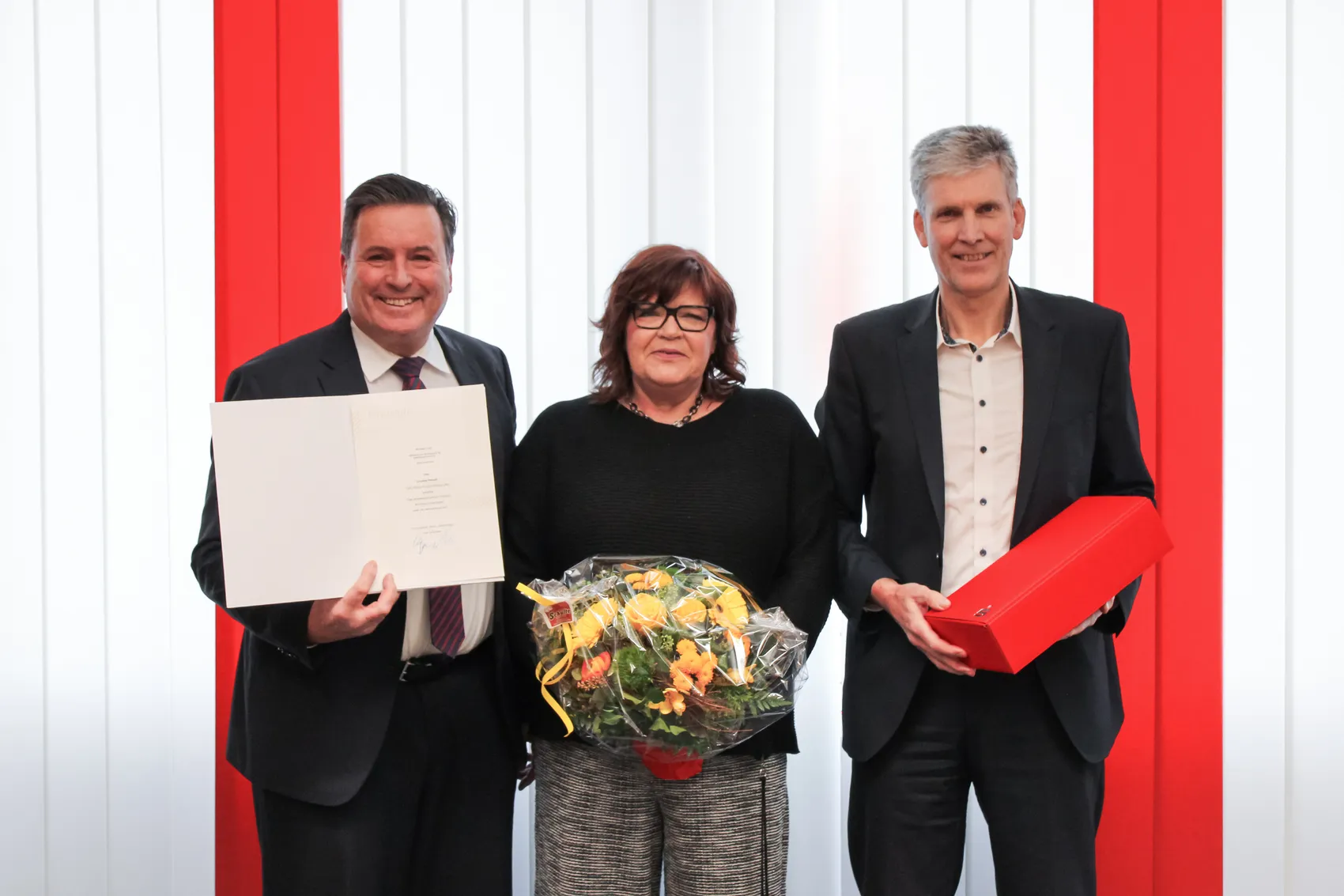 Drei Dienstjubiläen werden bei der Vereinigten Sparkasse im Märkischen Kreis gefeiert. Heike Crummenerl und Lothar Schulte arbeiten seit 40 Jahren, Cornelia Prenzel arbeitet seit 25 Jahren bei der Sparkasse.