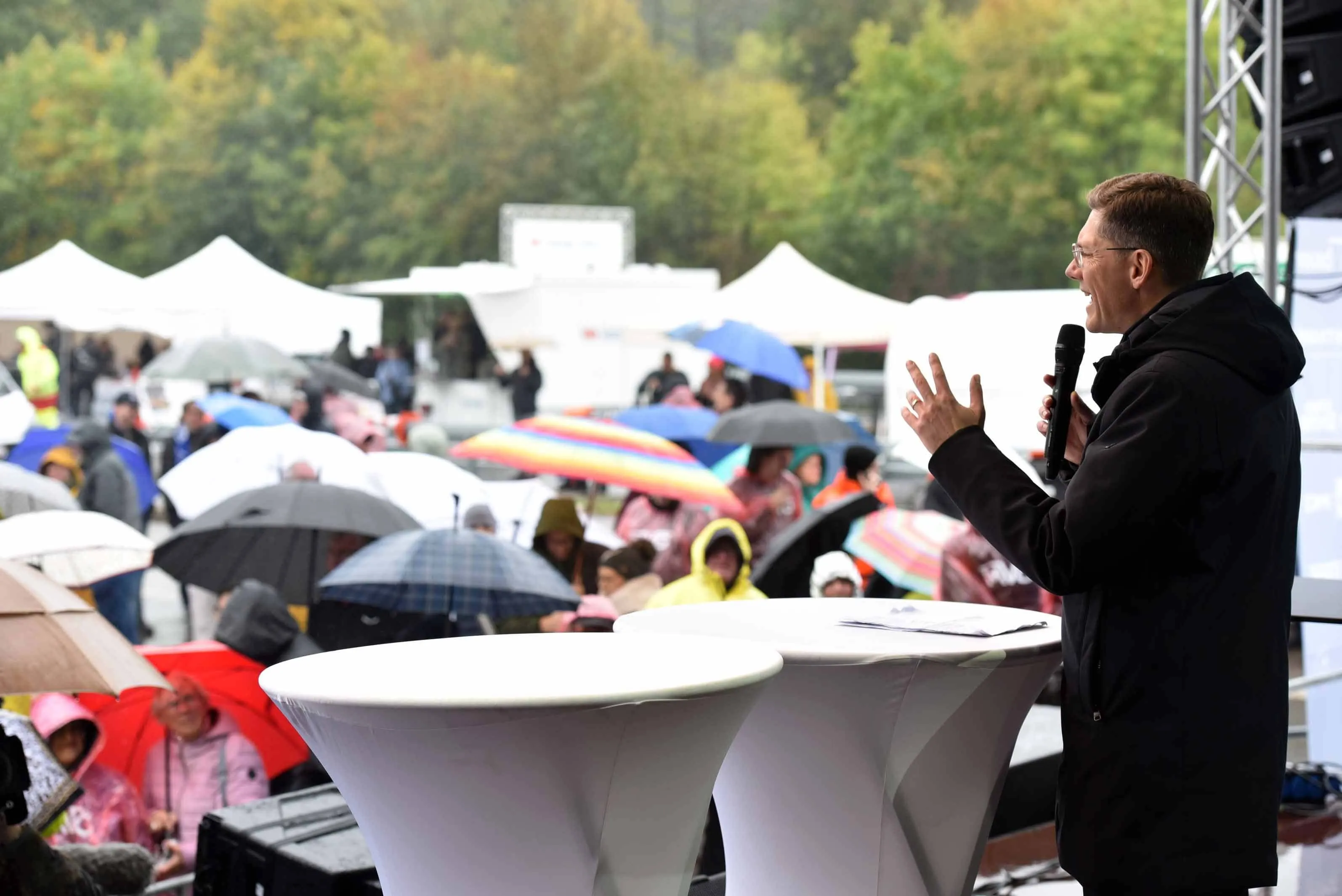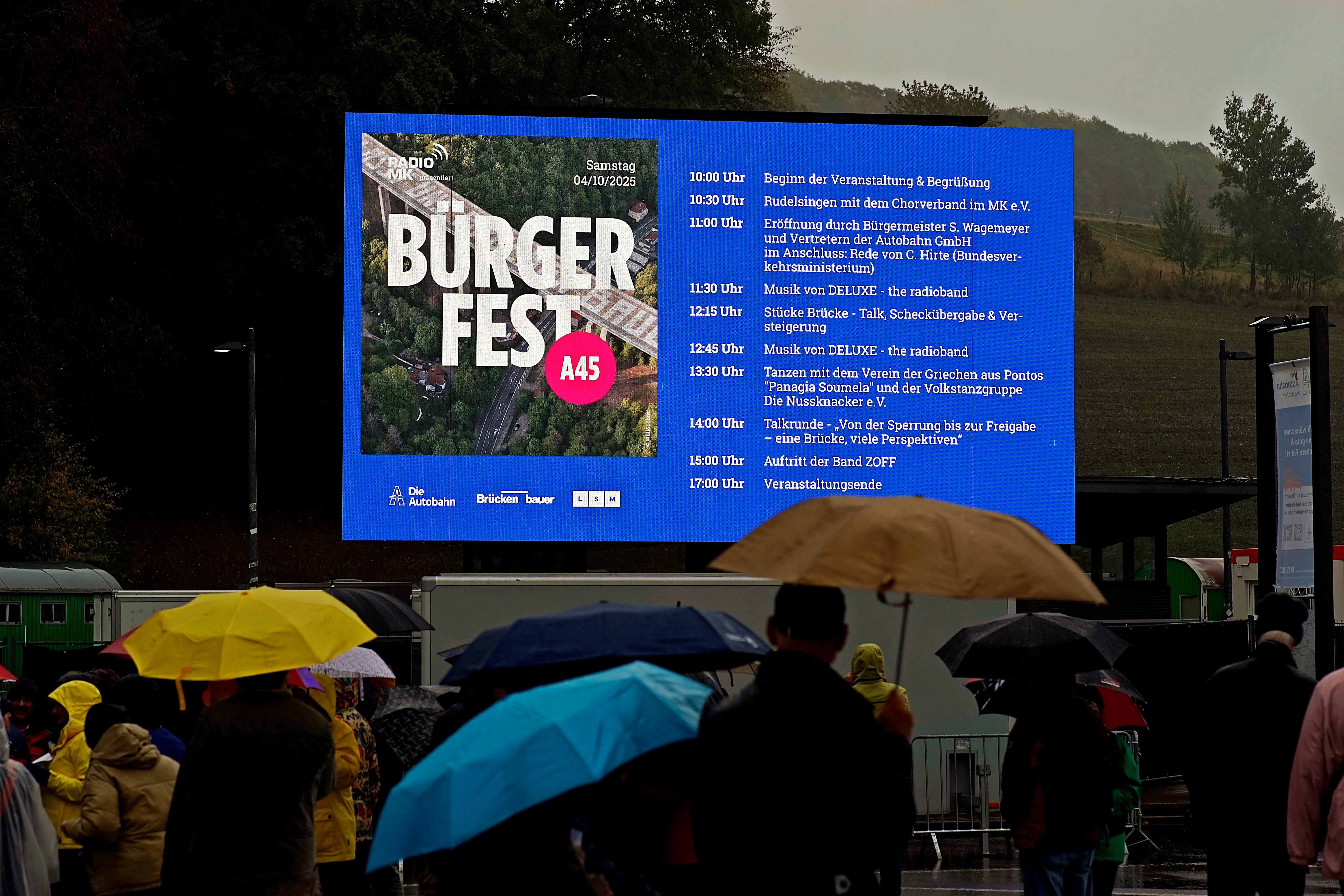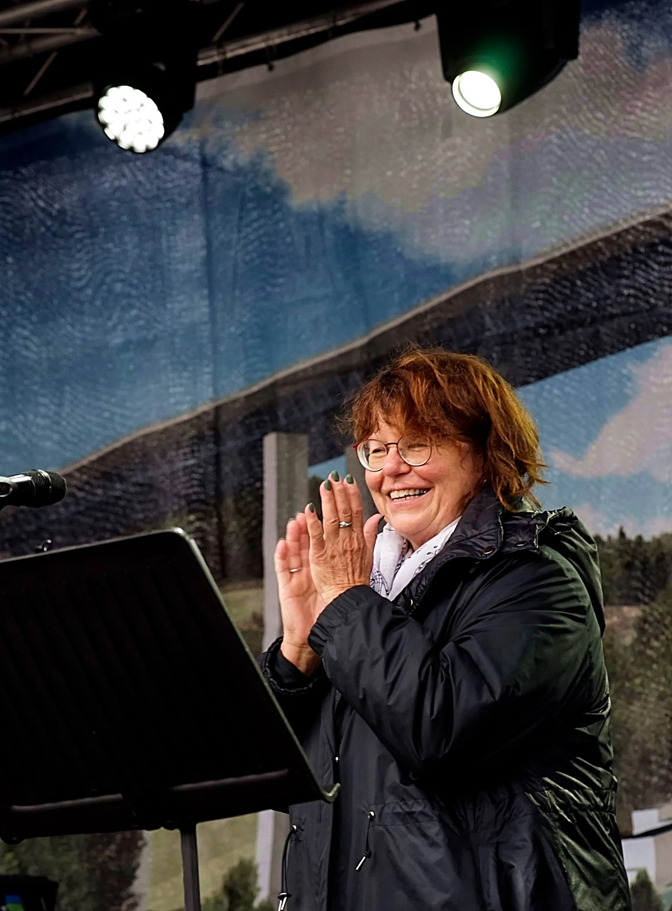 „Heute wird ein herrlicher Tag“ sangen Maidi Langenbartels und Co vom Chorverband im Märkischen Kreis – zum erhofften Rudelsingen kam es auf dem A45-Rastplatz Hunscheid allerdings nicht. Zu spärlich war das Publikum vor der Bühne und angesichts des Wetters am Vormittag dachte so mancher an Realsatire. Aber: Wer ausharrte, erlebte zwei unterschiedliche Halbzeiten des A45-Bürgerfestes.
