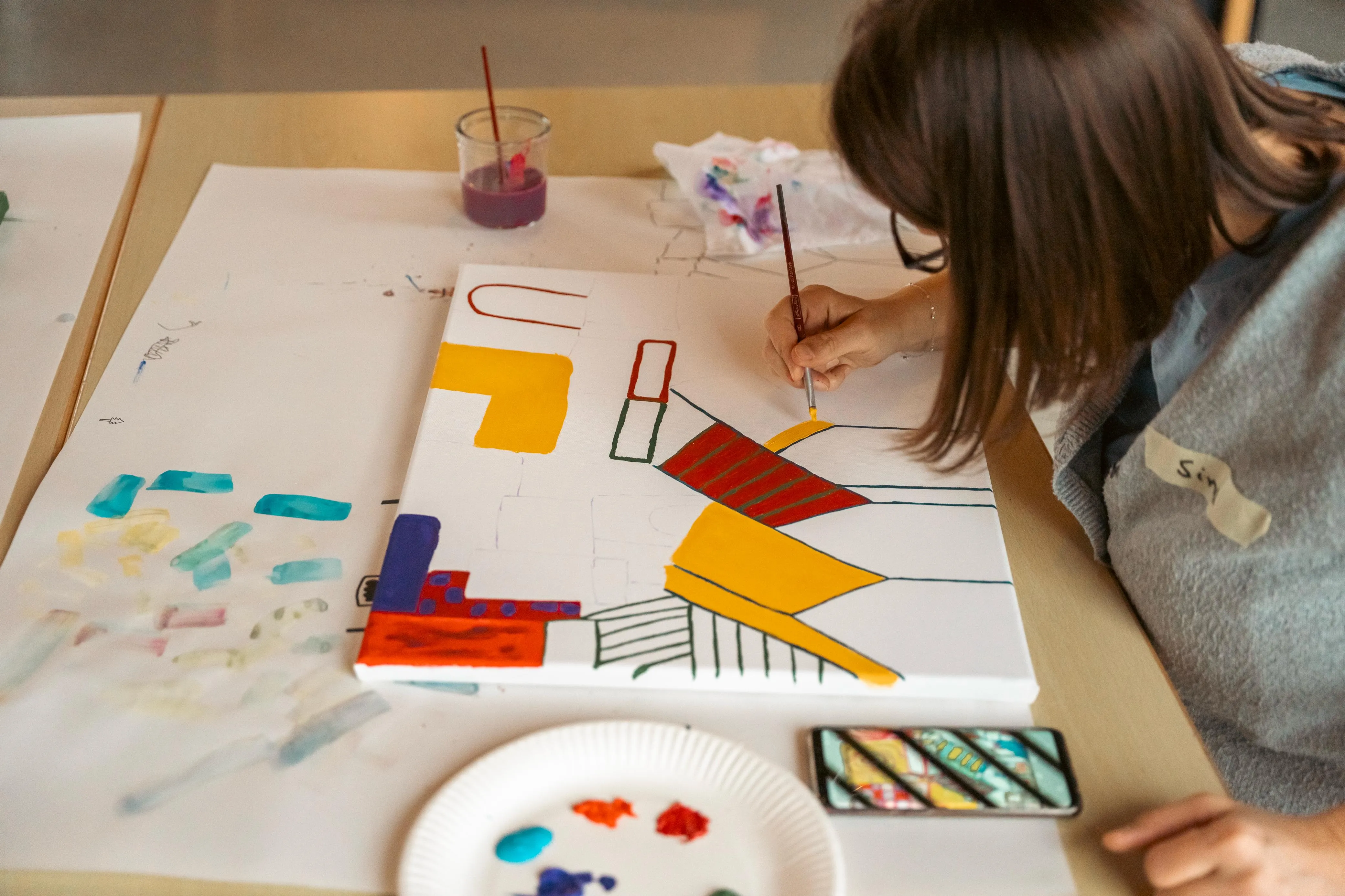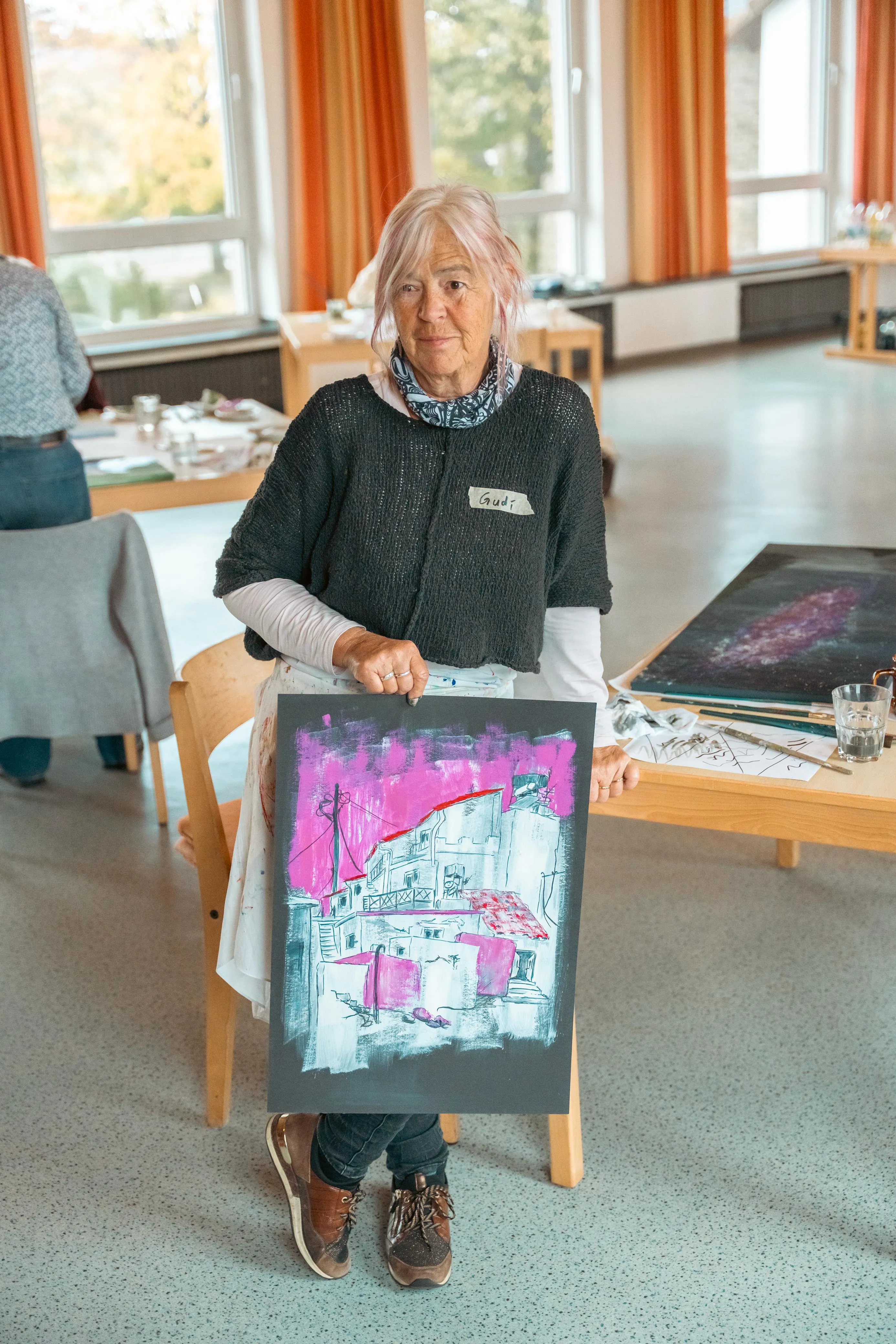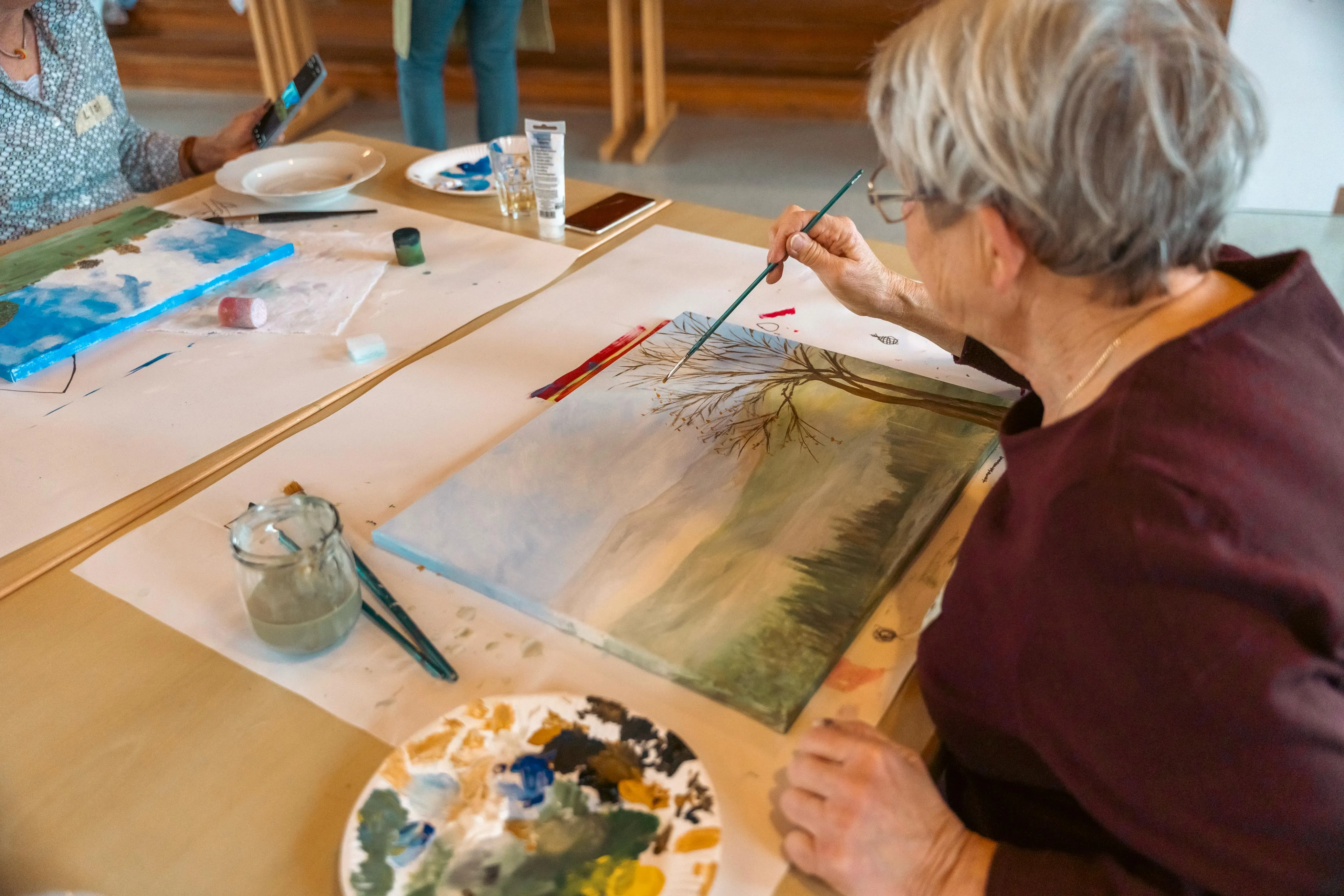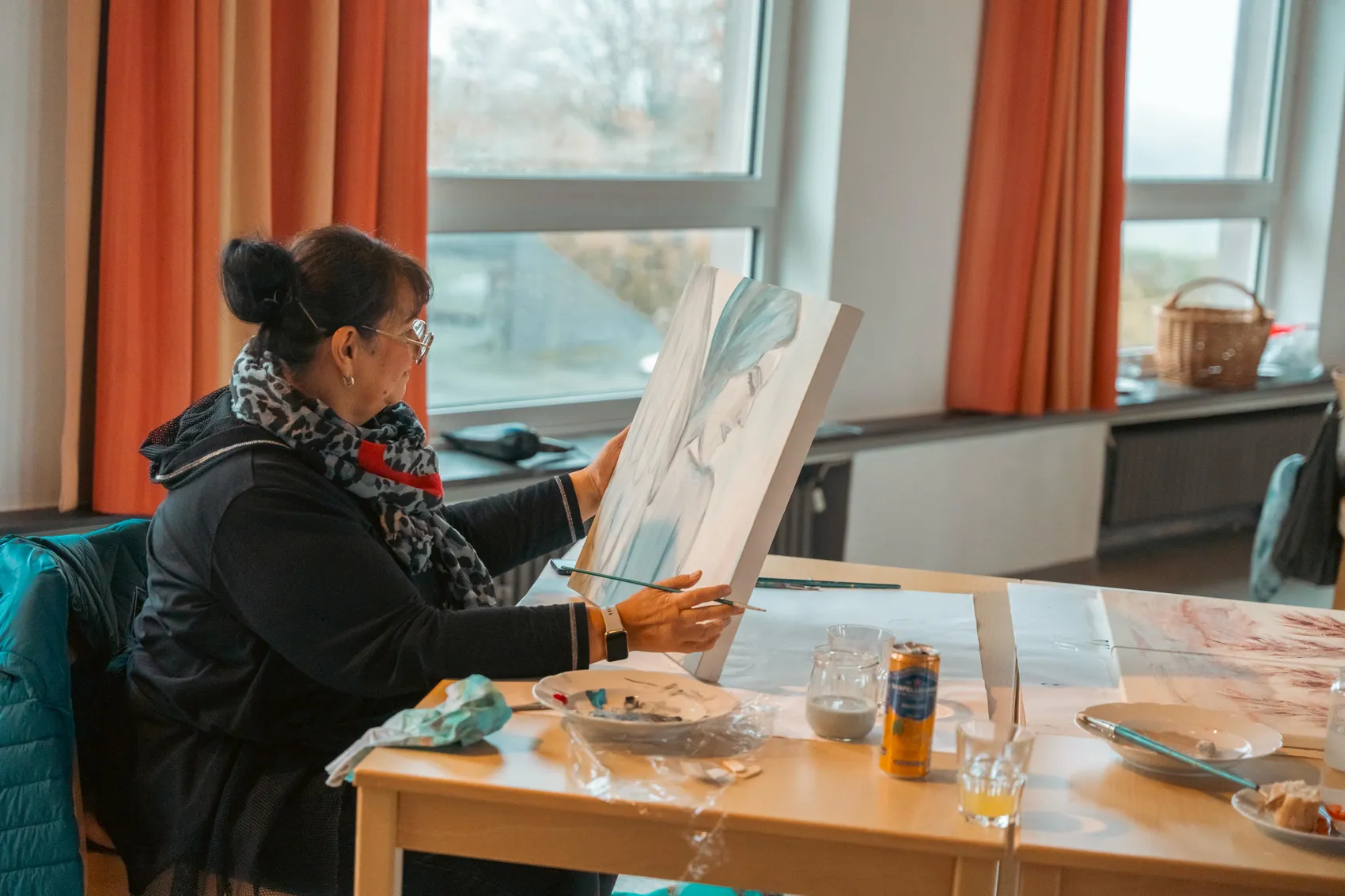 Gudi Mausbach-Dahl stand den Malern beratend zur Seite. Die Halveranerin gab zudem zahlreiche Tipps. Zum Beispiel sei es manchmal hilfreich, das Gemälde aus einer größeren Entfernung zu betrachten oder auch verschiedene Maltechniken zu verwenden, wie klassisch den Pinsel oder aber auch mal mit einem Schwamm die Farbe aufzutragen.