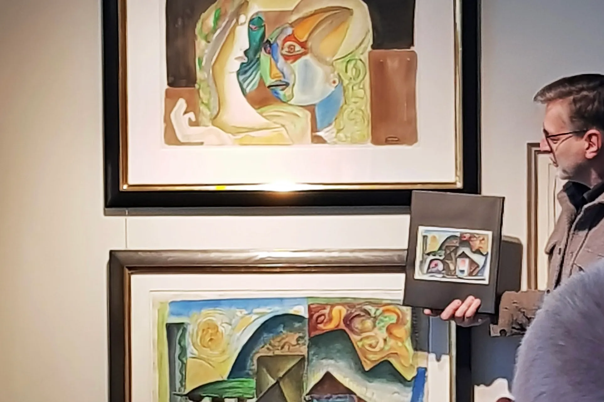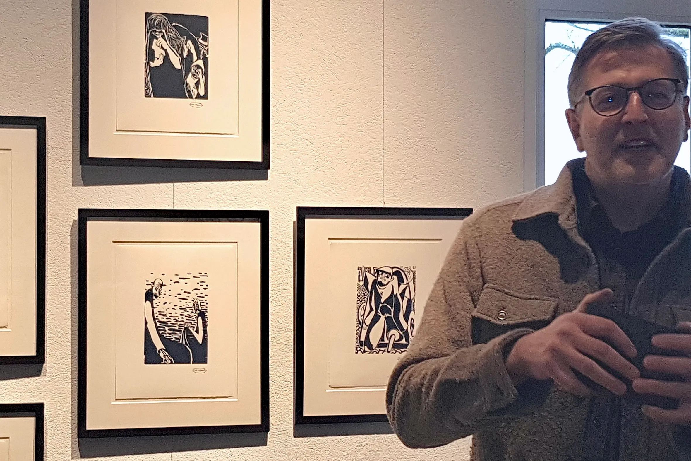 Detlev Kümmel, Galerist aus Brügge, stellt einen Teil seiner Müller-Sammlung aus. Die Bilder, Radierungen, Holzschnitte, Collagen erinnern an die Großen der Kunstszene. Neben Picasso an Georges Braque, Otto Dix oder Max Beckmann. Bei Kümmels Führung durch die Ausstellung wurde am Sonntag, 25. Januar, aber deutlich: der Maler, Grafiker und Autodidakt Müller orientierte sich an Stilen und Motiven, formte aus diesen Impressionen aber einen eigenen Stil. „Müller hat es etwas einfacher gemacht“, beschreibt Kümmel den Unterschied etwa zu Picasso. So hat er dunkle Töne eingesetzt, um andere Bereiche hervorzuheben oder Stimmungen betont.