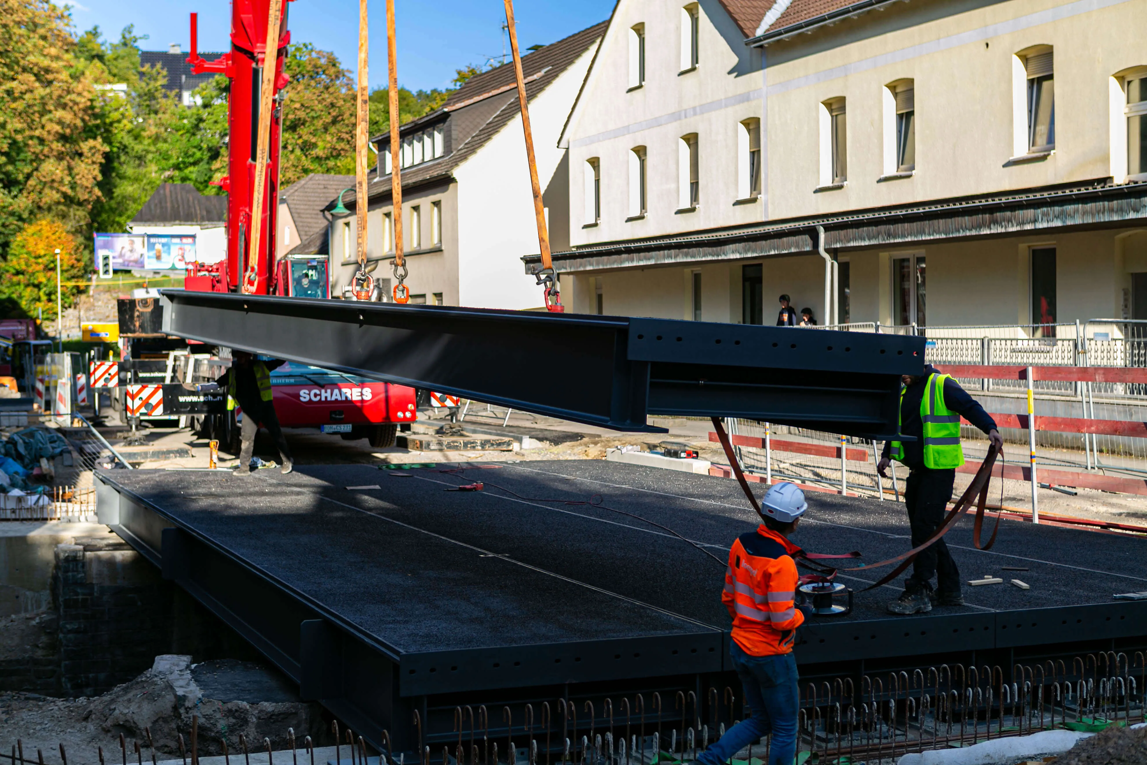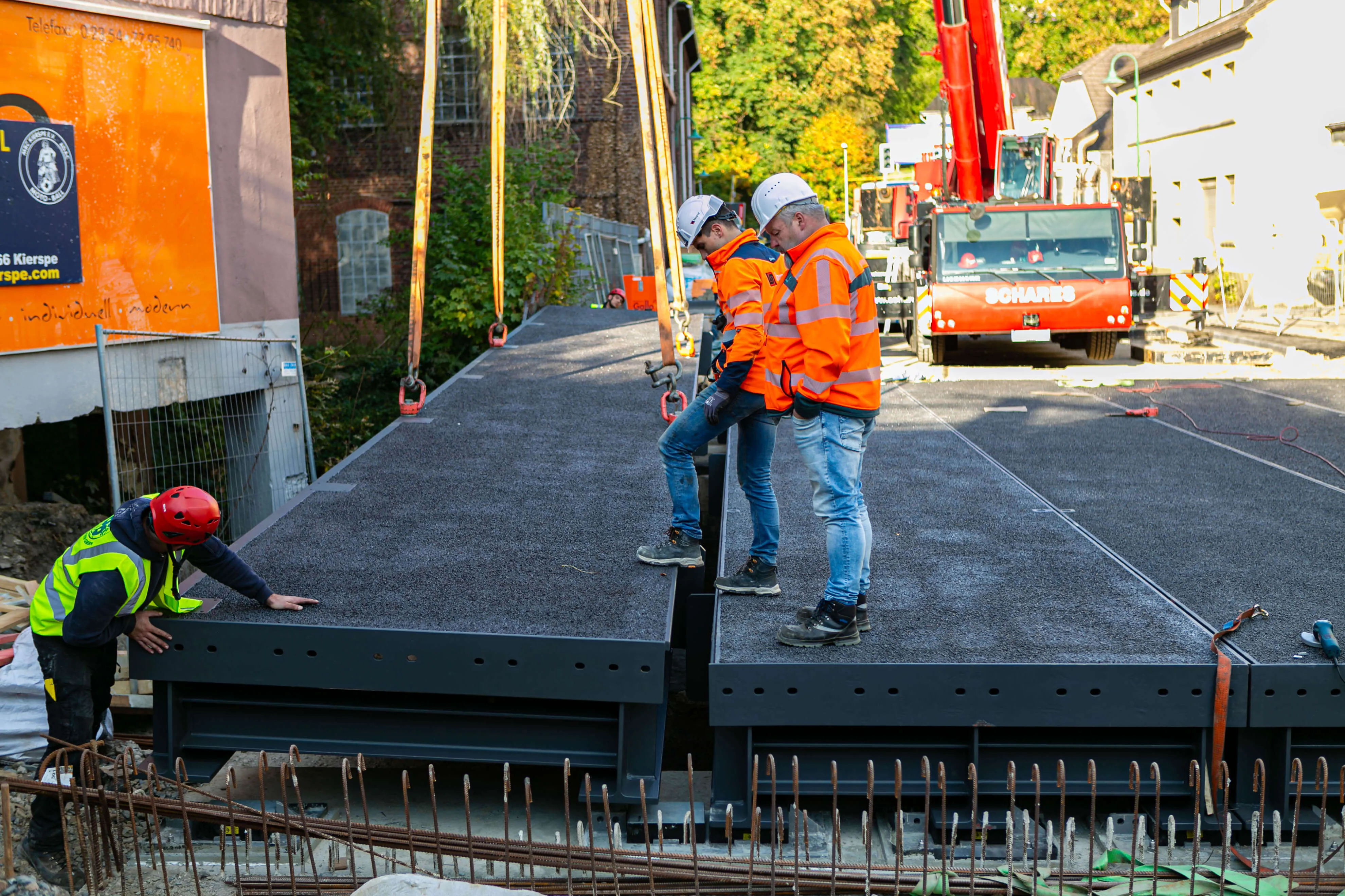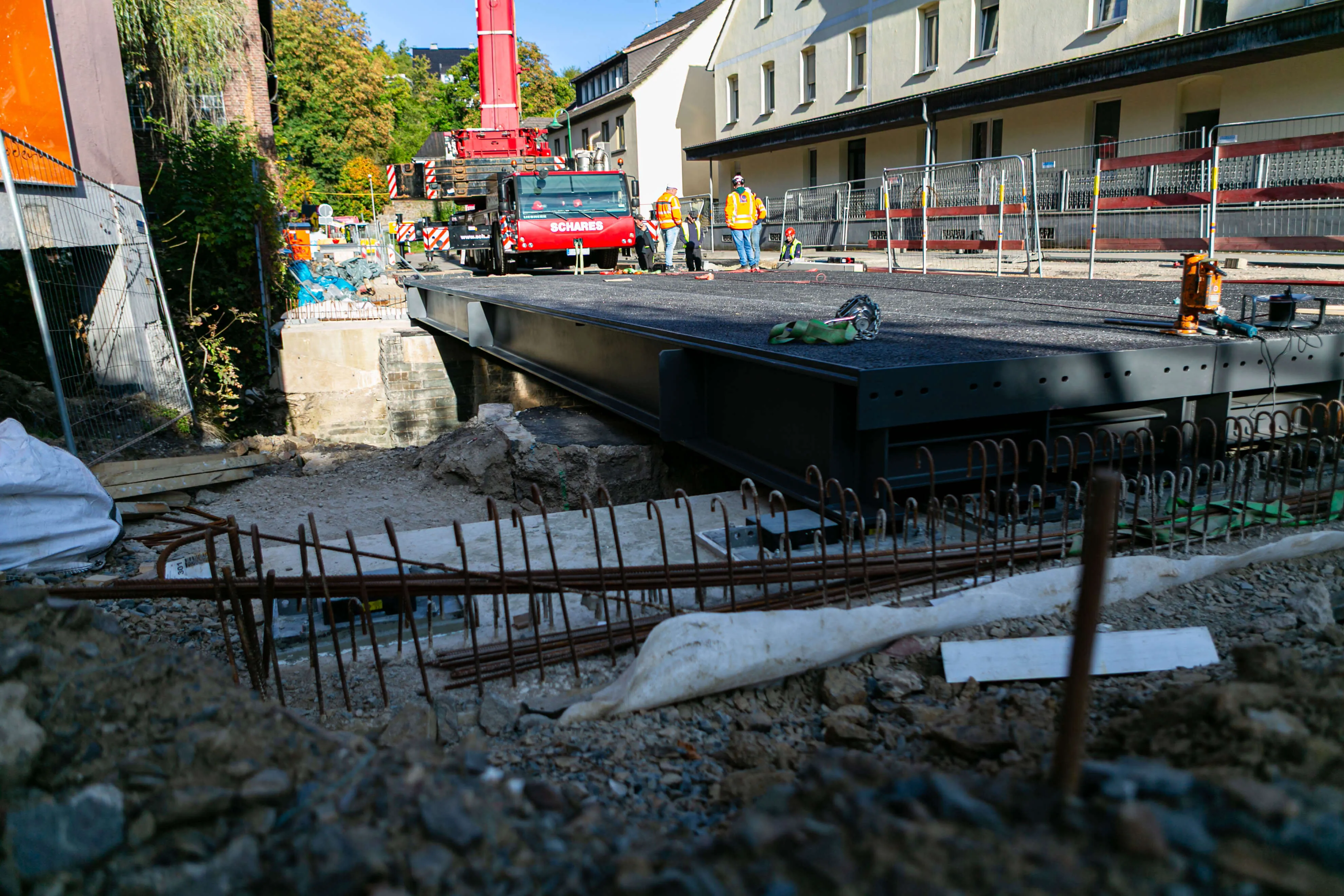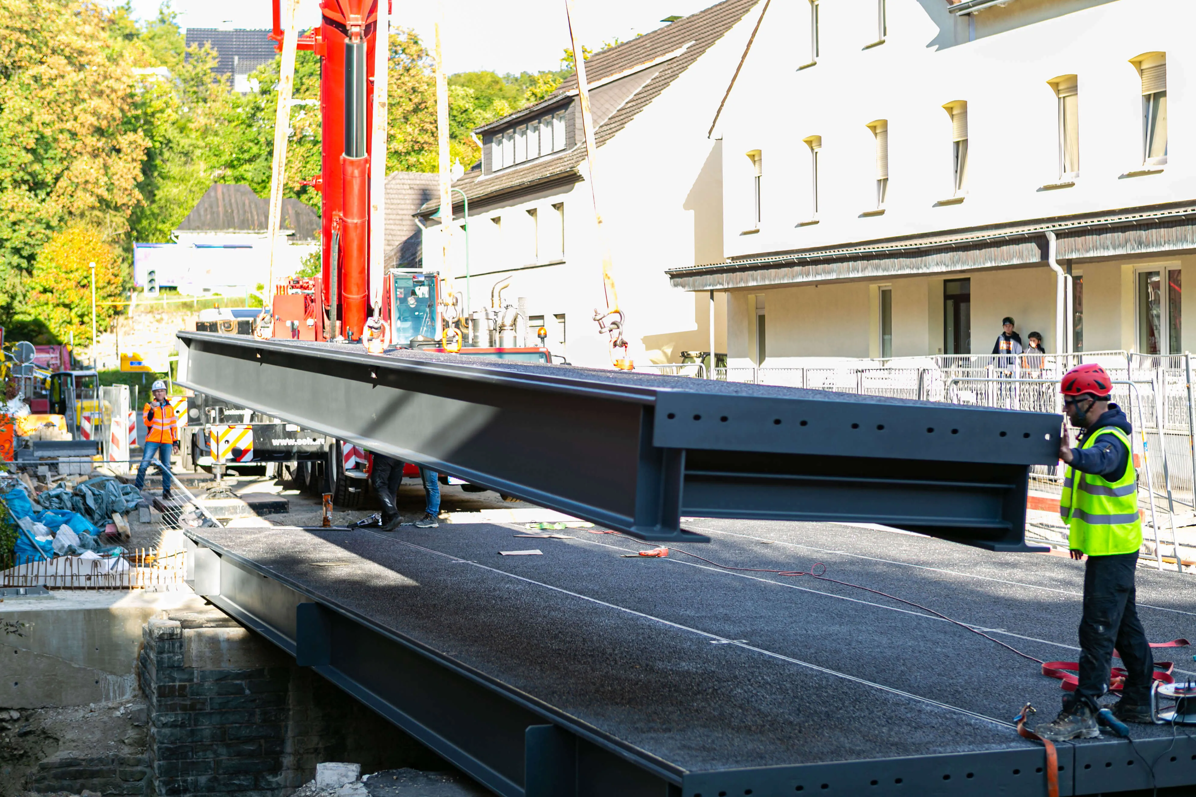 Dabei bestehen die rund 20 Tonnen schweren Elemente allesamt aus einem Rahmen aus Metall, auf den die metallene Fahrbahnplatte aufgeschweißt ist. Auf diese Platte ist die Deckschicht aufgebracht, auf der in wenigen Wochen Autos und Lkw fahren werden. Am Donnerstag, 2. Oktober, werden die Geländer an der Brücke angebracht, in den darauffolgenden Wochen, so erklärt Michael Schanzenberger, der bei Straßen.NRW für die Bauaufsicht zuständig ist, folgen die Restarbeiten. Diese umfassen vor allem den Übergang von der bisherigen Straße auf die Brücke sowie eine neue Deckschicht auf der B237 (Kölner Straße).