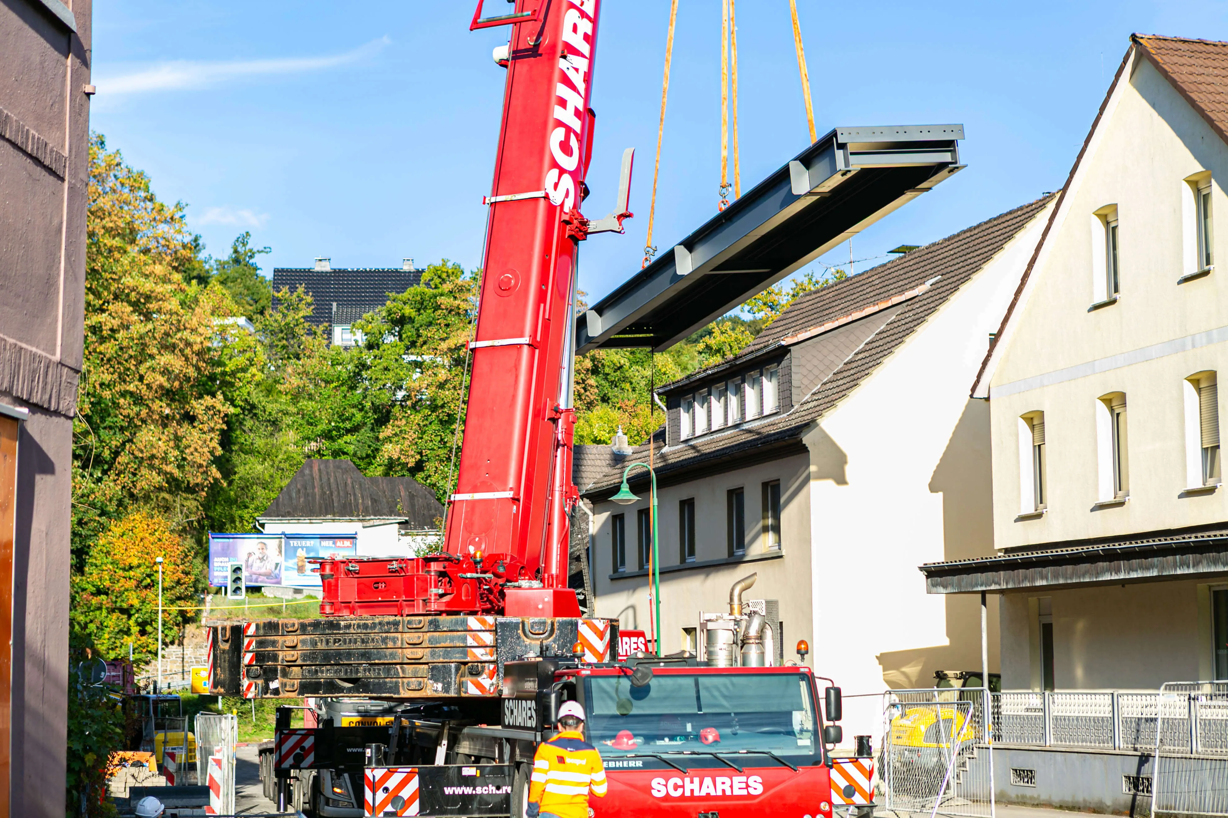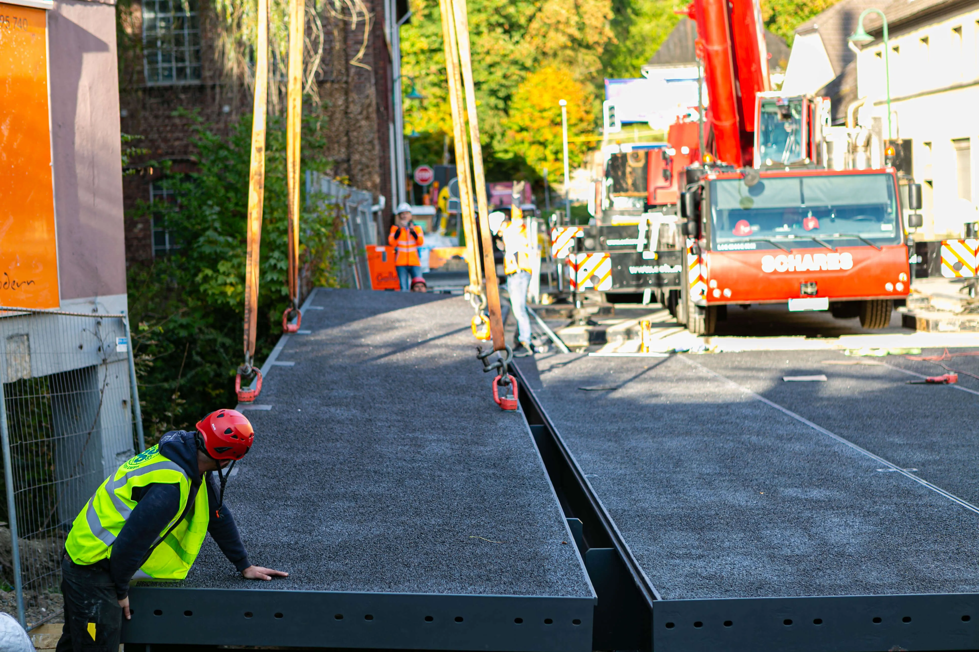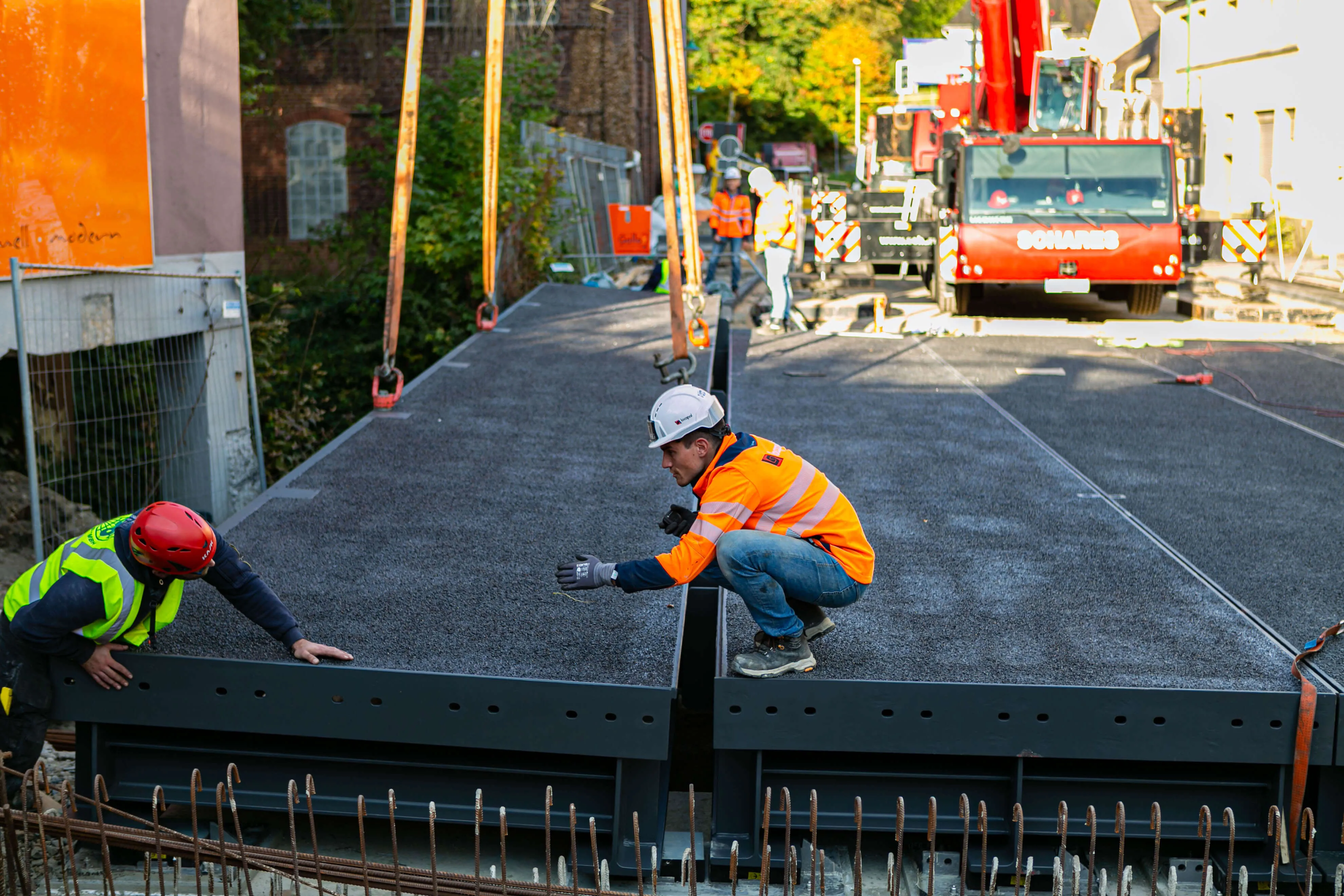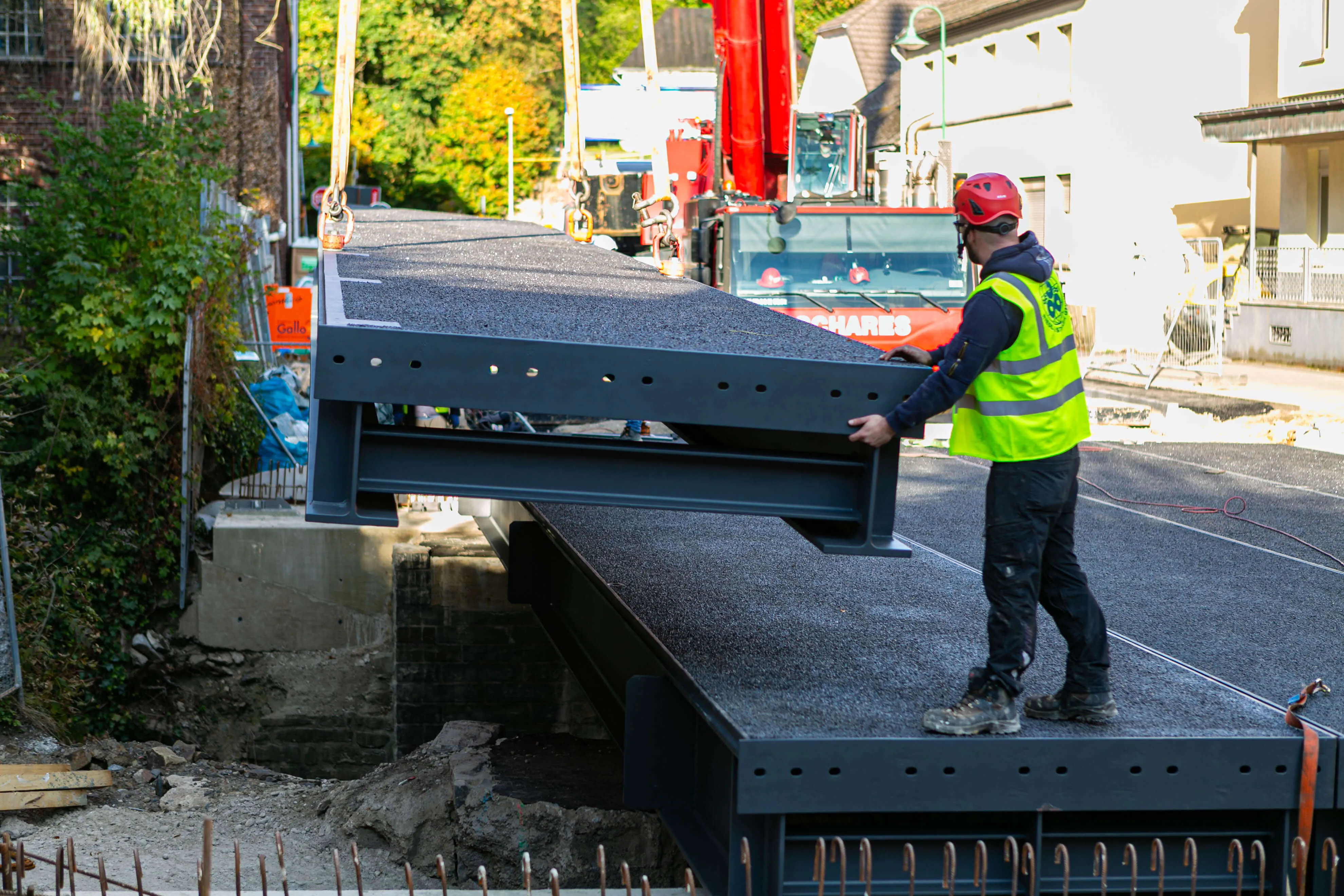 Dabei bestehen die rund 20 Tonnen schweren Elemente allesamt aus einem Rahmen aus Metall, auf den die metallene Fahrbahnplatte aufgeschweißt ist. Auf diese Platte ist die Deckschicht aufgebracht, auf der in wenigen Wochen Autos und Lkw fahren werden. Am Donnerstag, 2. Oktober, werden die Geländer an der Brücke angebracht, in den darauffolgenden Wochen, so erklärt Michael Schanzenberger, der bei Straßen.NRW für die Bauaufsicht zuständig ist, folgen die Restarbeiten. Diese umfassen vor allem den Übergang von der bisherigen Straße auf die Brücke sowie eine neue Deckschicht auf der B237 (Kölner Straße).