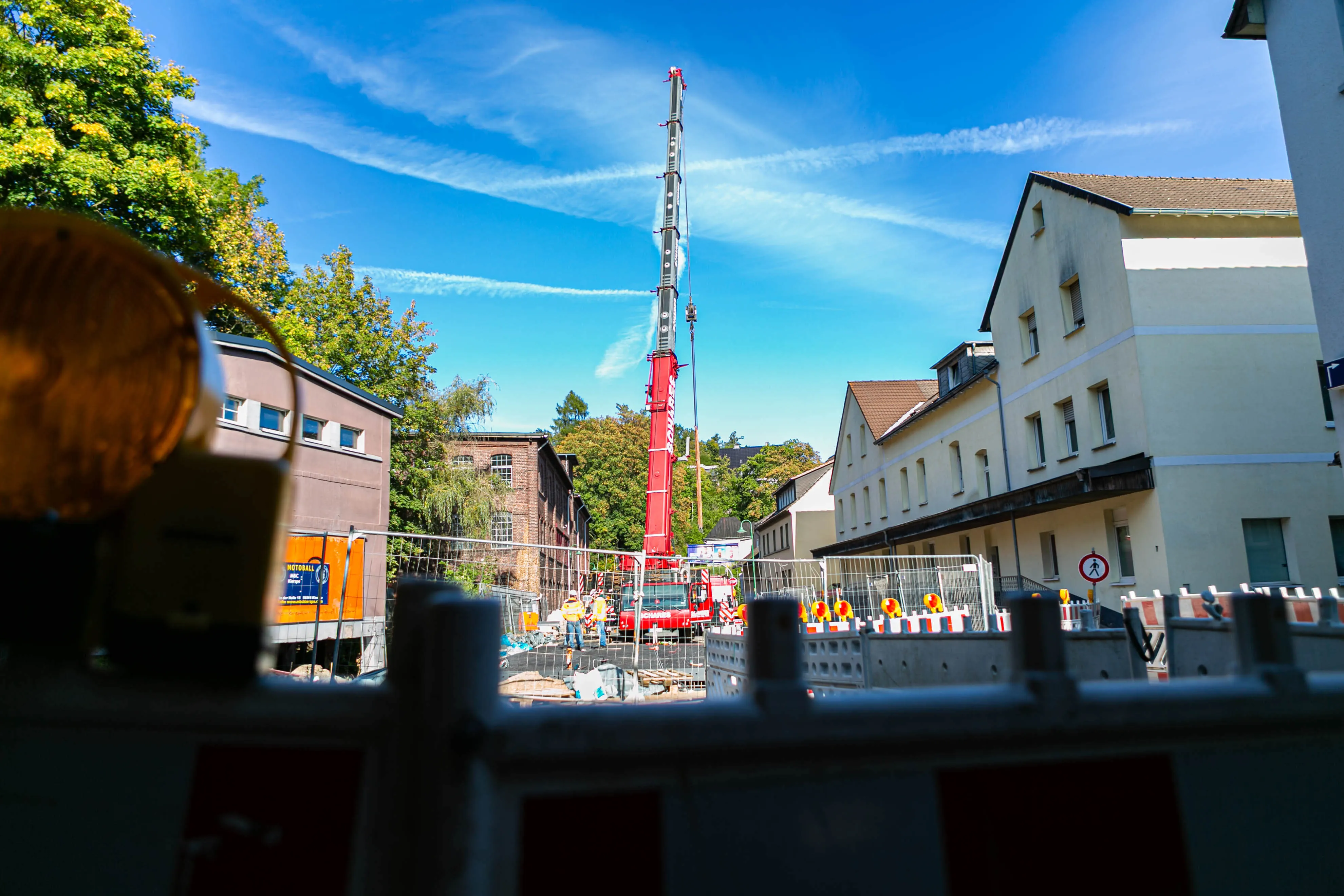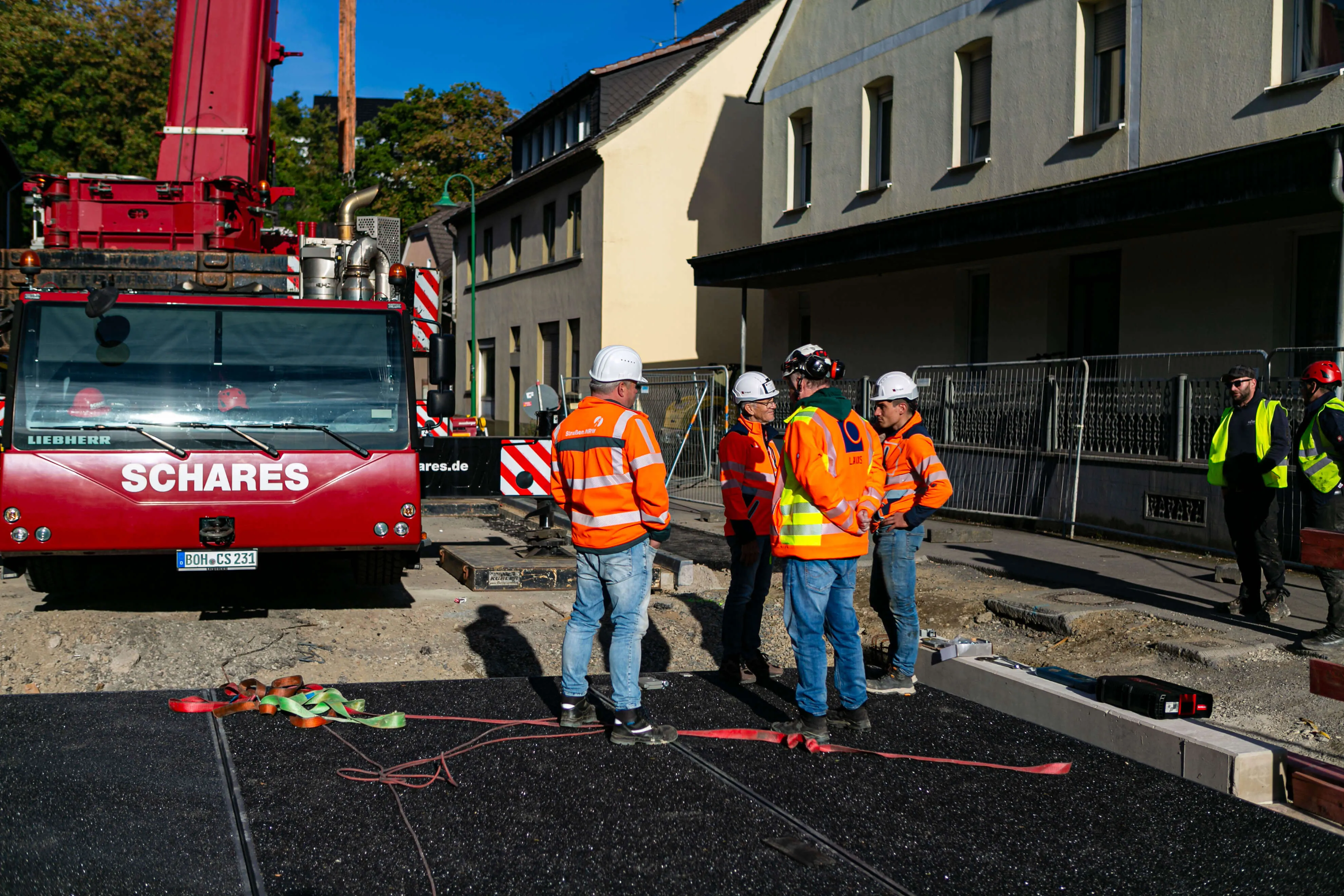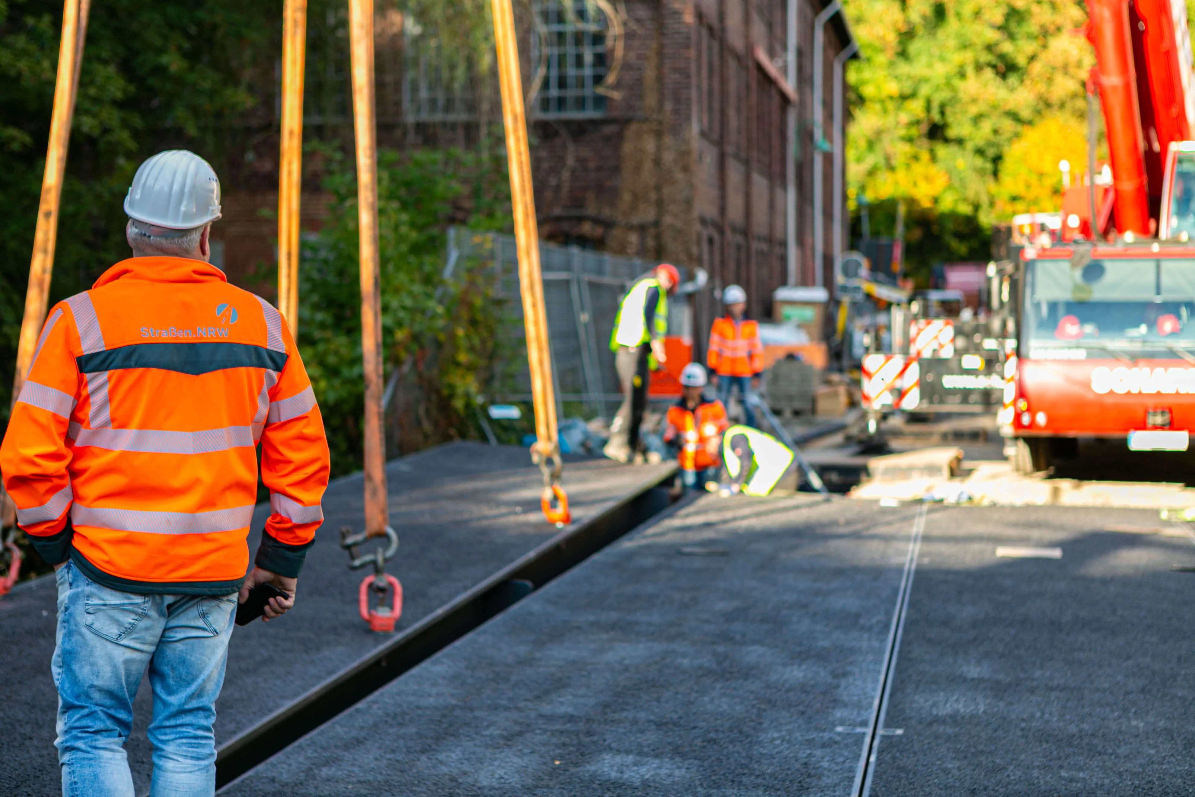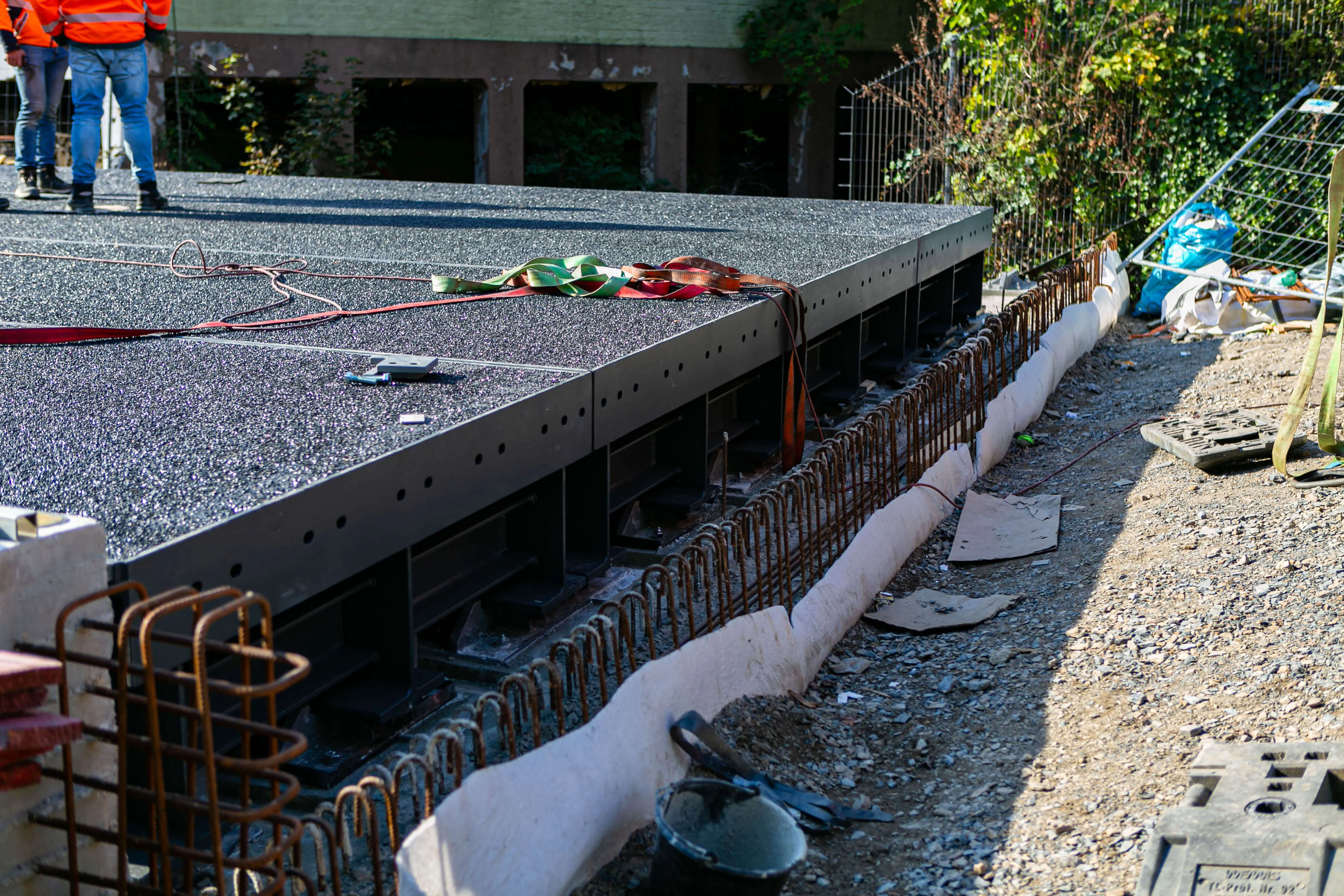 Dabei bestehen die rund 20 Tonnen schweren Elemente allesamt aus einem Rahmen aus Metall, auf den die metallene Fahrbahnplatte aufgeschweißt ist. Auf diese Platte ist die Deckschicht aufgebracht, auf der in wenigen Wochen Autos und Lkw fahren werden. Am Donnerstag, 2. Oktober, werden die Geländer an der Brücke angebracht, in den darauffolgenden Wochen, so erklärt Michael Schanzenberger, der bei Straßen.NRW für die Bauaufsicht zuständig ist, folgen die Restarbeiten. Diese umfassen vor allem den Übergang von der bisherigen Straße auf die Brücke sowie eine neue Deckschicht auf der B237 (Kölner Straße).