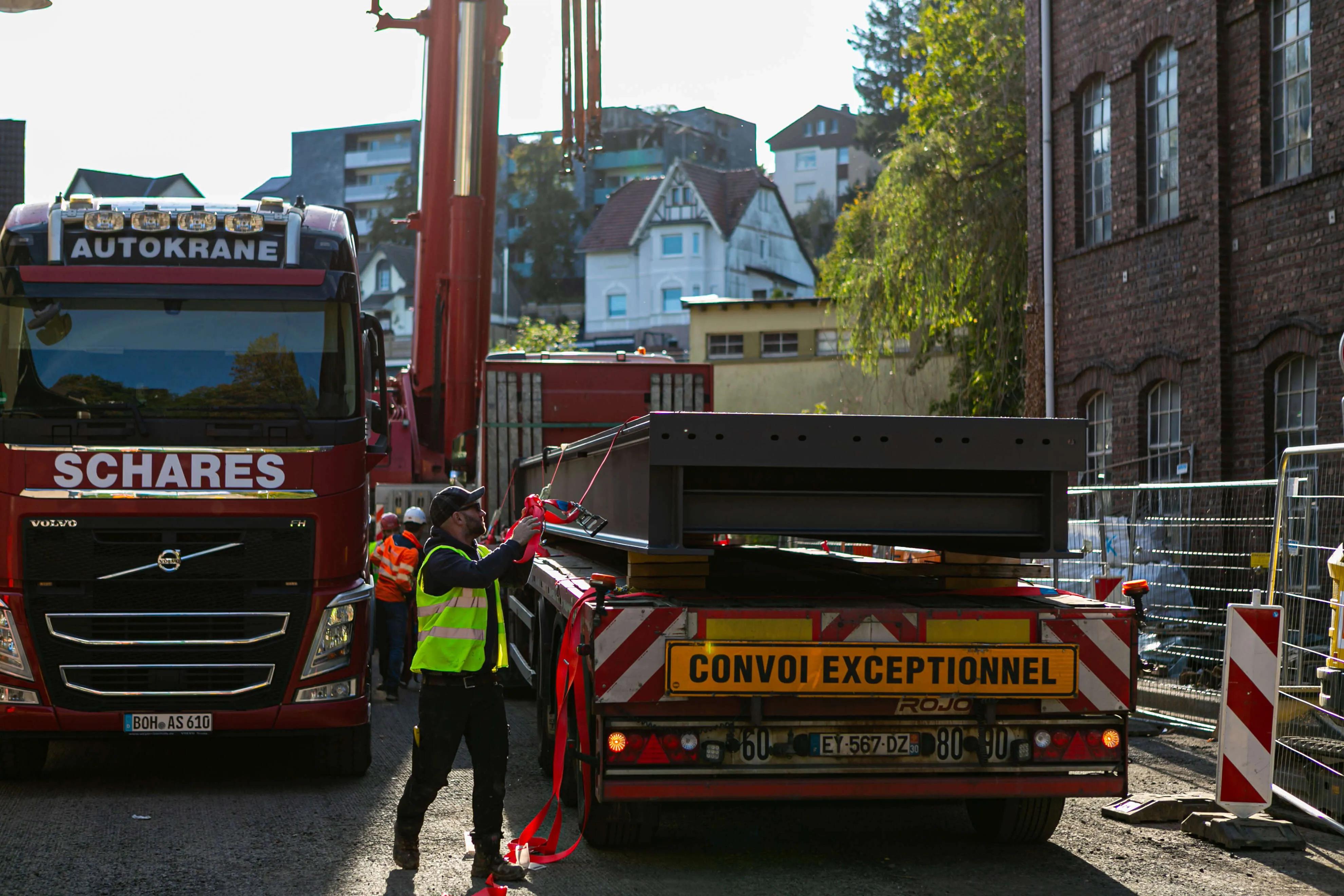 Die Behelfsbrücke wird aus fünf einzelnen Modulen, die im französischen Creil gefertigt und per Tieflader nach Deutschland gebracht wurden, zusammengesetzt. Gegen 10 Uhr in der Früh war das erste Element von einem großen Kran an seinen Bestimmungsort gehoben worden, kurz nach 17.30 Uhr war das letzte an seinem Platz.