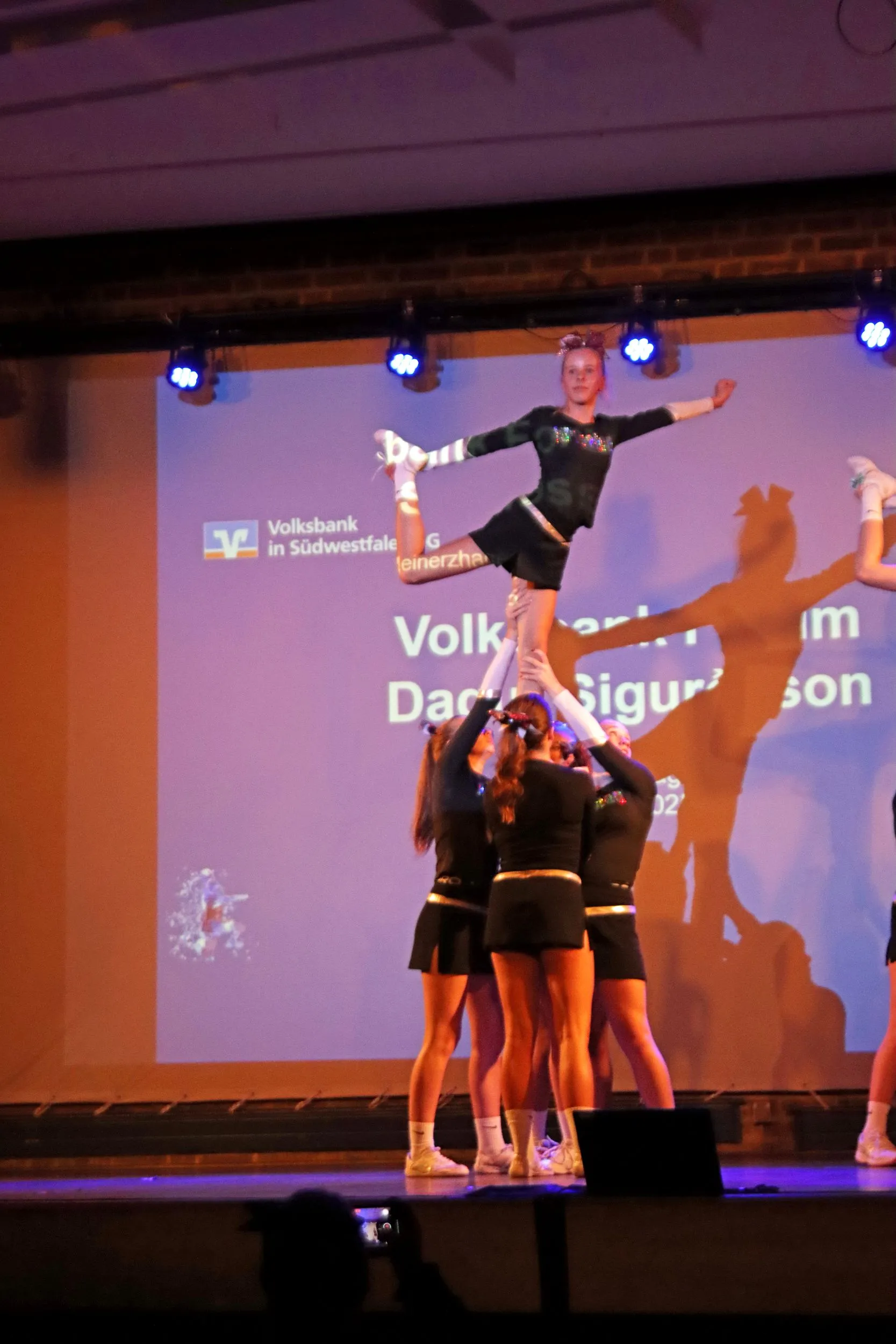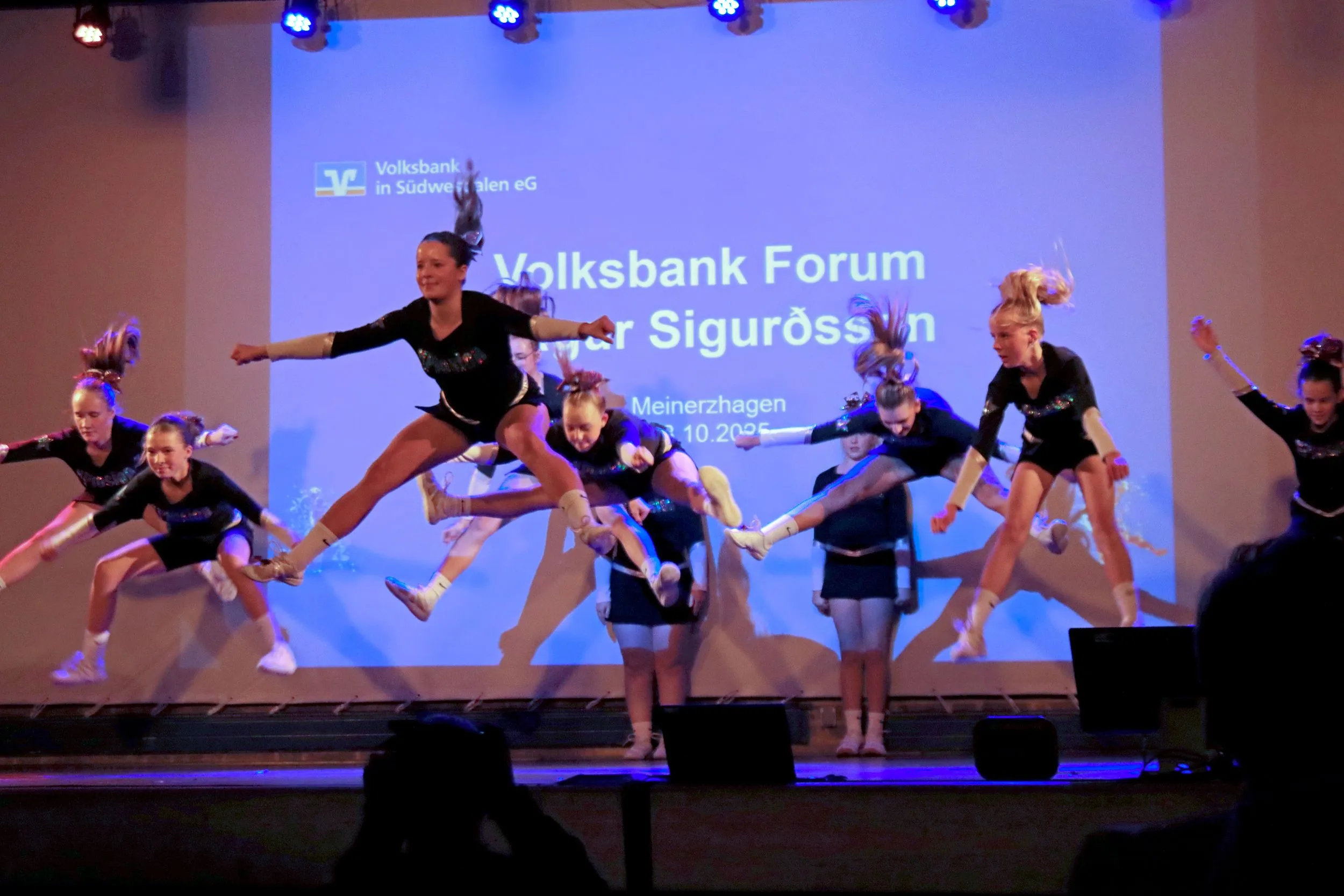 Mit der Einladung des Erfolgstrainers Dagur Sigurðssons hat die Volksbank ihren Gästen einen gleichermaßen informativen wie unterhaltsamen Abend geboten. Dabei sorgten die „Xplosions Cheerleader“ des Lüdenscheider Turnvereins für atemberaubende und beifallumrauschte artistische Einlagen. Im inoffiziellen Teil bot der Vortrag anschließend bei einem Imbiss in Kleingruppen reichlich Gesprächsstoff.